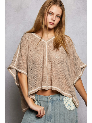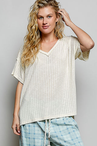 Short Sleeve V Neck Extended Back Hem Textured Knit Top, Black and Natural
