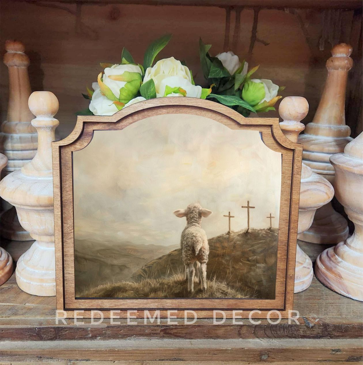 This unique framed art is hand made in Idaho. It measures 9 inches tall by 10 inches wide. The custom frame shape gives the piece a vintage look. The artwork is printed onto canvas using beautiful Canon pigment inks. The canvas is mounted onto a wood backer. The top frame is laser cut birch wood stained in a neutral Early American tone. The entire piece is lightweight and easy to hang with an adhesive strip. (not included) You can also lean this artwork against a wall or other decor item to display it on a shelf or tabletop. It could also be displayed on an easel.