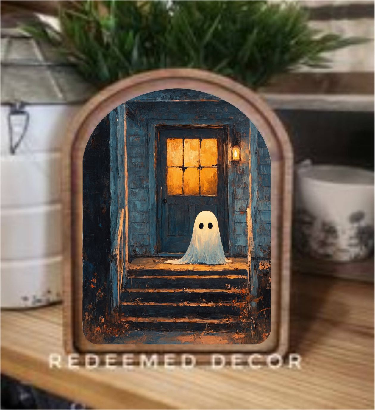 Features a ghost on a front porch—cute, cozy, and just spooky enough