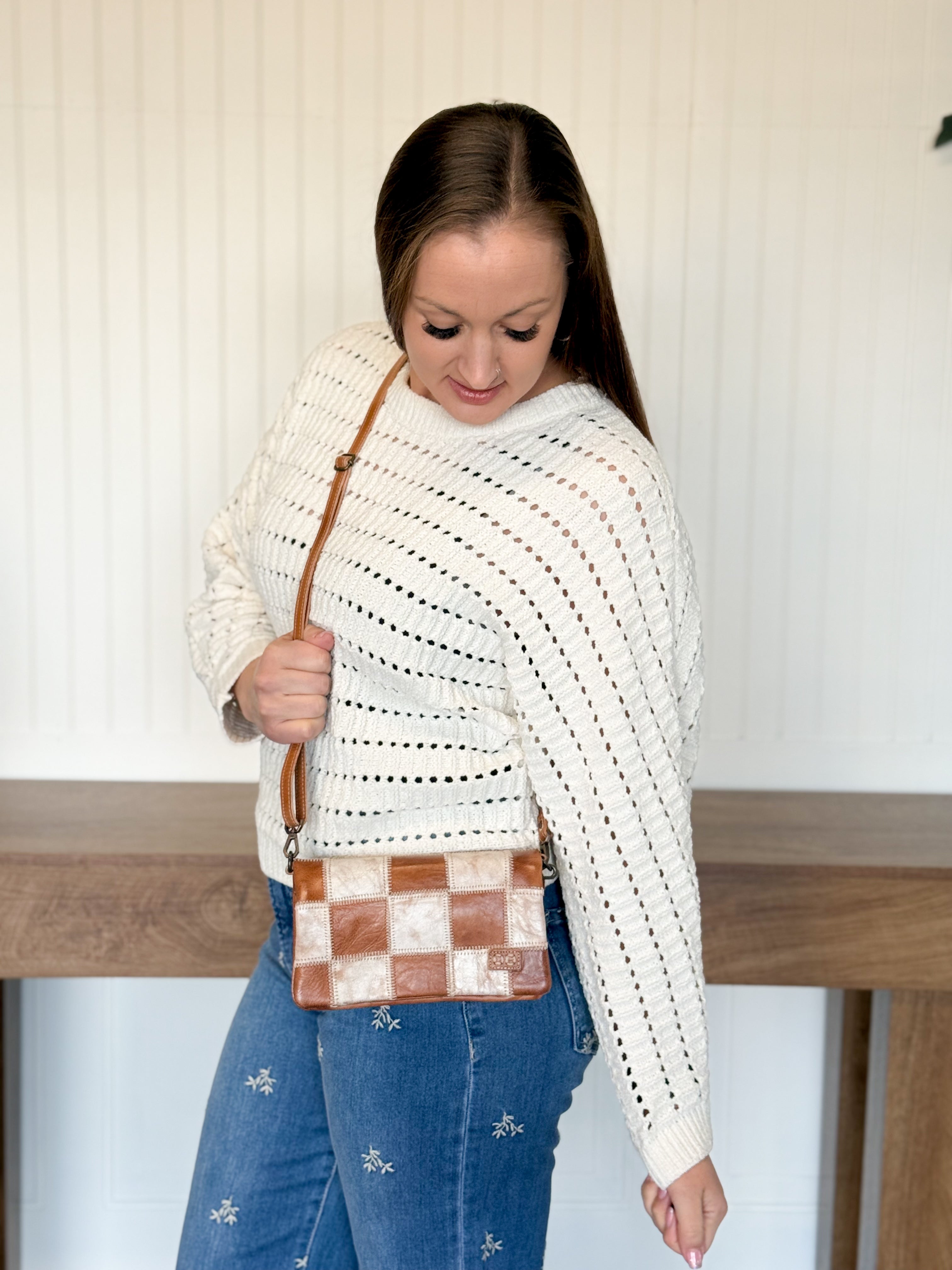 Cadence PW is a versatile leather essential crafted in a rich, lived-in finish. Designed to move with you, it shifts easily from wallet to clutch to crossbody with two removable straps. The patchwork design makes this bag unique and epitome of handcrafted. A secure exterior pocket and organized interior with zippered compartments and card slots keep everything in place, while the sleek magnetic closure adds a refined touch—perfect for travel, evenings out, or everyday errands.