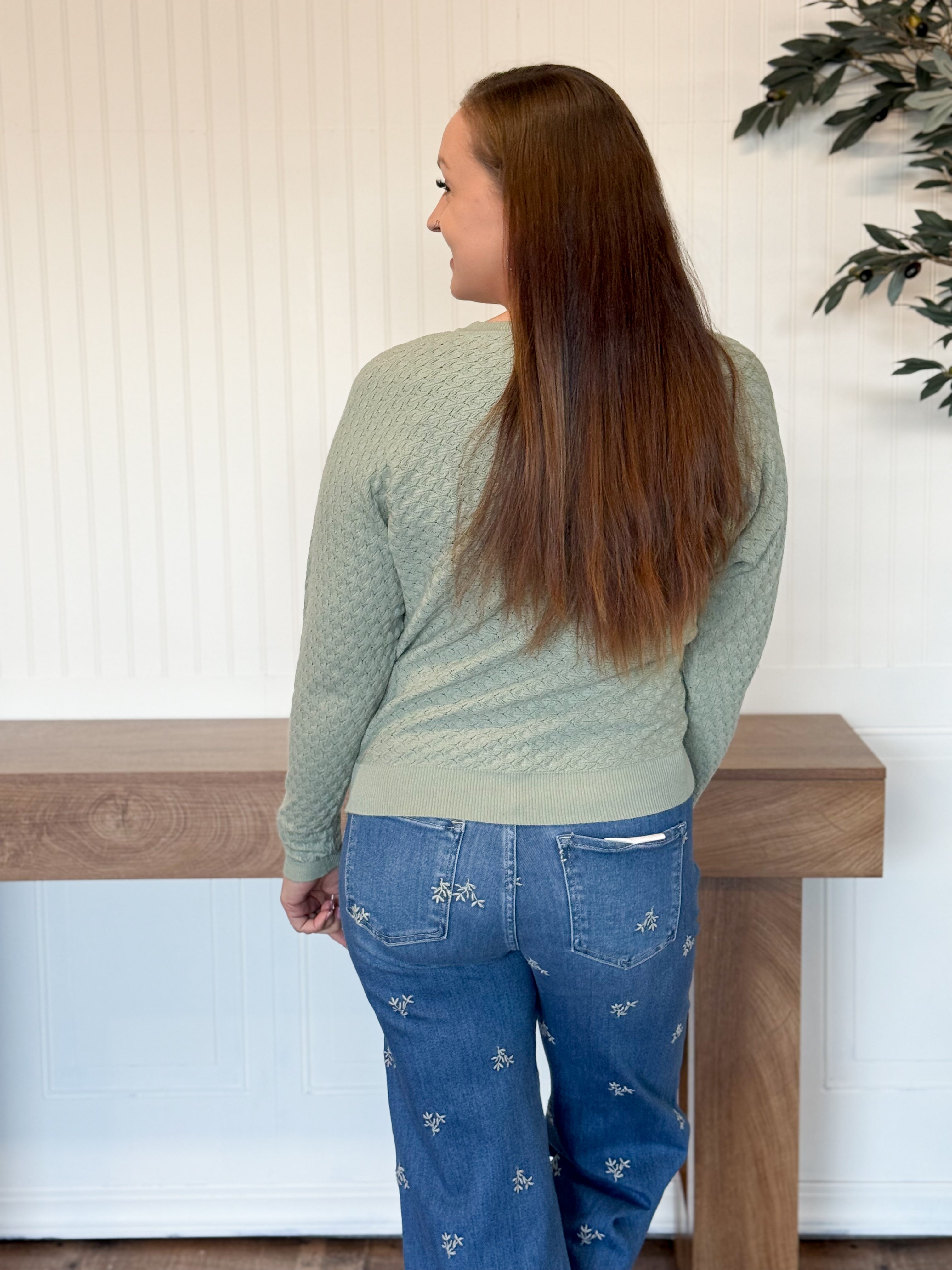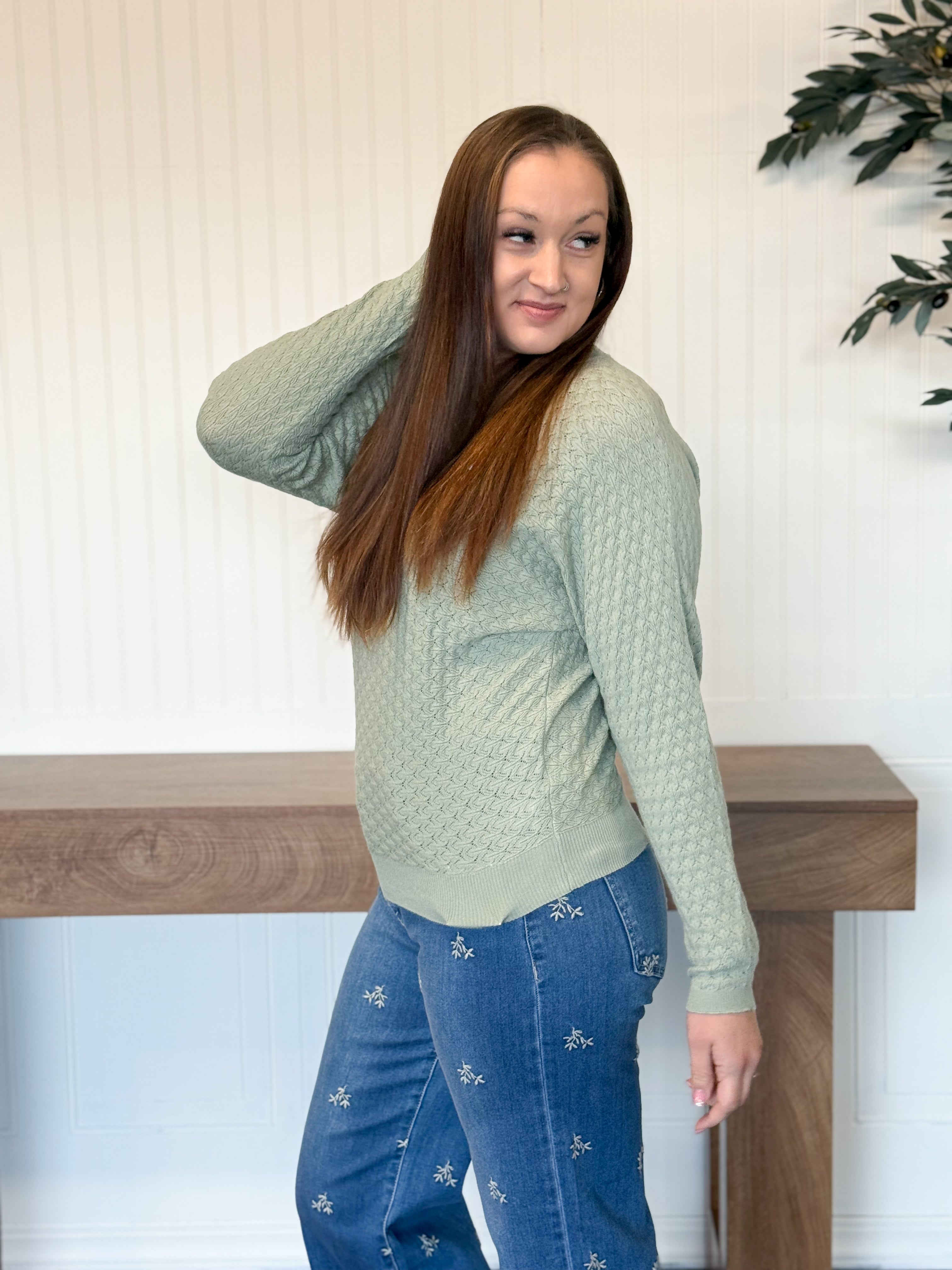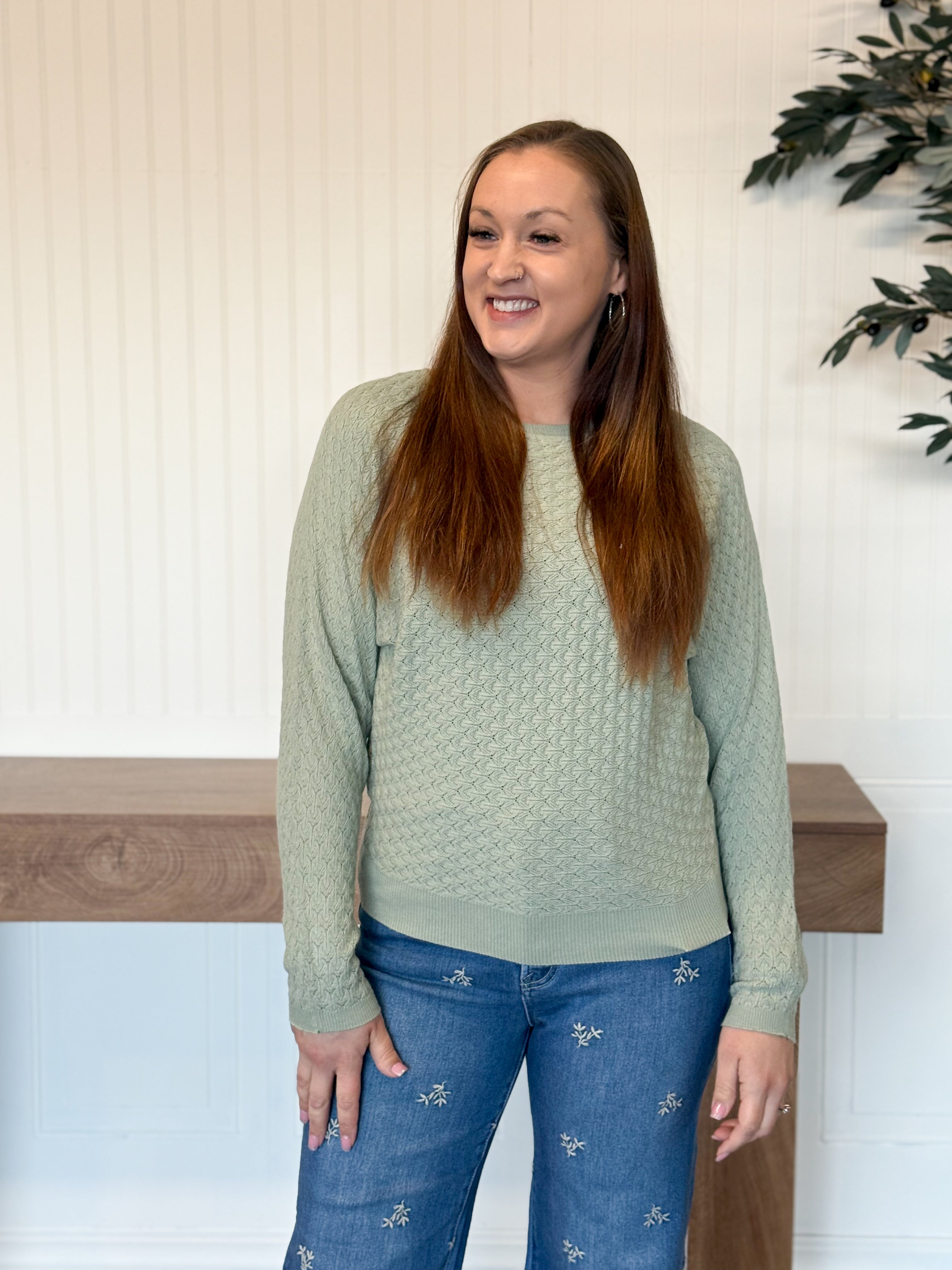 This is one of those easy, polished knits that makes you look put-together without feeling fussy. The fine gauge pointelle gives it that pretty texture (but it still feels lightweight), so it’s perfect for cool mornings, office AC, and layering into spring.
