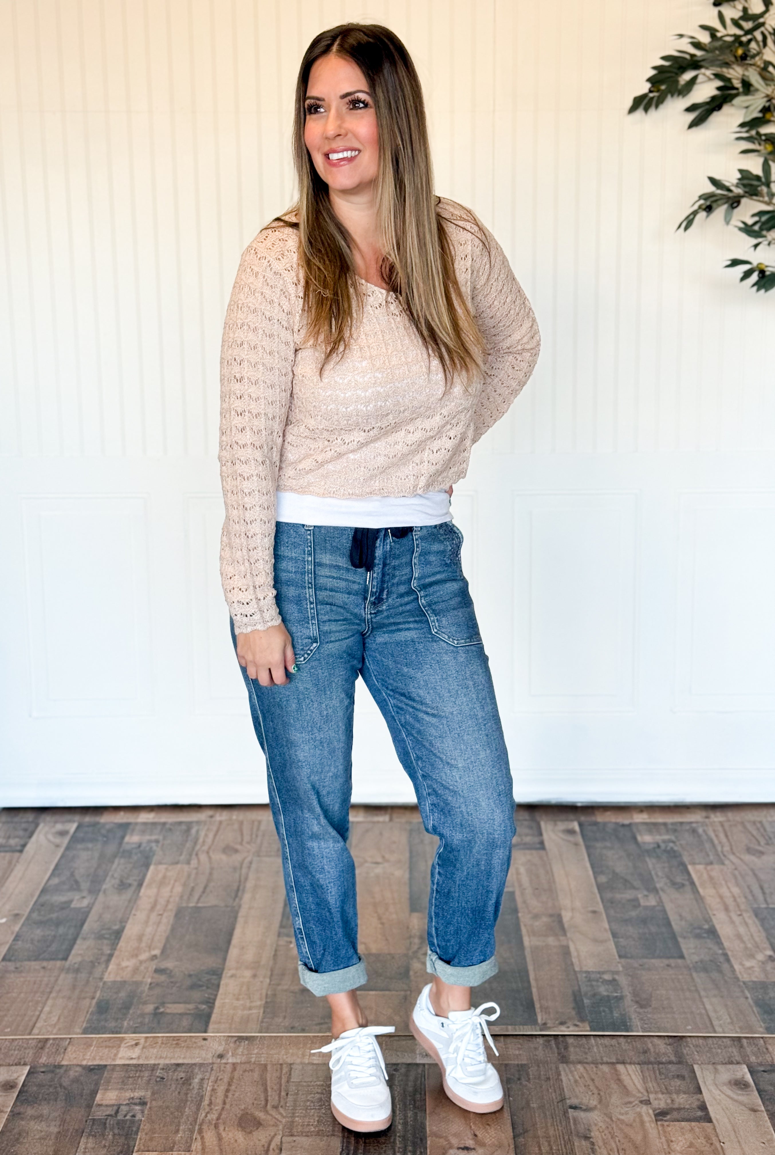 This sweater is one of those “easy pretty” pieces that makes any outfit feel a little more elevated. The pointelle knit has that delicate, crochet-like texture that looks boutique and feminine, and the scallop hem is such a sweet finishing touch. It’s simple, but in a really special way—perfect when you want to look put together without doing the most.