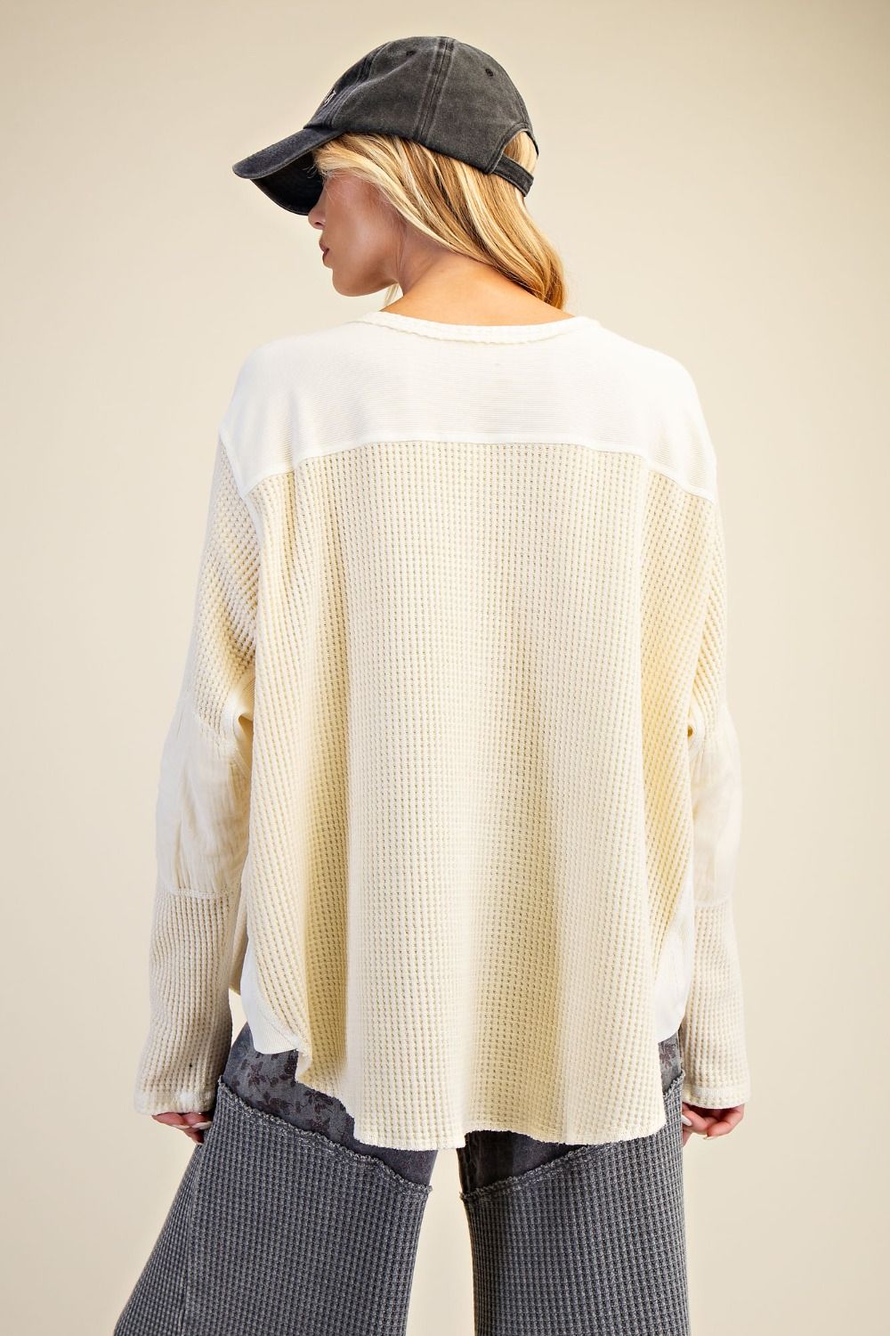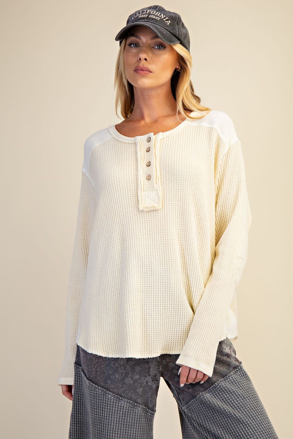 Elevate your everyday "off-duty" look with our Oversized Washed Waffle Knit Henley Top. This isn't just a basic thermal; it’s a masterclass in effortless style. Featuring a vintage-inspired washed finish and a relaxed silhouette, this top offers a cozy, lived-in feel from the very first wear. The classic front button placket and raw edge detailing add a touch of edgy, farmhouse-chic character. Crafted from a premium 95% cotton blend, it provides the perfect amount of breathable warmth and stretch for all-day comfort. Whether you're layering for a hike or lounging on a Sunday morning, this relaxed waffle knit is your new wardrobe essential.