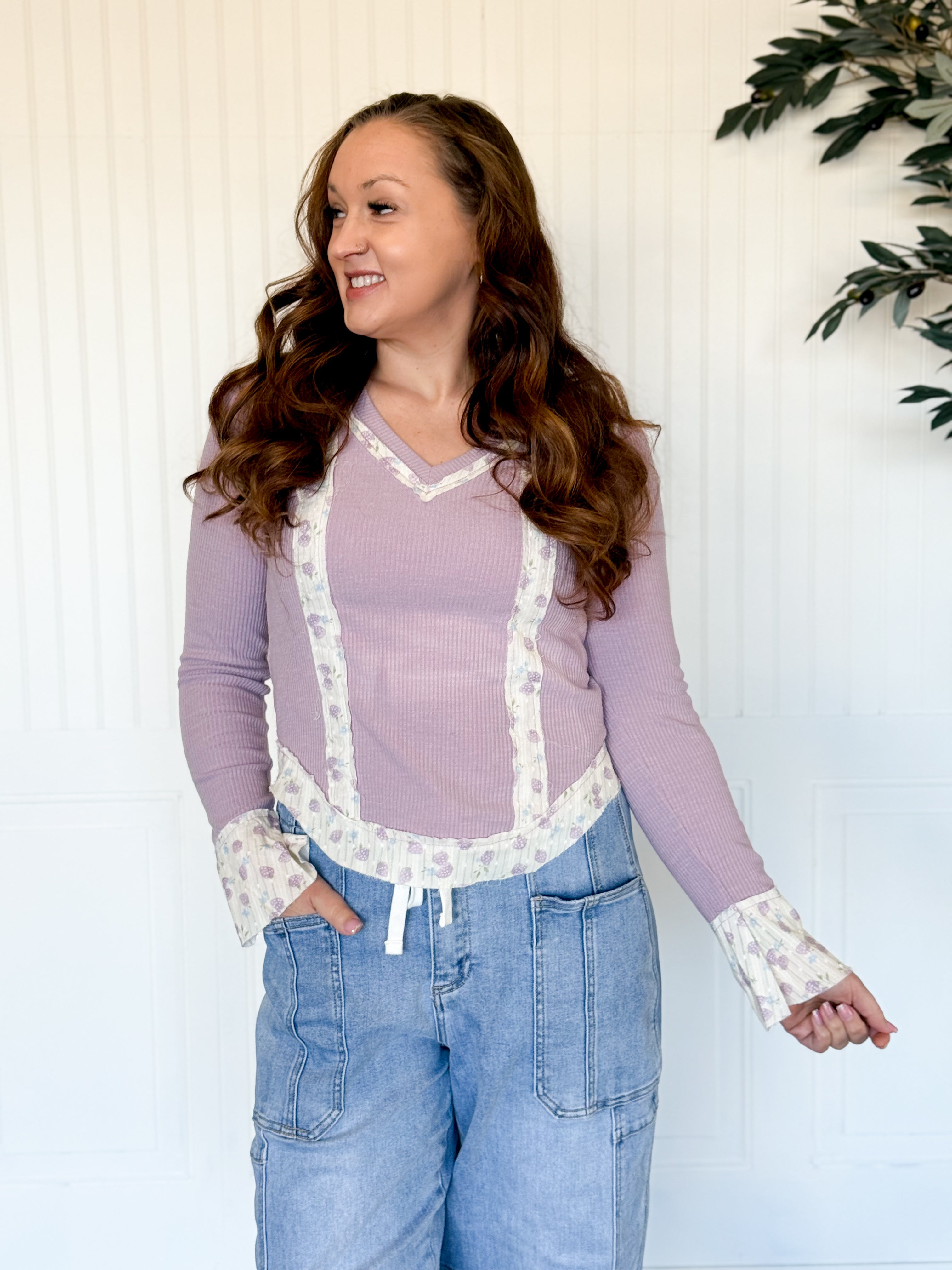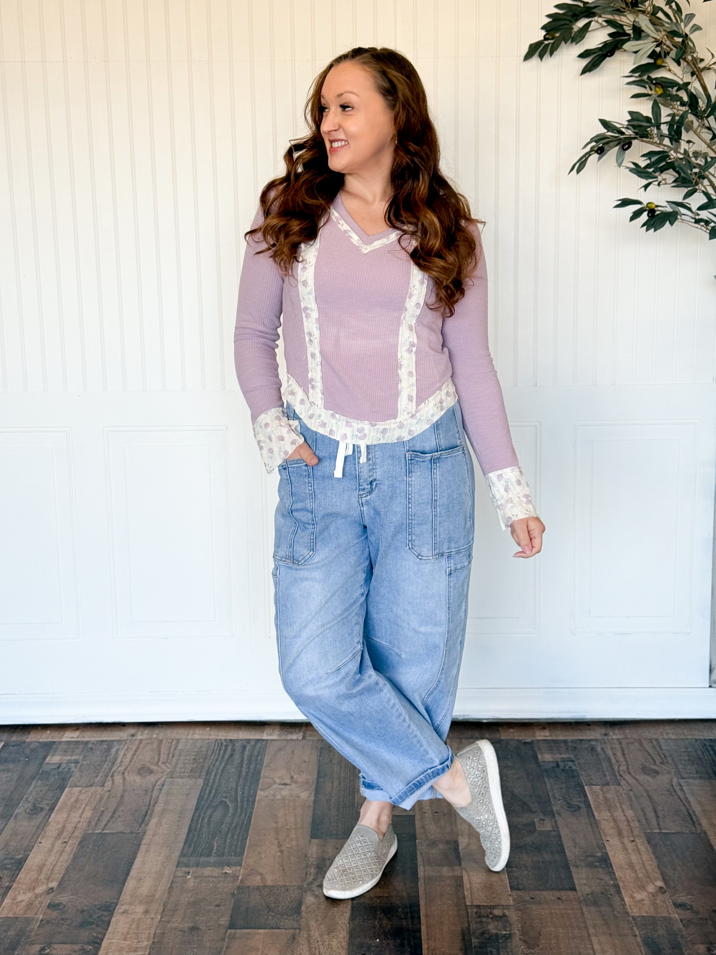 This Lavender Heirloom Ruffle Rib Top is one of those “instant outfit” pieces that feels special the second you put it on. The vintage wash gives it that perfectly lived-in look, and the little ruffle sleeve detail is such a sweet touch without being too much. It’s comfy, flattering, and has those boutique details that make people ask, “okay where did you get that?”
