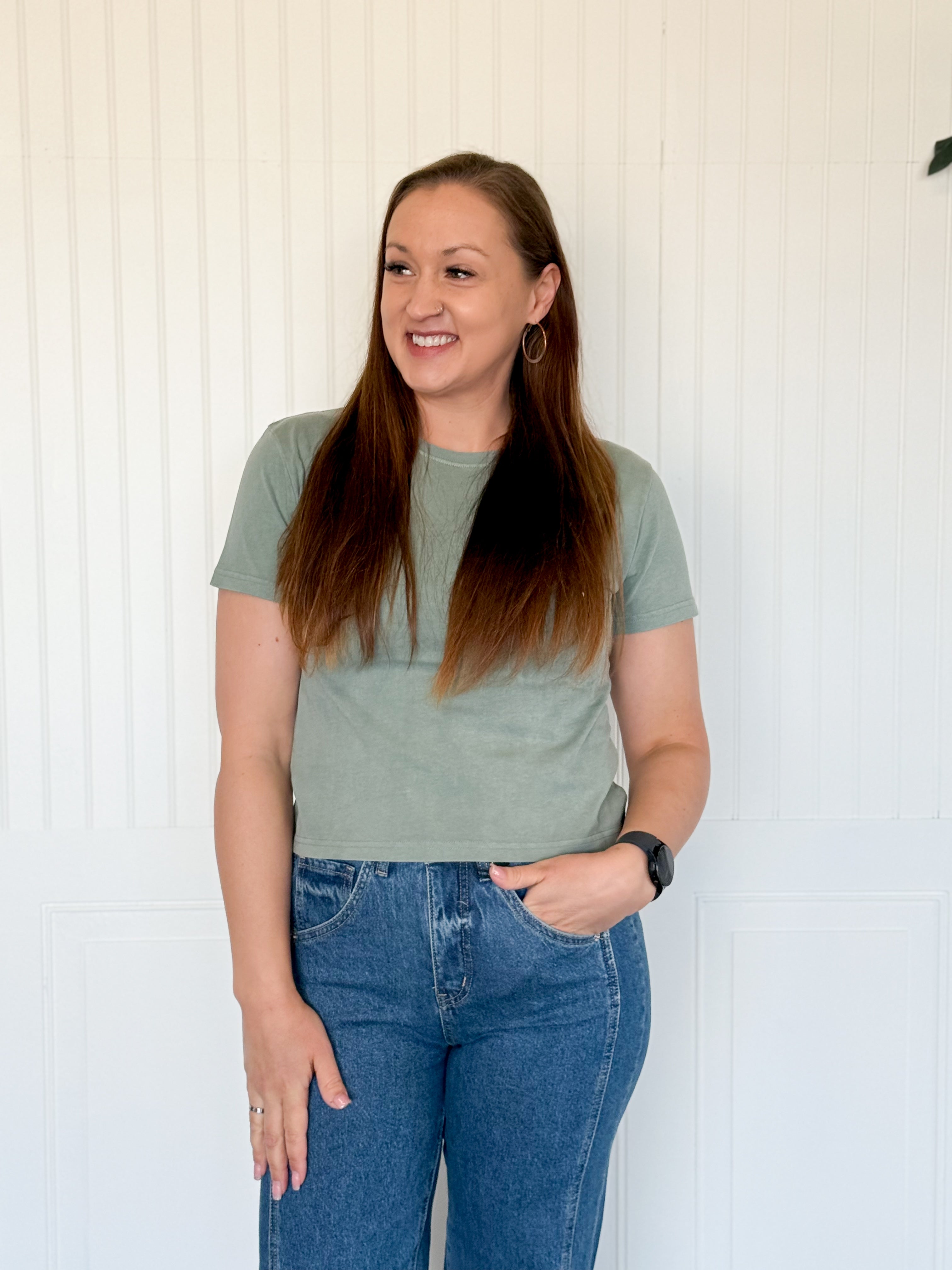 Soft, breathable cotton with that broken-in mineral-wash feel. Standard fit through the body with a crop that hits right at the waistline—easy, flattering, and not clingy.