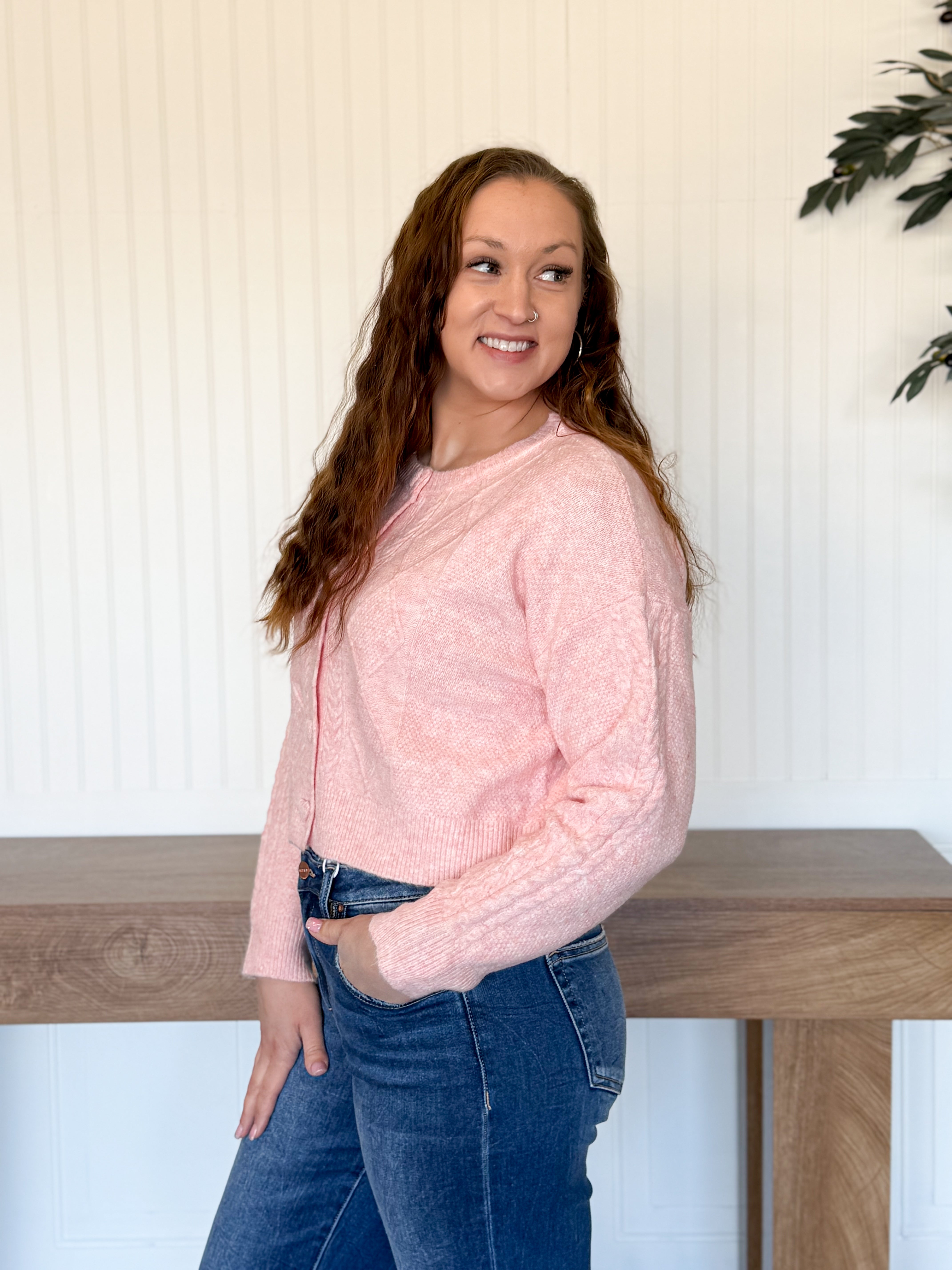 This cardigan feels like something you’d treasure for years — cozy, sweet, and full of thoughtful little details. The classic diamond cable knit gives it that timeless look, while the heart-shaped buttons add just the right touch of charm. With a slightly cropped fit and ribbed trim, it layers beautifully over dresses, tanks, or tees without feeling bulky. Soft, comfortable, and easy to wear, it’s one of those pieces that instantly makes an outfit feel special.