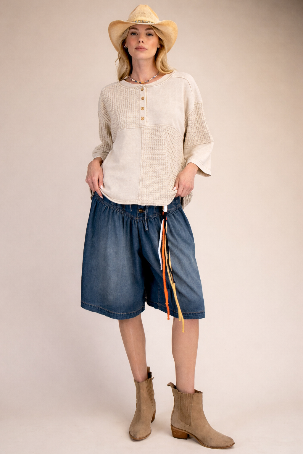 Crafted in a soft waffle knit blend, this top feels breathable, lightweight, and comfortable against the skin. The mineral wash enhances its softness while giving it a slightly vintage-inspired finish.