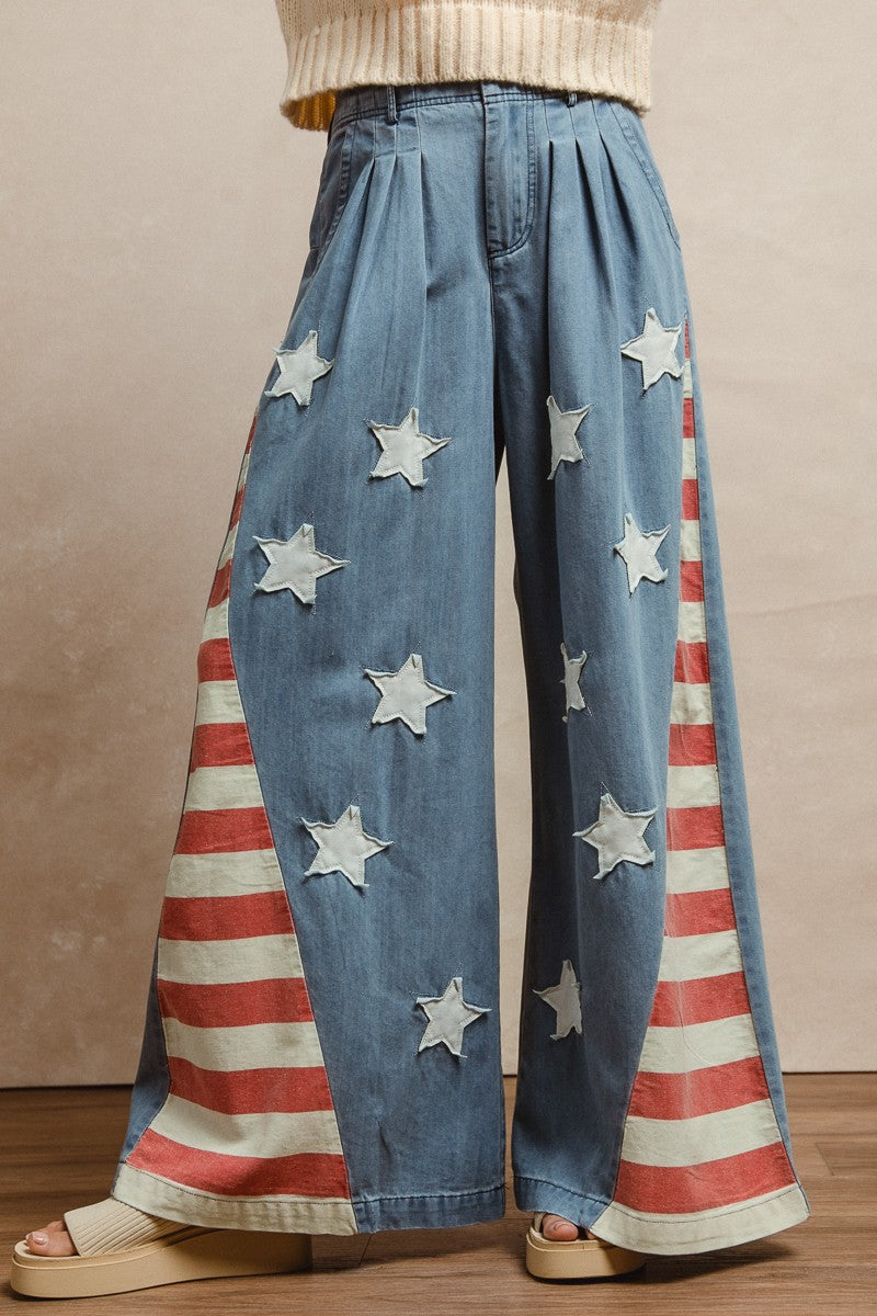 Effortlessly patriotic with a vintage twist, these wide-leg chambray pants feature American flag-inspired star patches for a playful yet stylish statement. The vintage wash adds character and a worn-in charm, making them feel like a favorite go-to pair from the moment you slip them on. Perfect for casual weekends, summer festivities, or holiday celebrations, they’re a versatile piece that combines comfort, style, and personality in one.