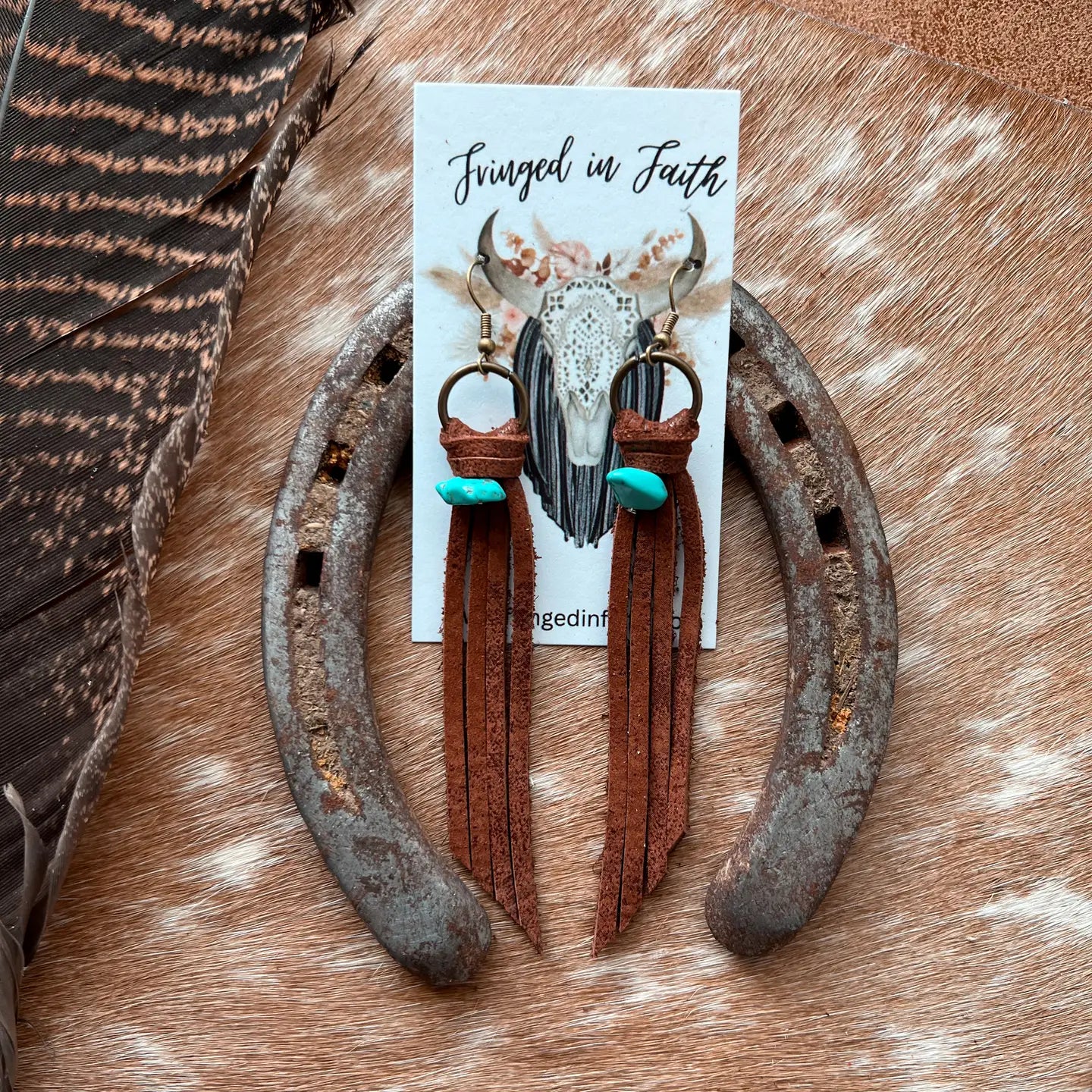 Our best selling Darby tassels now come in mini size! Perfect for those who like smaller earrings. They go great with any occasion; date night, summer concert or rodeo! **Earrings may vary slightly from the photo** Materials: Genuine Leather Faux turquoise bead Lightweight Earrings hang from lead and nickel free, silver hoops Size: 4” L