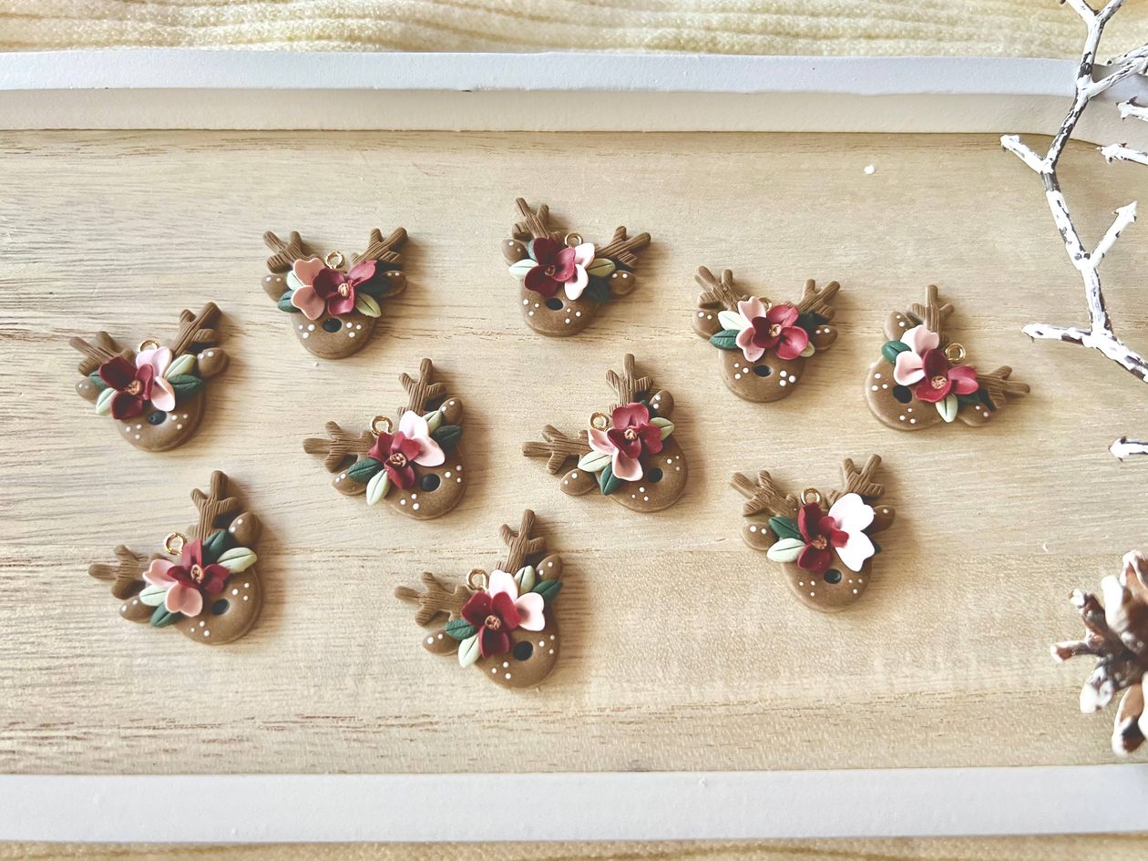 - Handmade polymer clay earrings in a reindeer design with floral crowns