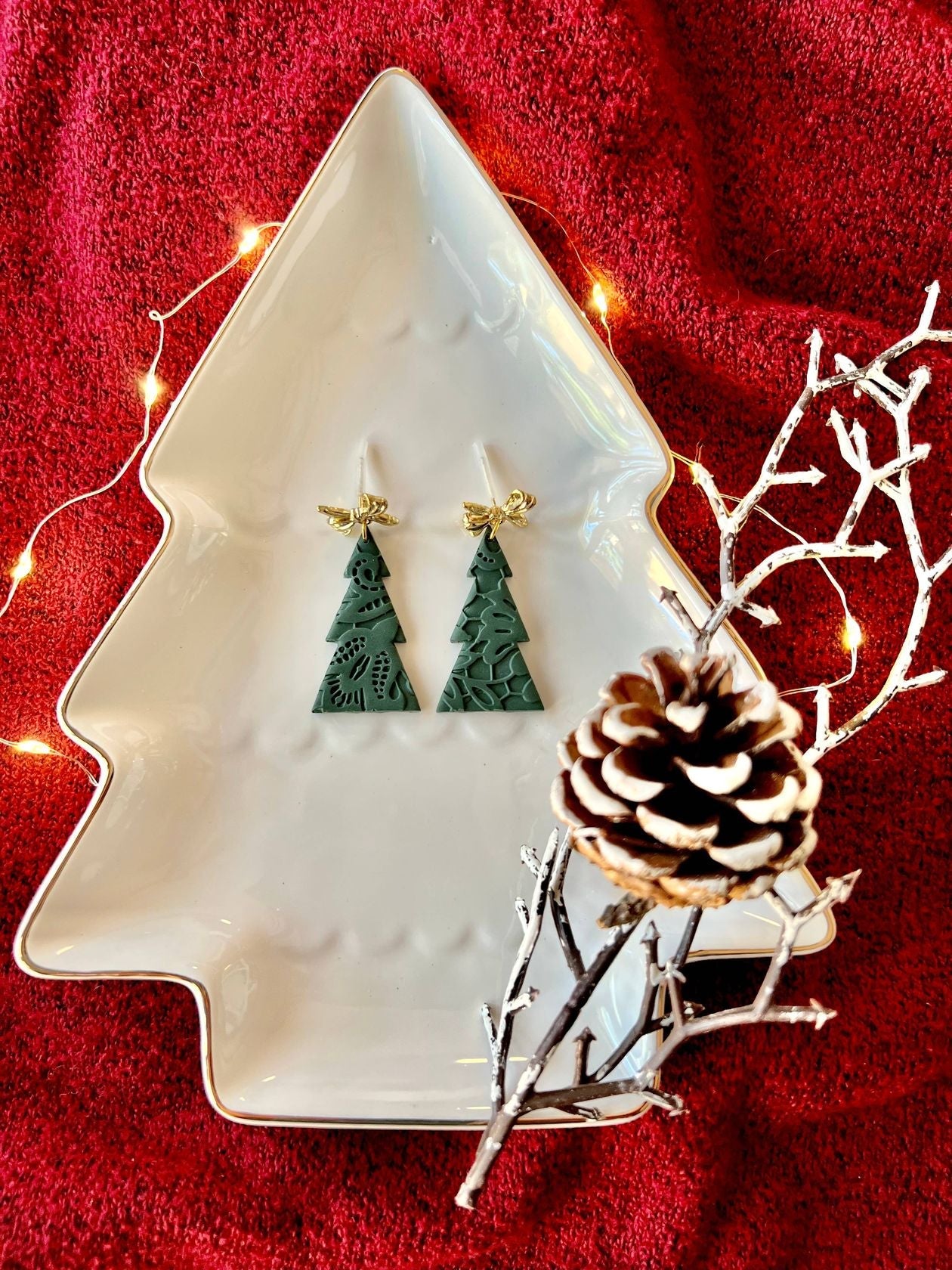 The Lace Pine Clay Earrings bring an elegant twist to festive holiday style. Handmade from lightweight polymer clay, these Christmas tree earrings feature a delicate lace-inspired pattern pressed into the surface for beautiful texture and detail. Finished with a dainty alloy bow top and stainless steel ear pin, they’re a unique mix of playful and chic—perfect for celebrating the season in style.