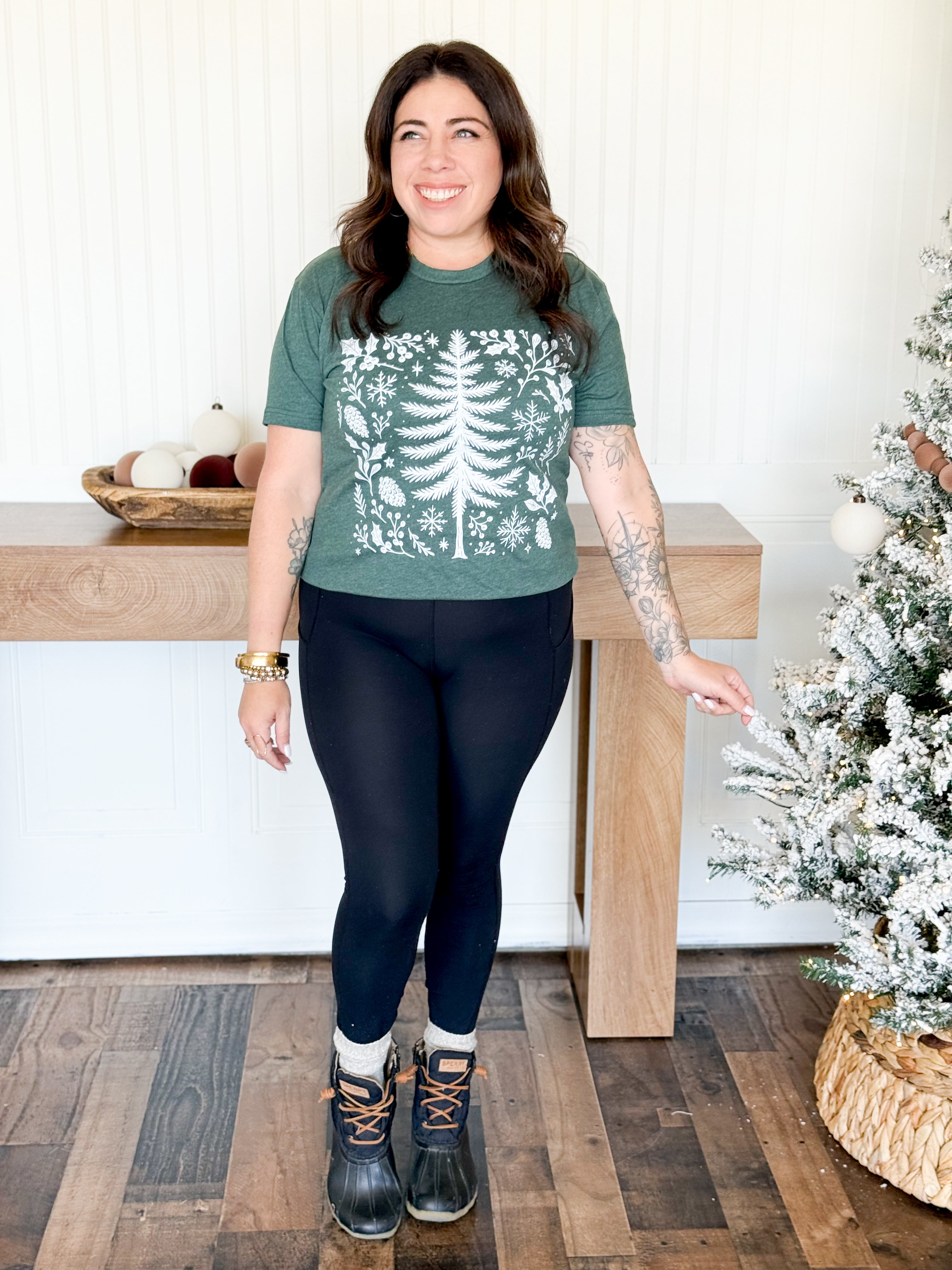 Festive, elegant, and beautifully detailed — the Evergreen Christmas Tee captures the warmth and wonder of the season. Screen printed in-house on a soft Next Level tee, this design features a stunning Christmas tree surrounded by delicate branches and leaves, giving it a timeless, nature-inspired charm. It’s the perfect mix of comfort and holiday spirit — easy to dress up with a cardigan or wear casually for cozy days at home.