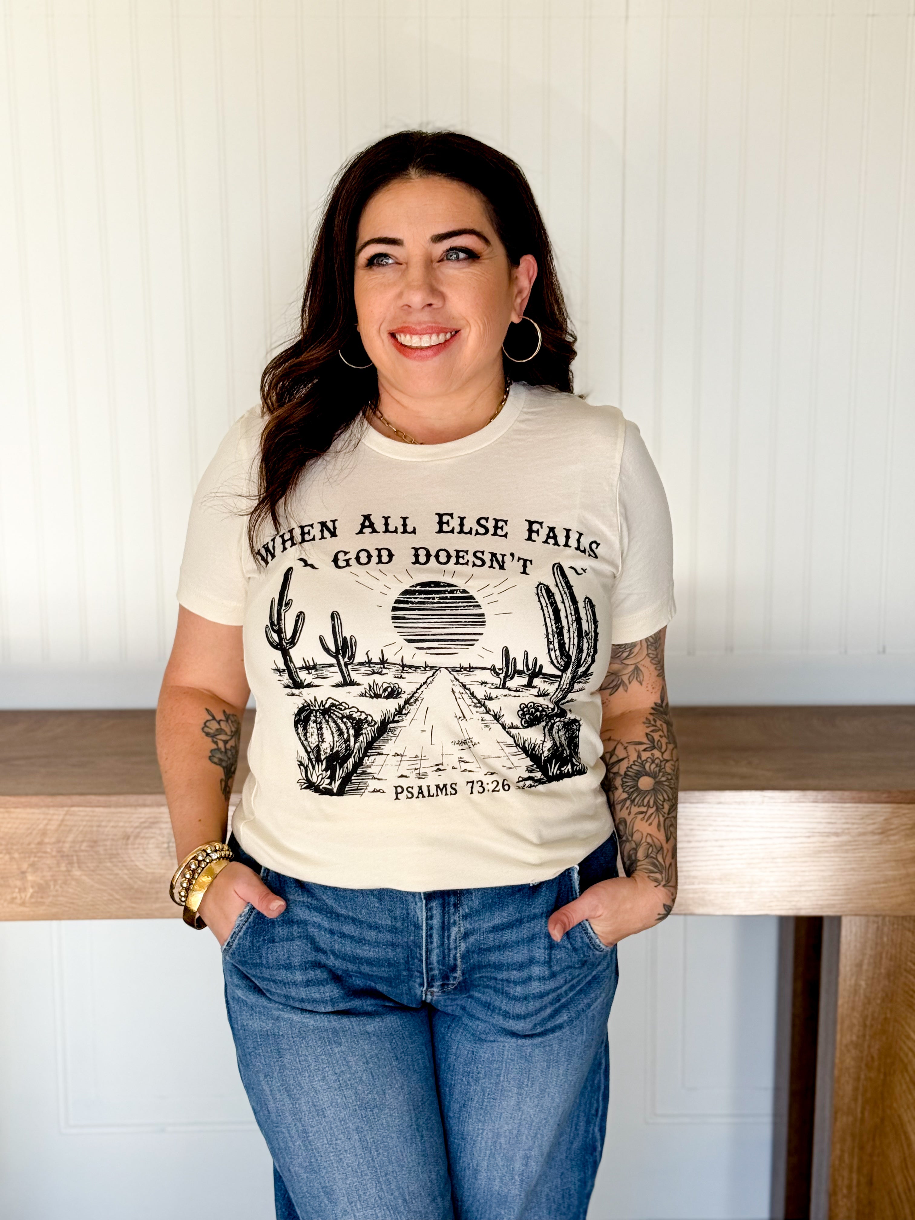This tee is a quiet reminder for the hard days — the kind of message that meets you right where you are. Featuring a peaceful desert scene paired with the words “When all else fails, God doesn’t,” it speaks truth in a calm, steady way. Thoughtful, meaningful, and easy to wear, it’s a piece you’ll reach for when you want comfort in more ways than one.