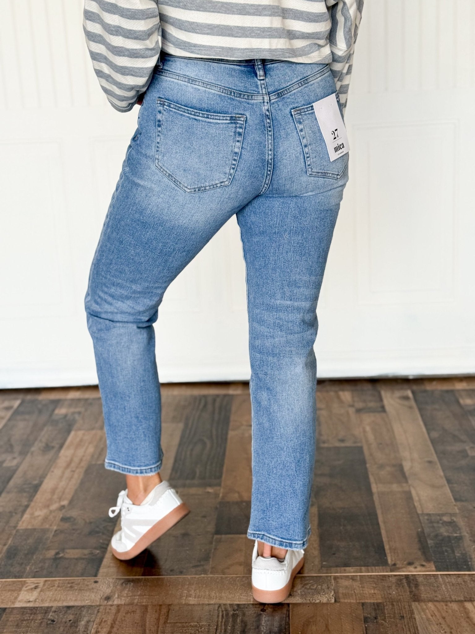 Experience effortless California cool with the High Rise 90s Jean from Mica Denim. Designed to flatter your waist with a timeless high-rise silhouette, these jeans blend vintage inspiration with modern comfort. Crafted from a soft stretch cotton blend, they mold to your body while maintaining shape, making them a wardrobe essential you’ll reach for season after season. Like the shimmering mica mineral, these jeans let your style sparkle.