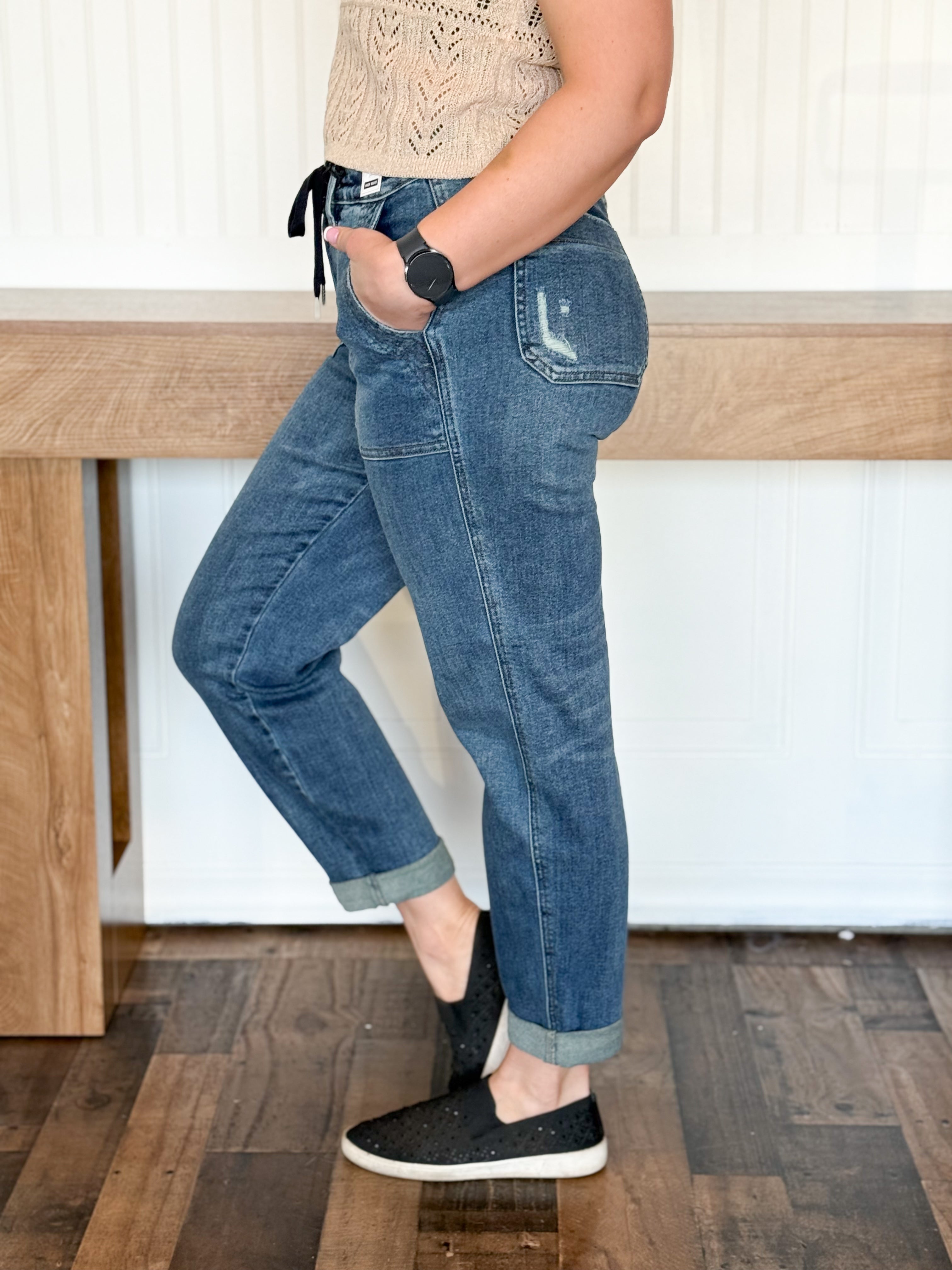 They’ve got that comfy, lived-in dark wash that already feels broken-in, plus the jogger leg that gives you that relaxed, effortless look without ever looking sloppy. The high rise smooths everything out (bless), the stretch is that signature Judy Blue magic, and the fit… honestly, it’s like they were made for busy days where you still want to feel cute.
