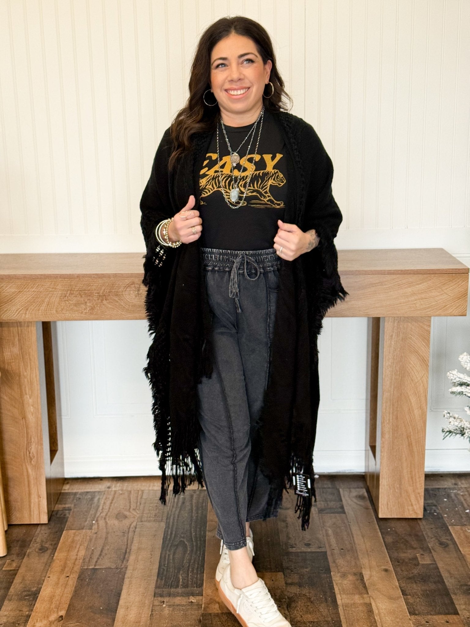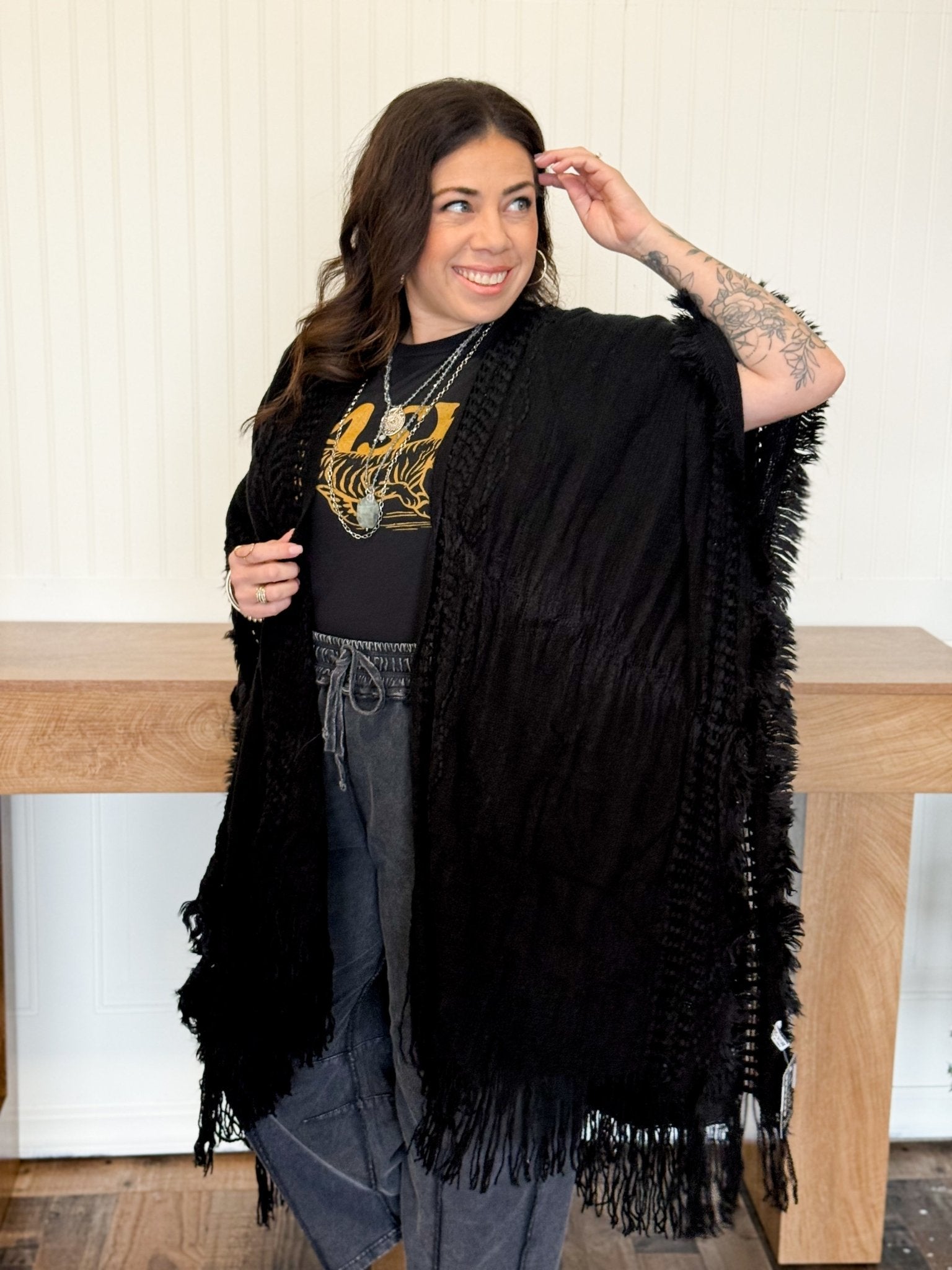 This is the kind of throw-on layer that makes you feel instantly a little more styled, even if you’re in a basic tee and leggings. The open work texture gives it that breezy, boho look, and the frayed border adds the perfect lived-in detail — like something you found at a cute little boutique on a weekend trip and never stopped wearing.