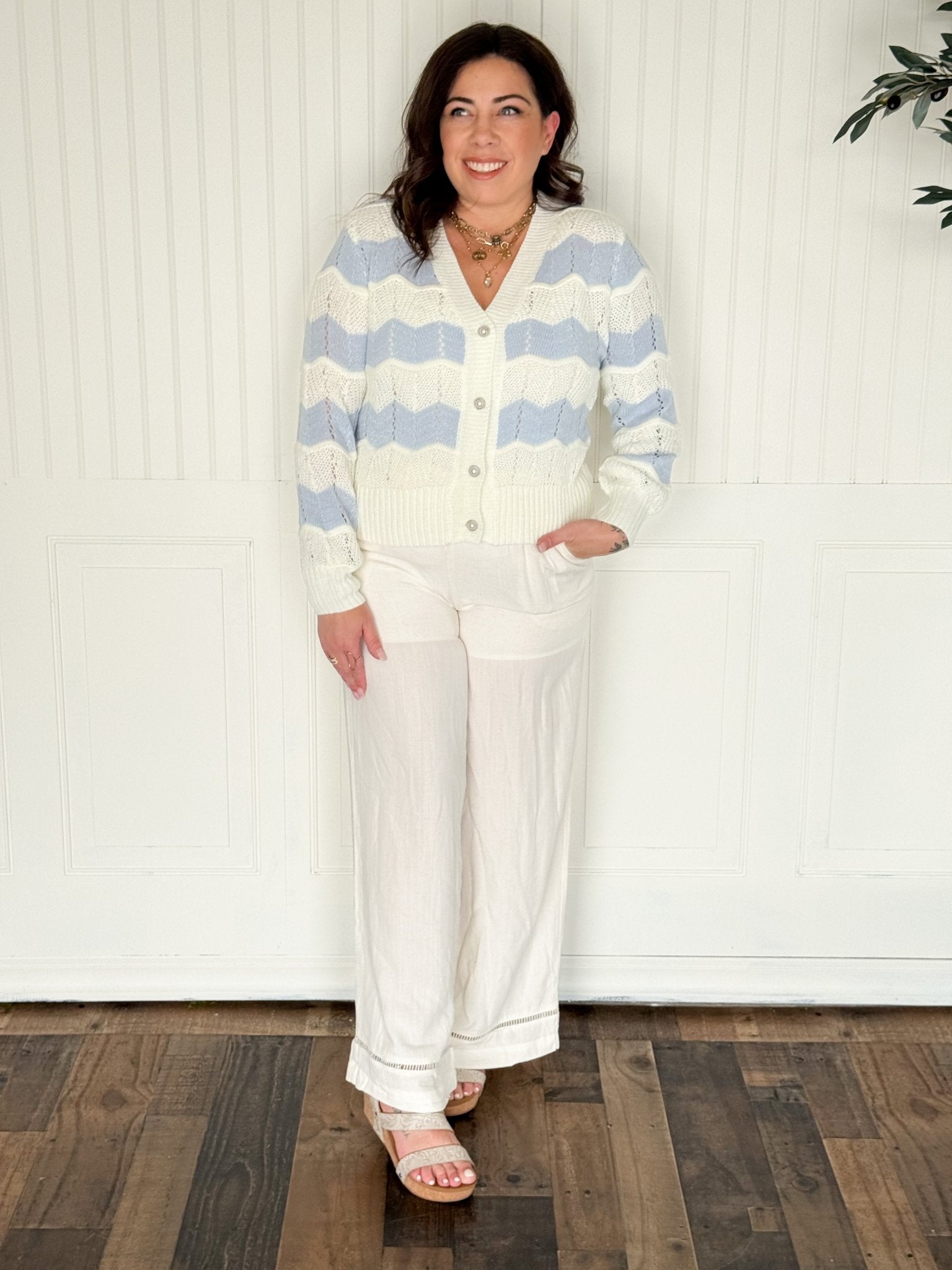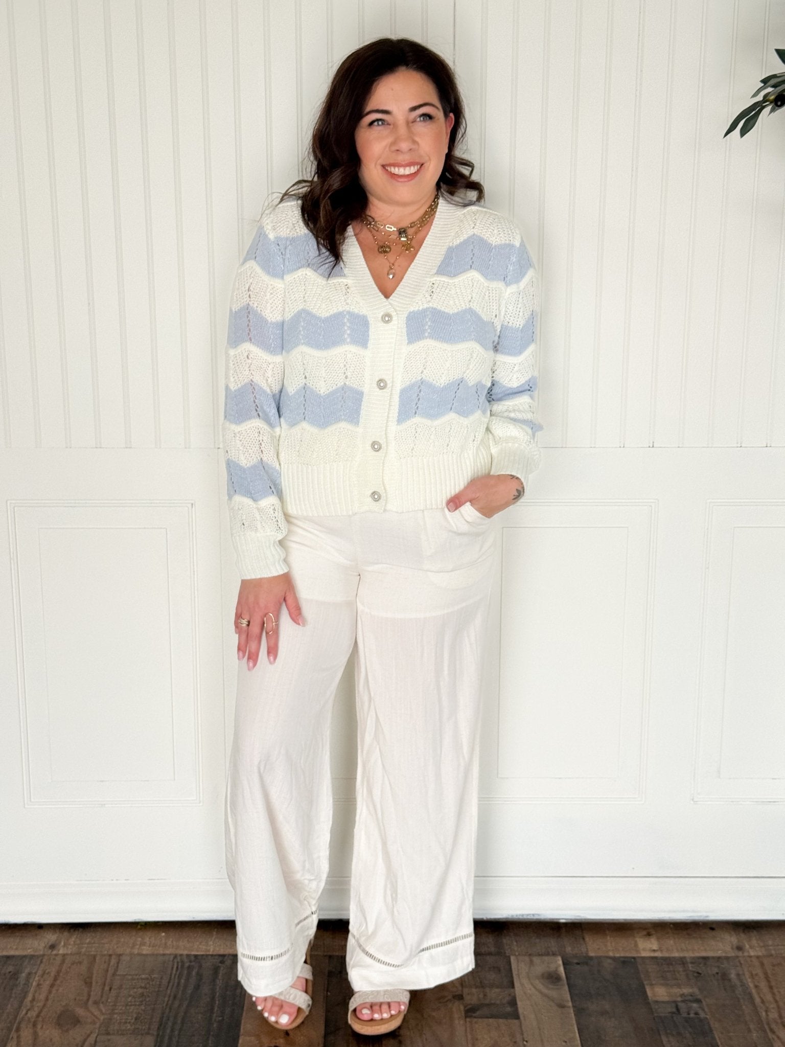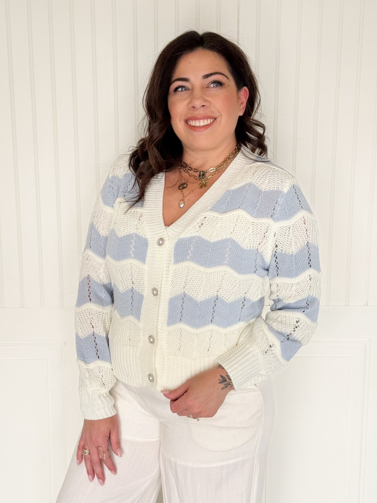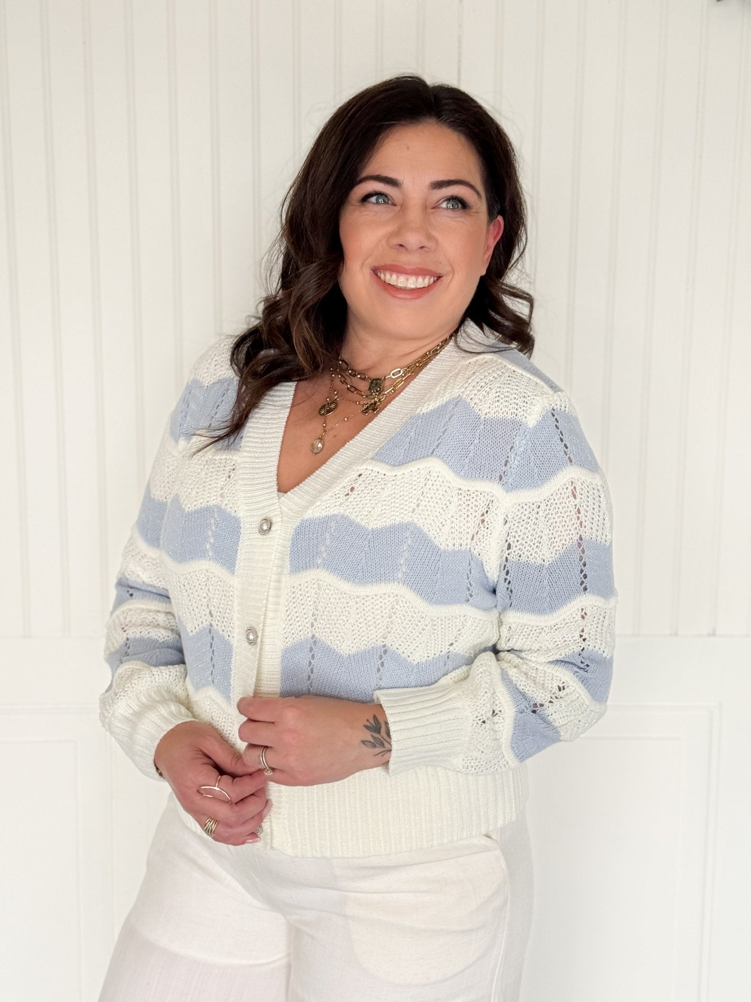 Classic stripes meet cozy texture in this Button-Up Front V-Neck Cardigan Sweater. Designed with a textured knit and timeless striped pattern, this piece brings effortless style to your everyday wardrobe.