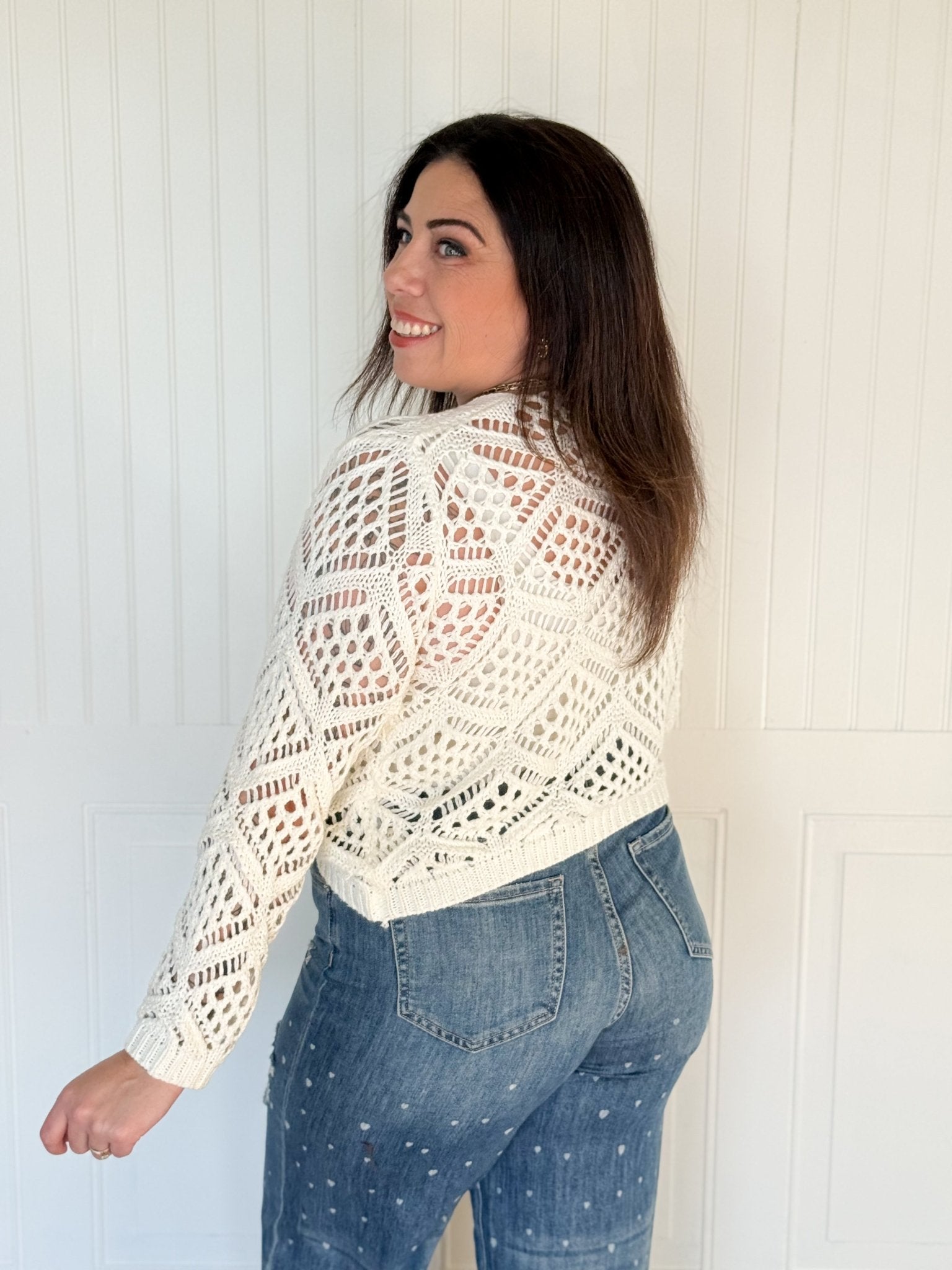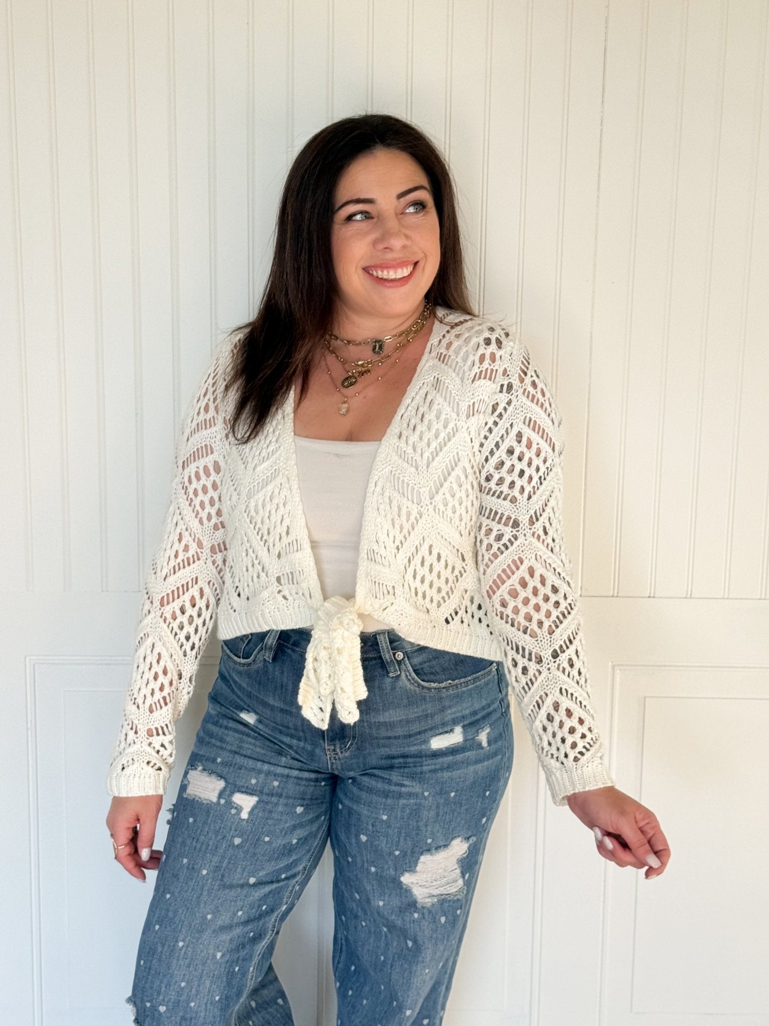 The self-tie front adds a touch of versatility and feminine charm, while the long sleeves balance the airy design for a flattering, laid-back feel. Whether you're beach-bound or brunch-ready, this piece instantly elevates any outfit with texture and dimension.