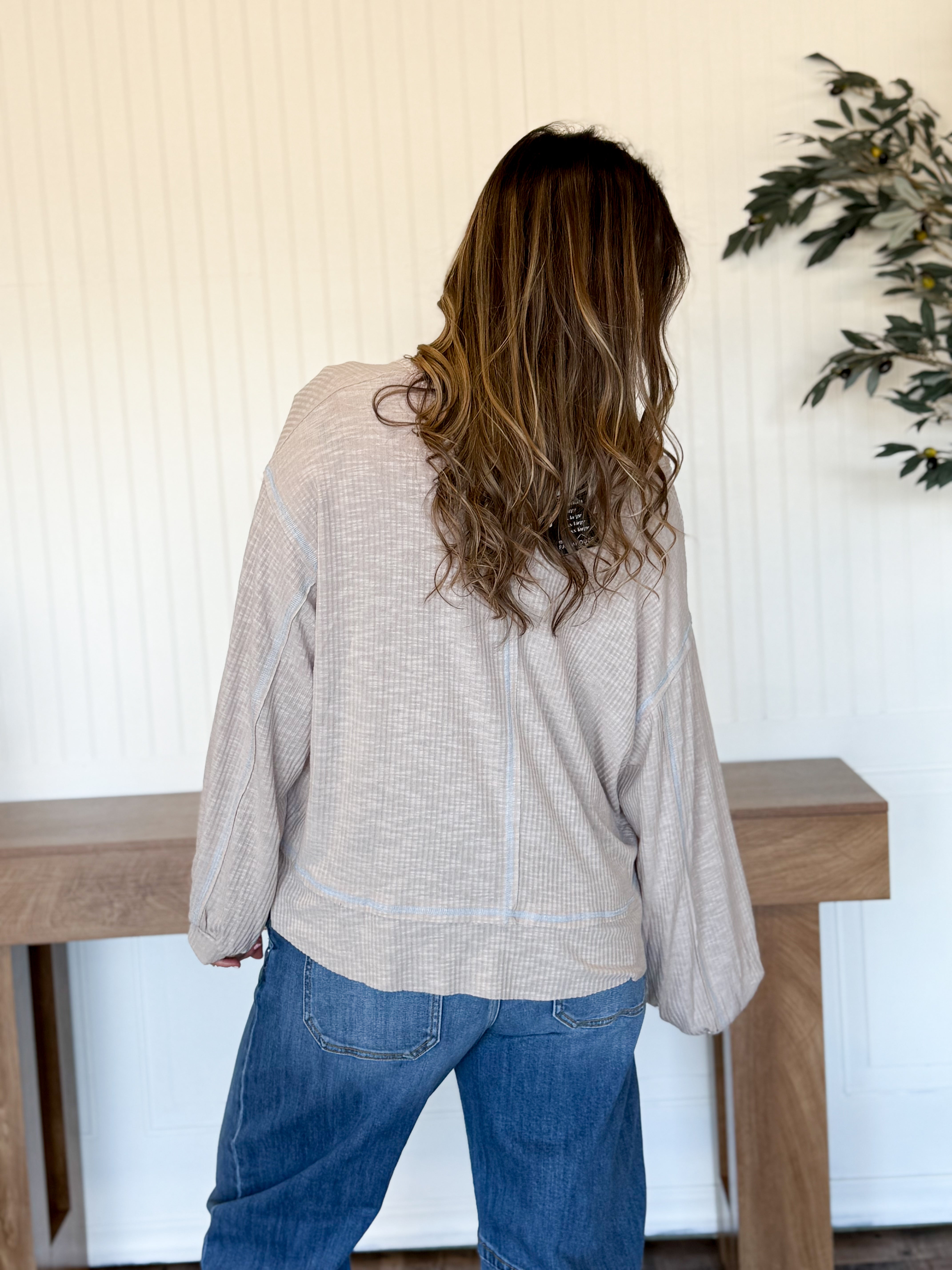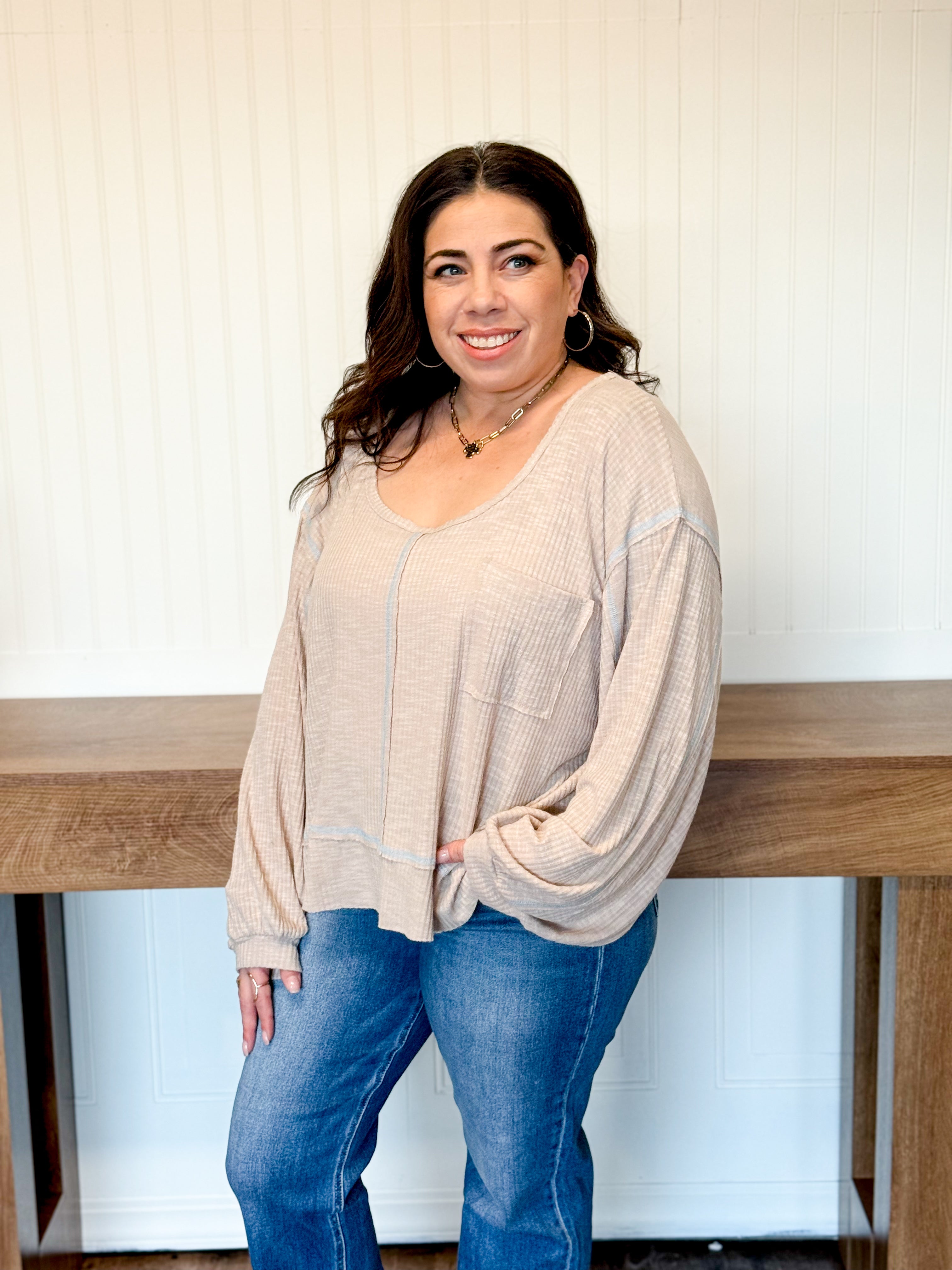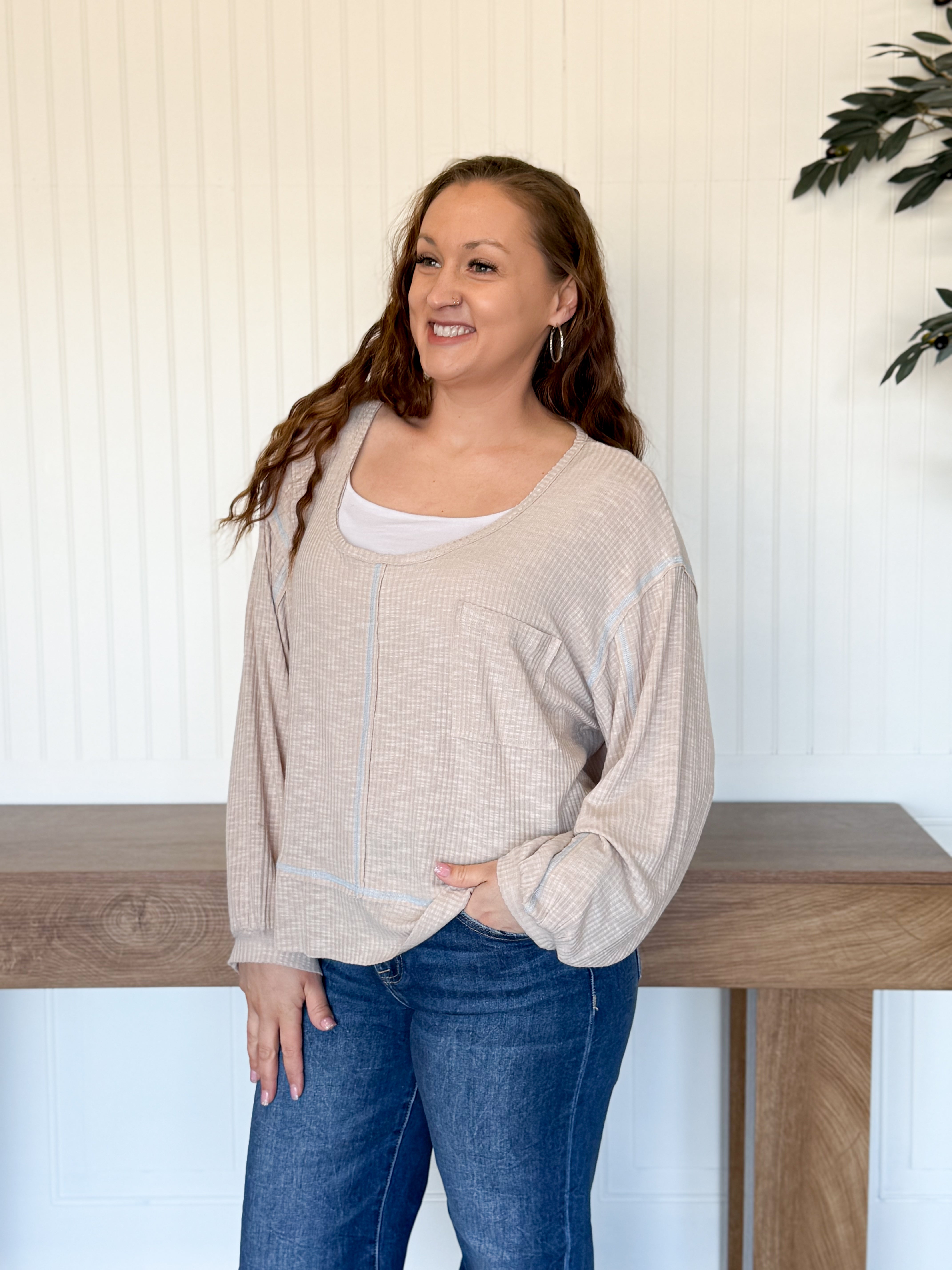 This top is one of those effortless pieces that instantly makes an outfit feel relaxed but put together. The soft ribbed fabric drapes comfortably, while the contrast stitching and exposed outseam details give it that lived-in, elevated feel. The pale taupe color keeps it neutral and easy to style with just about everything.