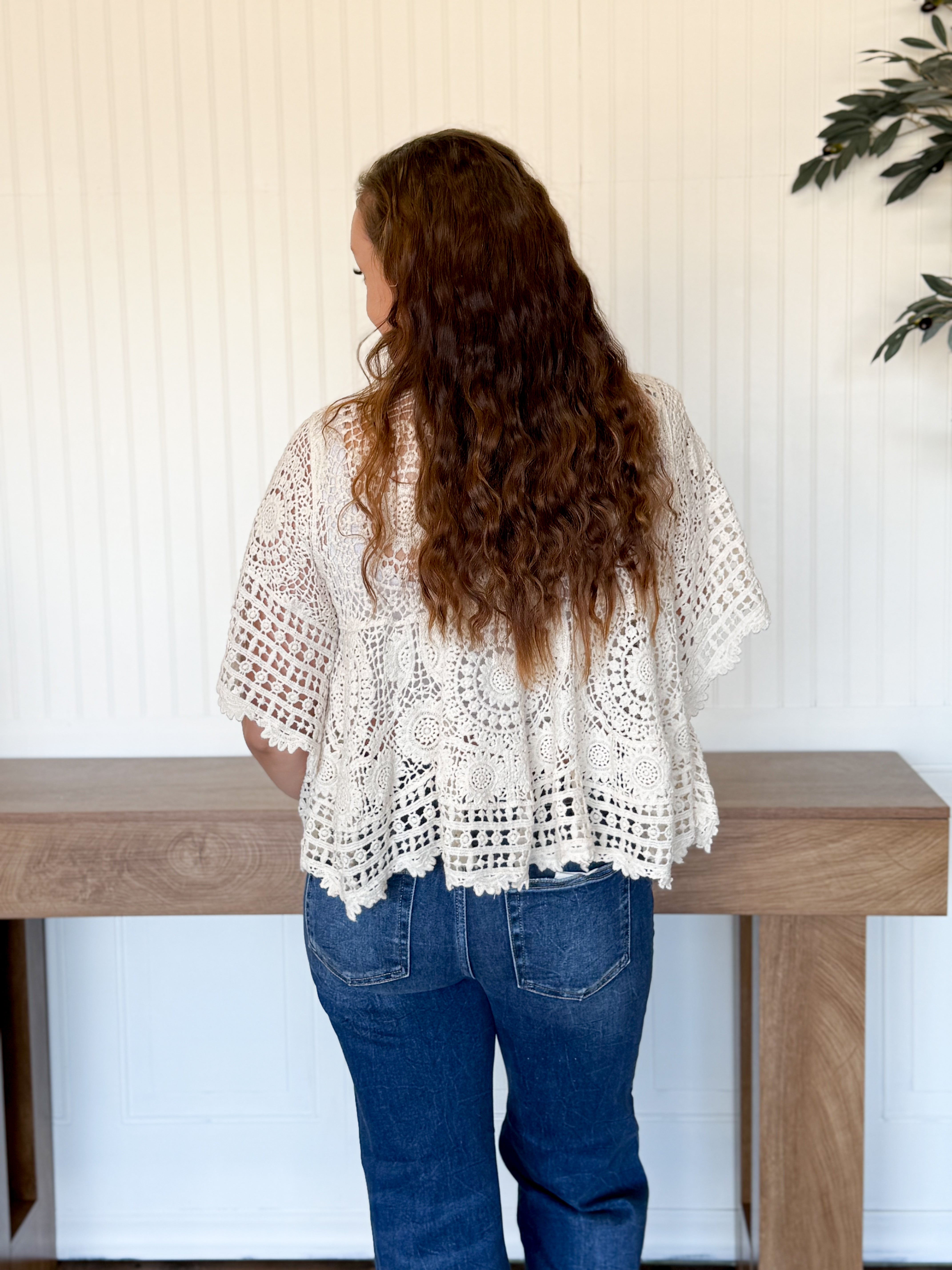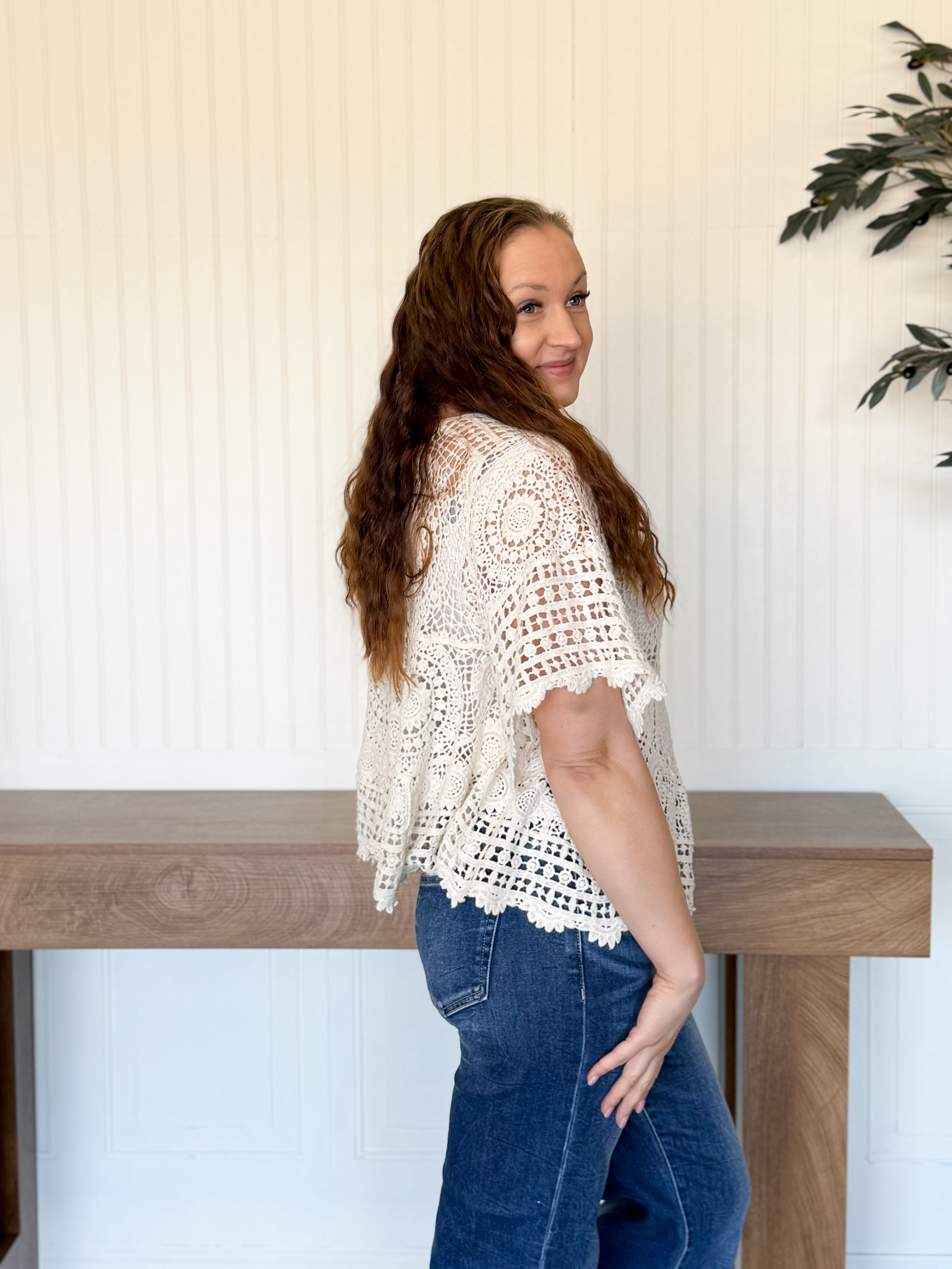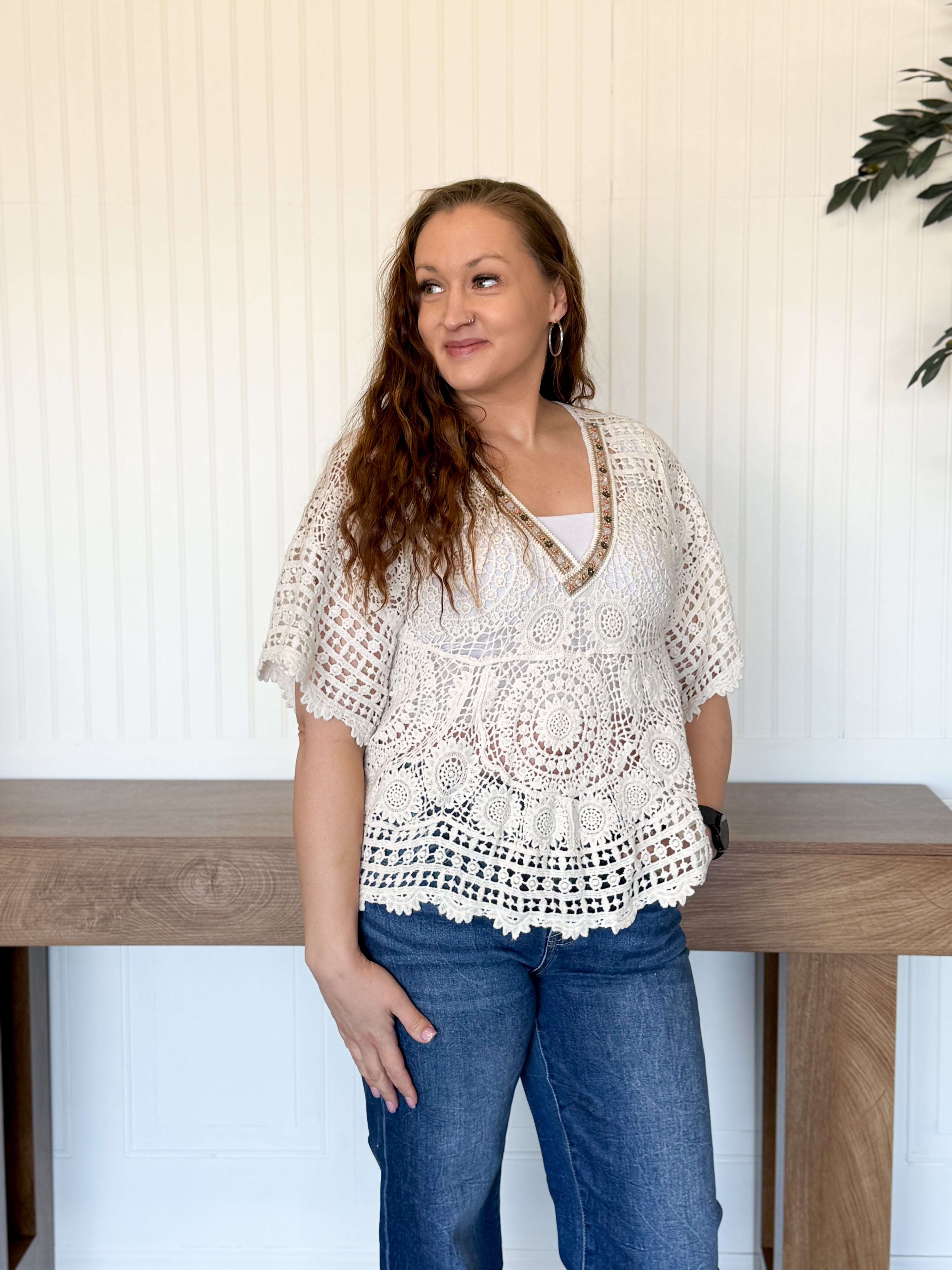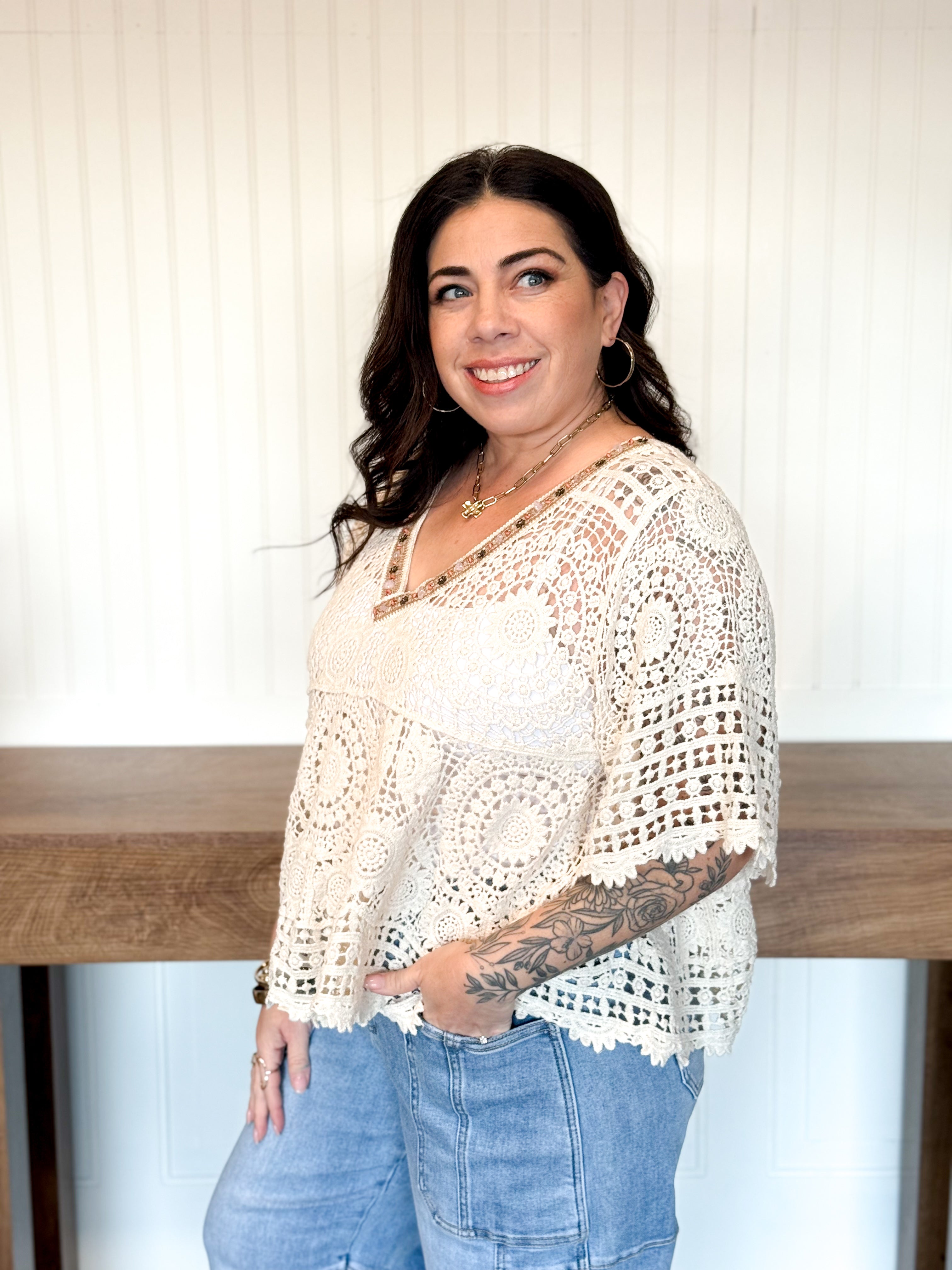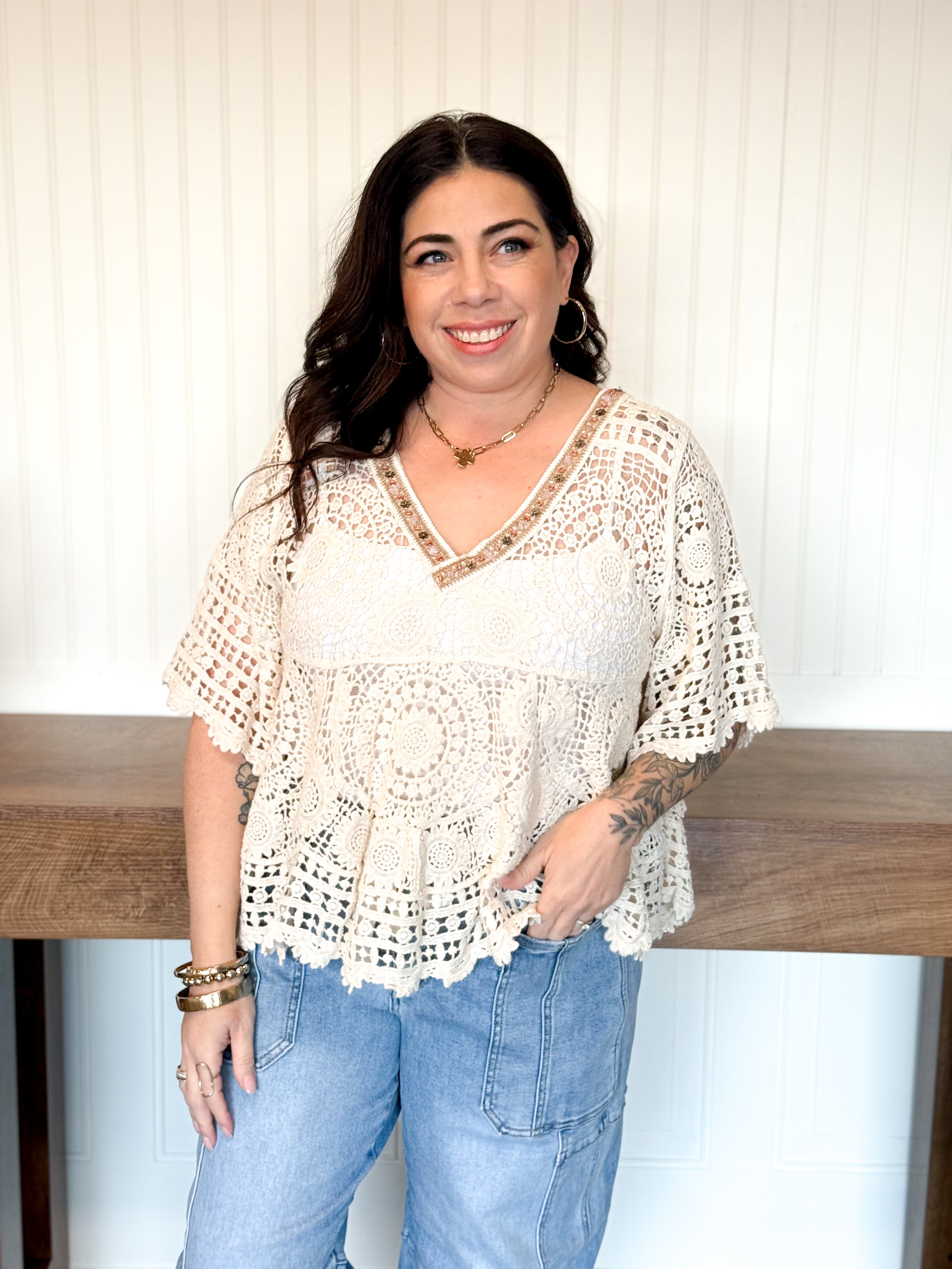 This top has that light, airy feel that instantly puts you in a relaxed mindset. The crochet detailing and varied pattern give it beautiful texture, while the flared, roomy fit keeps it comfortable and easy to wear. The scalloped edges add a soft, feminine finish that makes it feel special without being overdone.