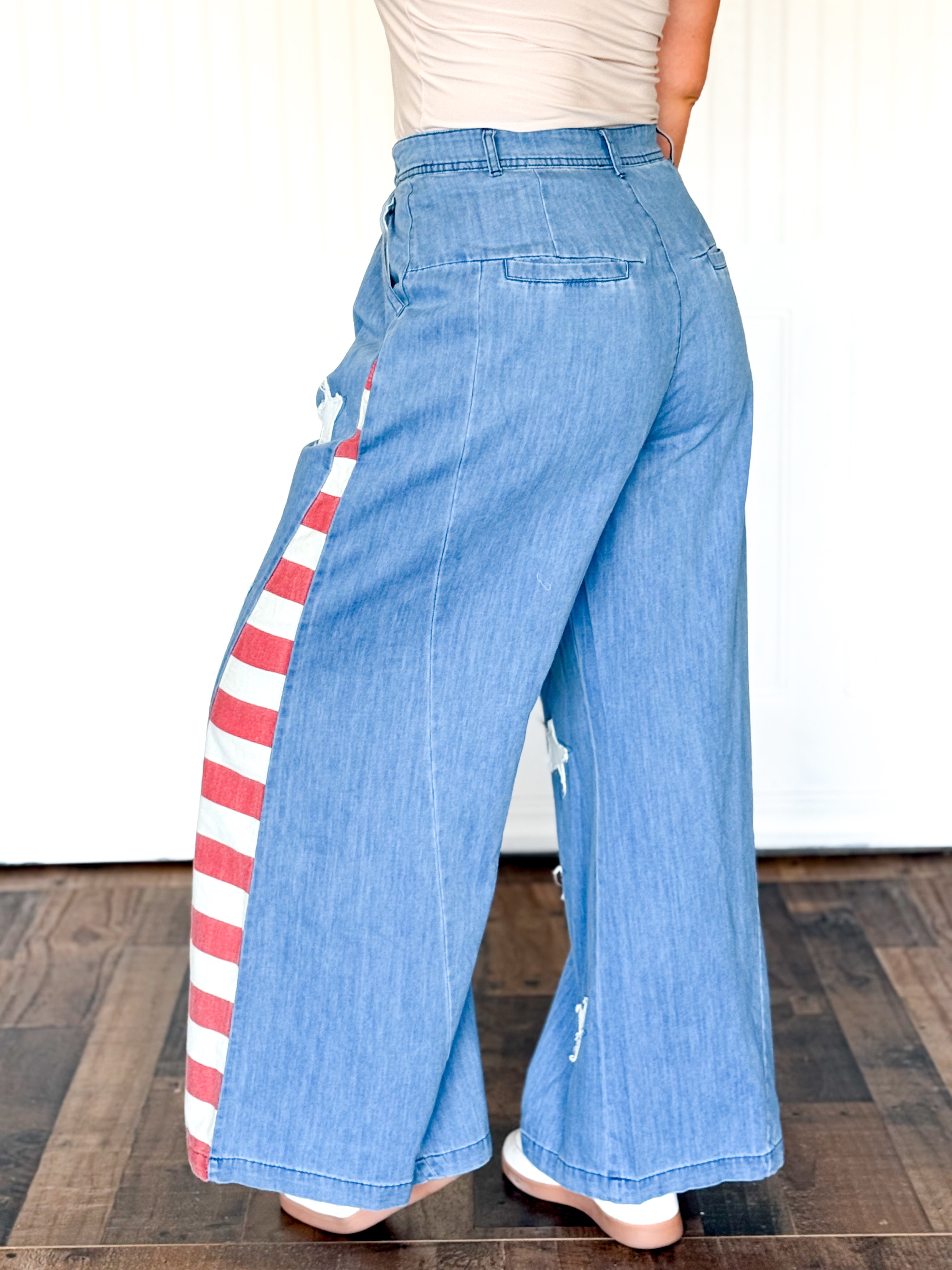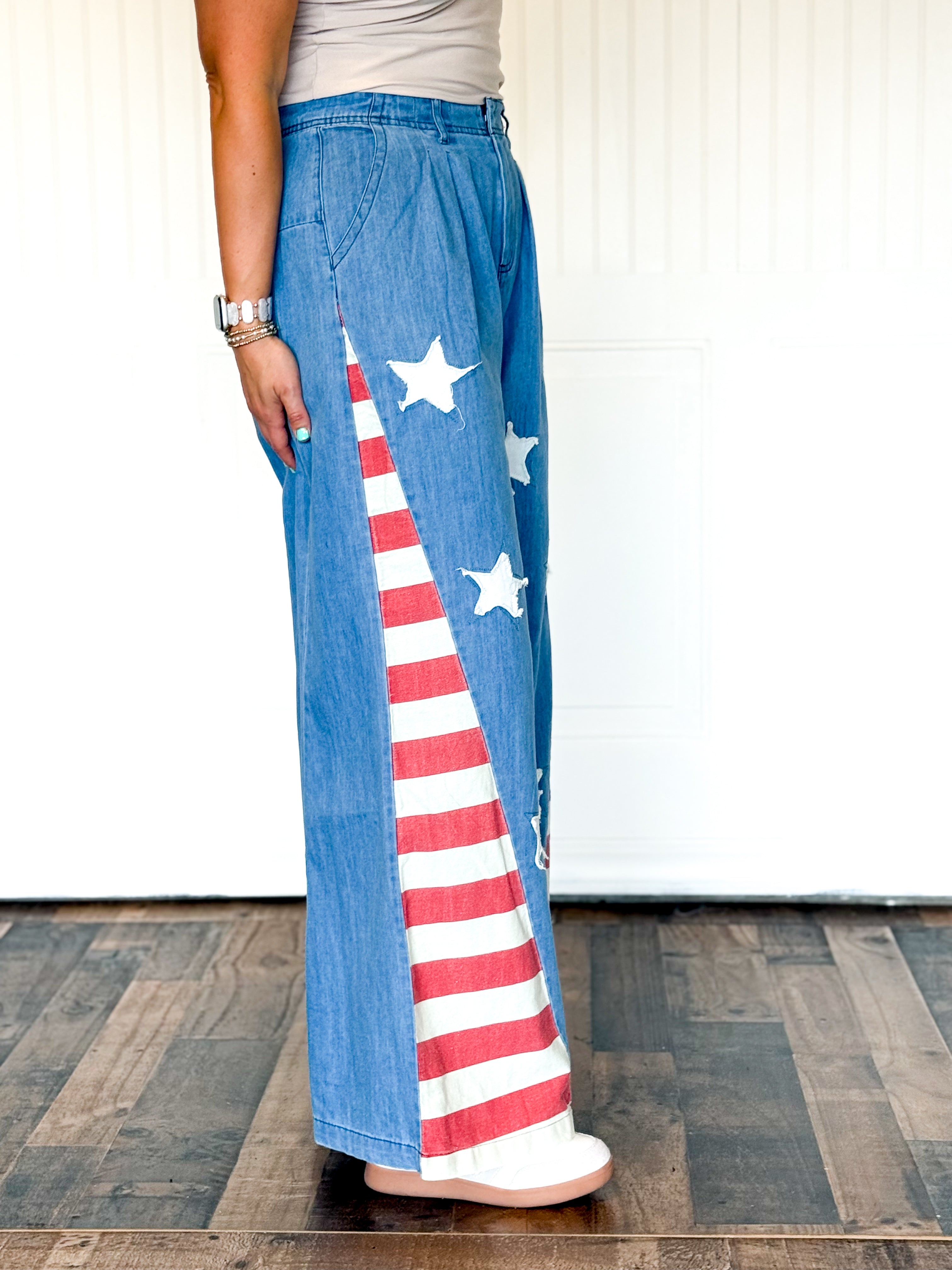 Effortlessly patriotic with a vintage twist, these wide-leg chambray pants feature American flag-inspired star patches for a playful yet stylish statement. The vintage wash adds character and a worn-in charm, making them feel like a favorite go-to pair from the moment you slip them on. Perfect for casual weekends, summer festivities, or holiday celebrations, they’re a versatile piece that combines comfort, style, and personality in one.