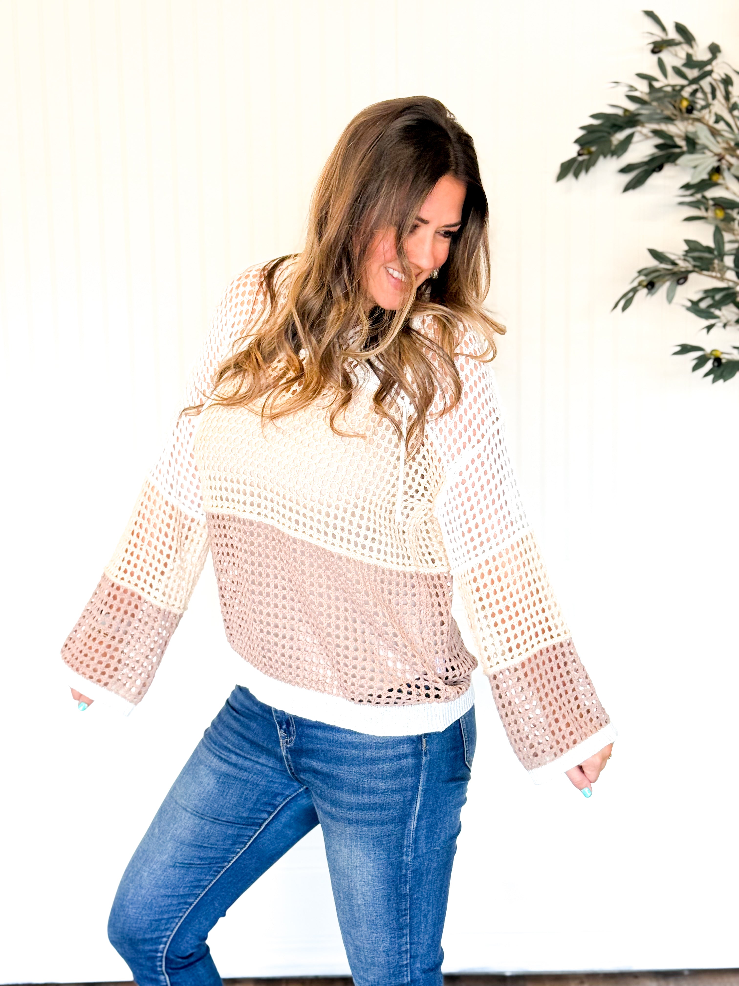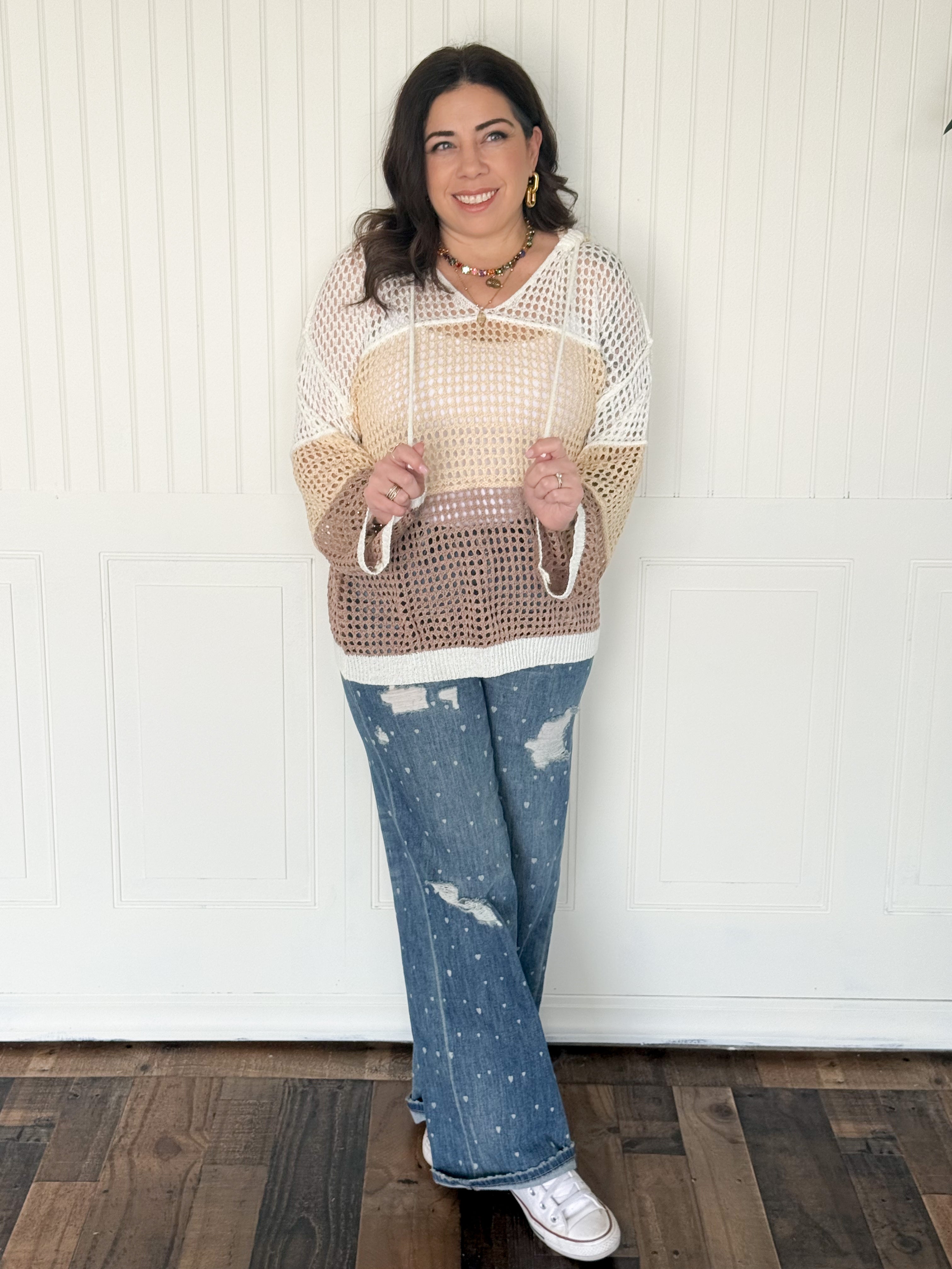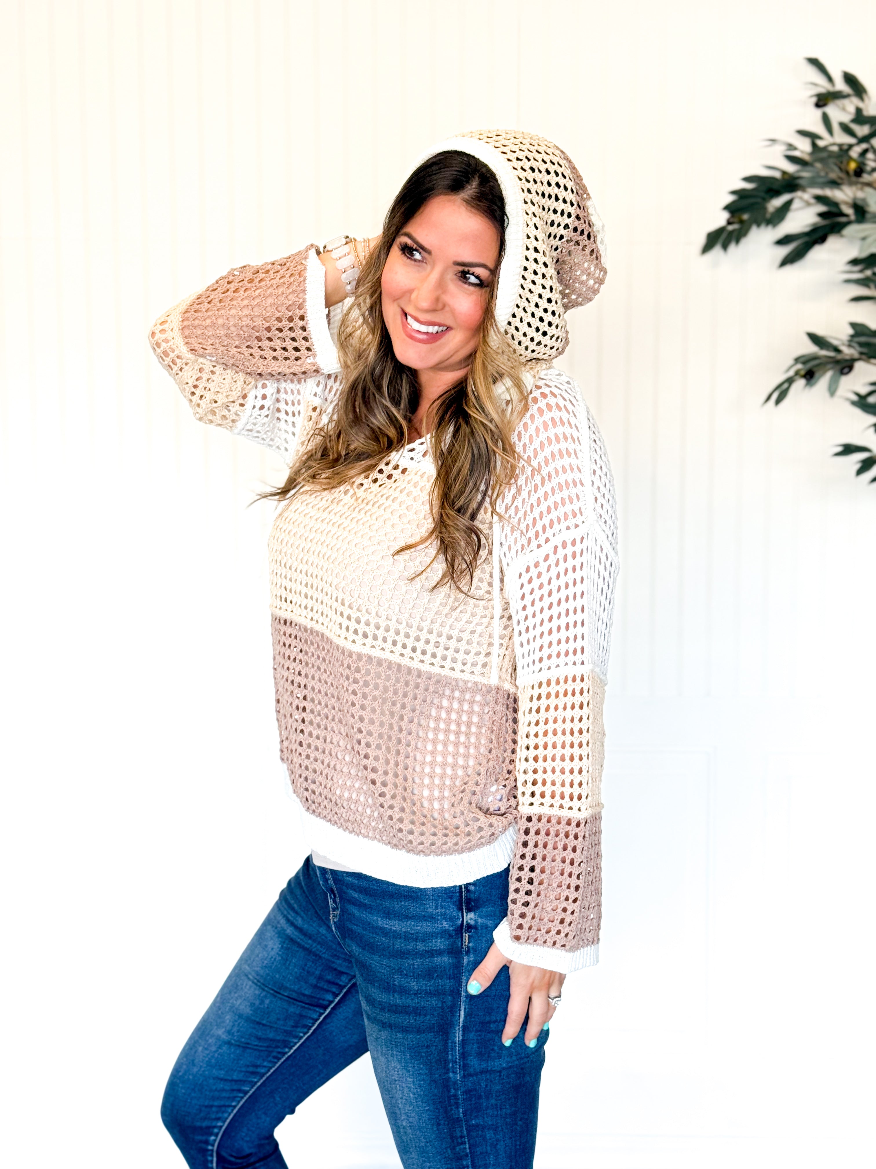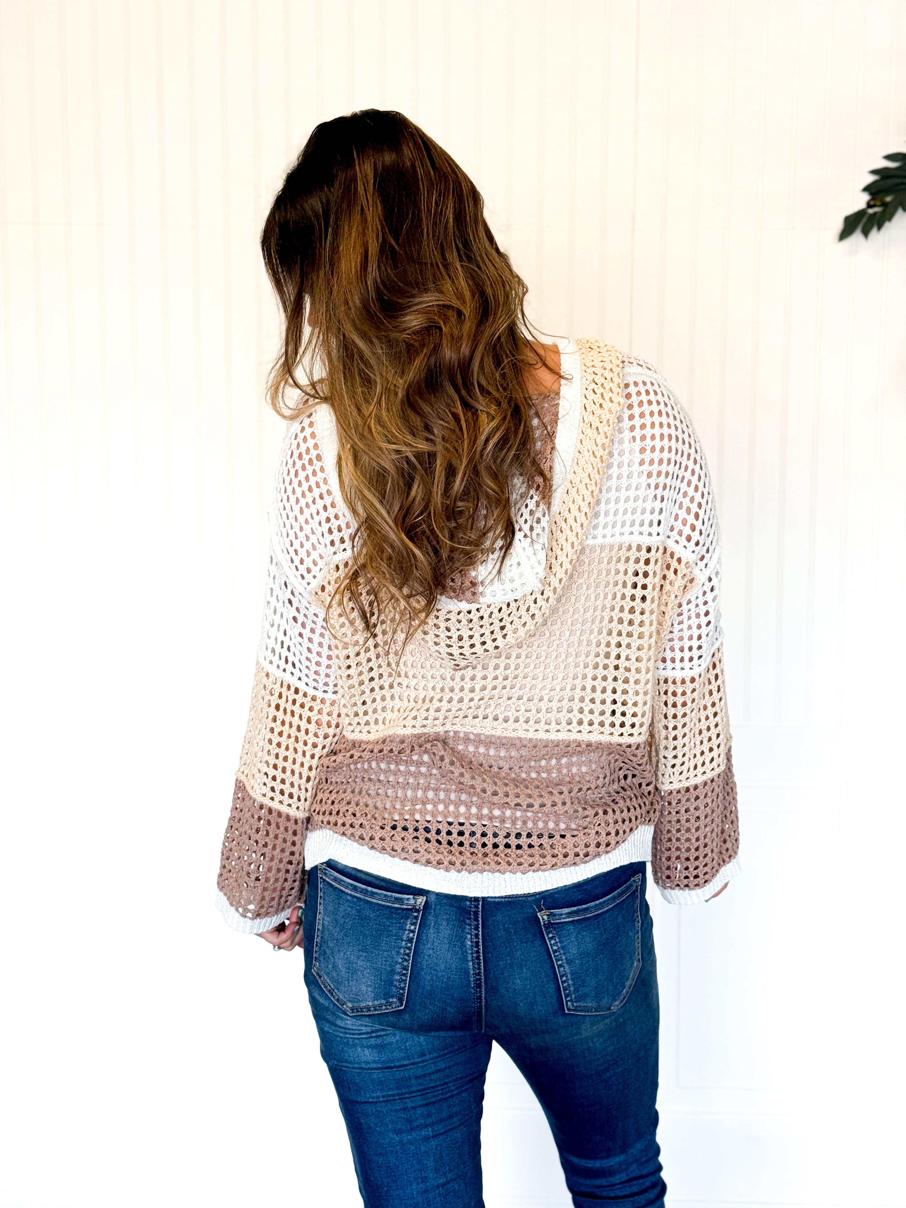 This open knit color block hood sweater is the perfect mix of cozy and statement-making. The breathable knit keeps it lightweight while still giving you that warm, comfy feel. The color block design adds just the right amount of contrast and personality, making it an easy standout piece in your closet. Finished with a relaxed hood for an effortless touch, it’s the kind of sweater you’ll grab for coffee runs, casual days out, and everything in between.