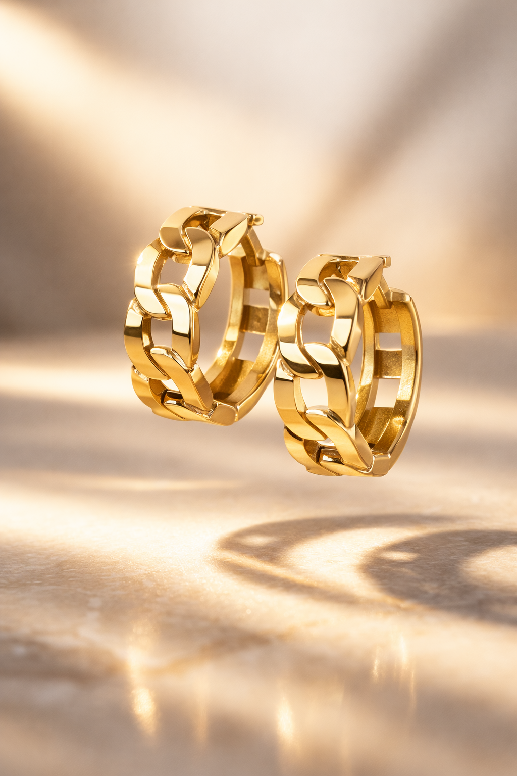 They offer a structured, form-fitting silhouette that frames the face beautifully. Made from PVD Gold Plated Stainless Steel, they’re part of our Waterproof Collection — designed to resist tarnishing while maintaining their brilliant shine.