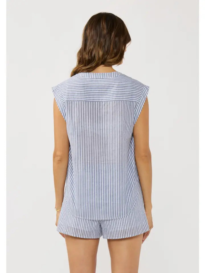 Effortlessly chic and perfect for warm-weather days, this cotton stripe button-front top brings a relaxed resort vibe to your everyday wardrobe. Designed with classic blue-and-white vertical stripes, it naturally elongates the silhouette while keeping the look fresh and timeless.