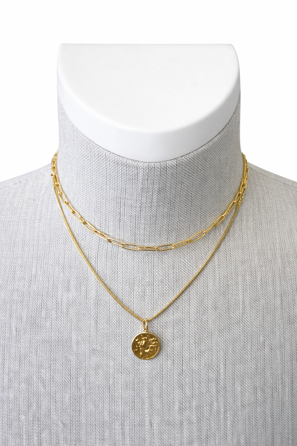 This necklace gives you the perfect layered look in one effortless piece. Featuring a modern paperclip chain paired with a delicate lower chain and a textured coin pendant, it blends timeless charm with on-trend style.