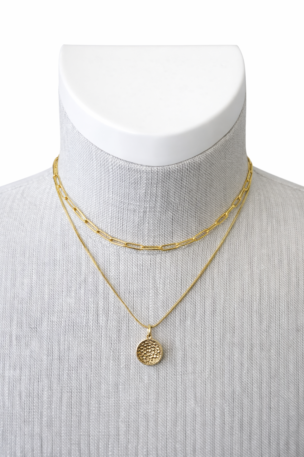 Lightweight and comfortable, this necklace lays smoothly along the neckline with a natural layered drape. The shorter paperclip chain sits closer to the collarbone, while the lower coin pendant falls slightly below for a flattering, elongated effect.