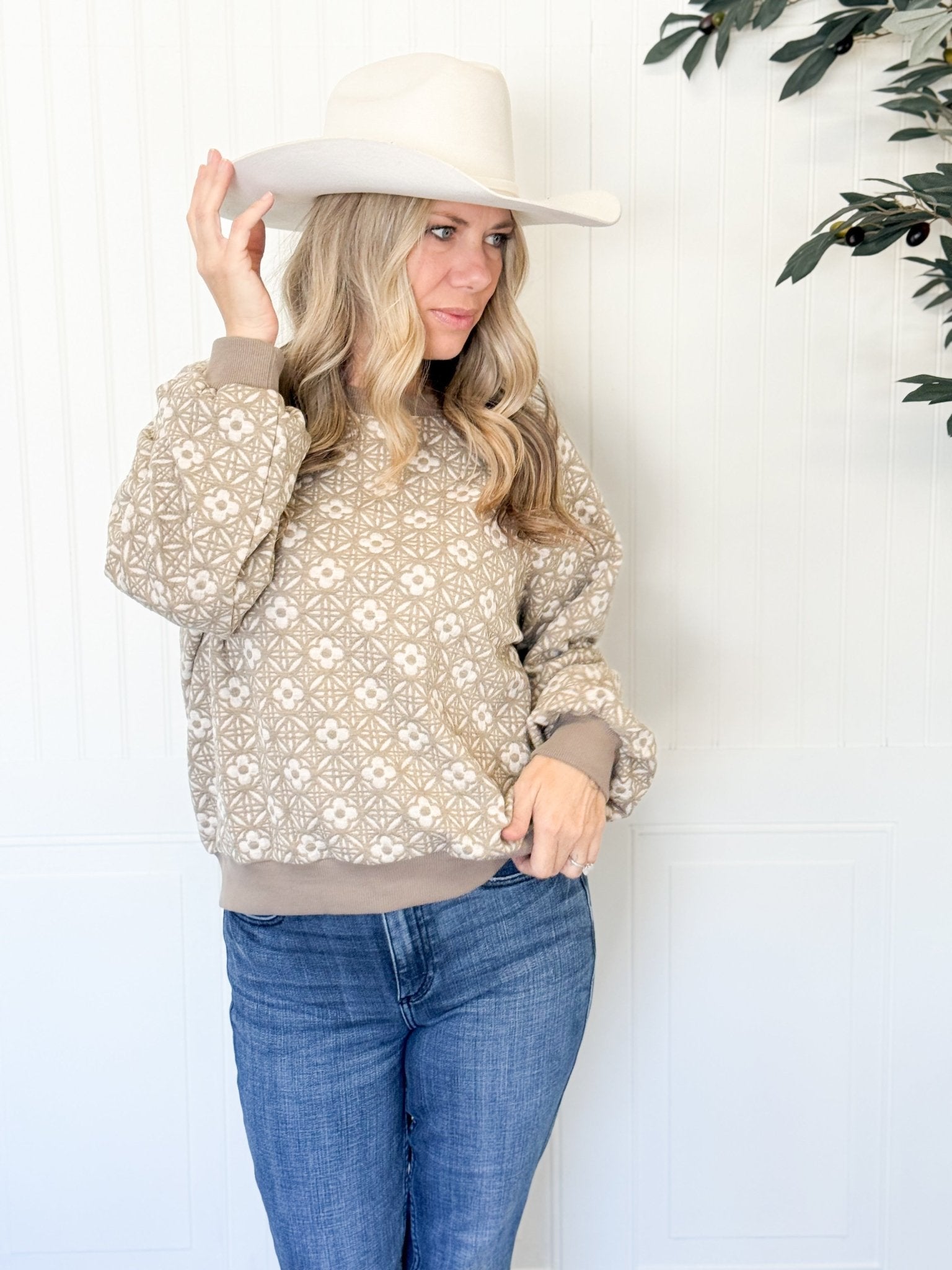 The Garden Haven Jacquard Pullover blends timeless comfort with a touch of artistry. Crafted from a soft jacquard knit, this sweater features a subtle geometric floral texture that adds depth and sophistication without overwhelming the look. The relaxed, oversized fit and balloon sleeves make it as comfortable as it is elegant — perfect for cozy mornings or polished casual days.