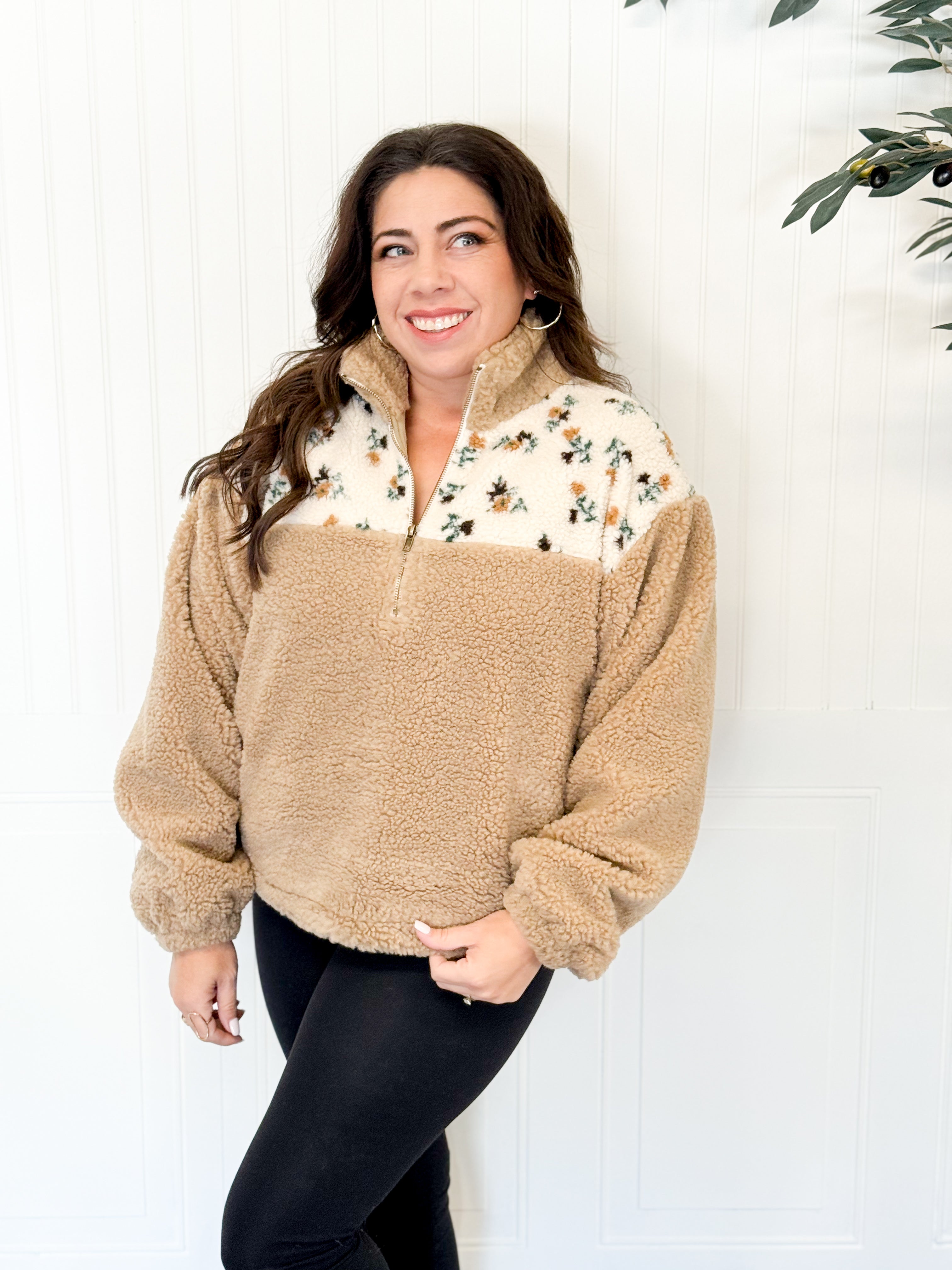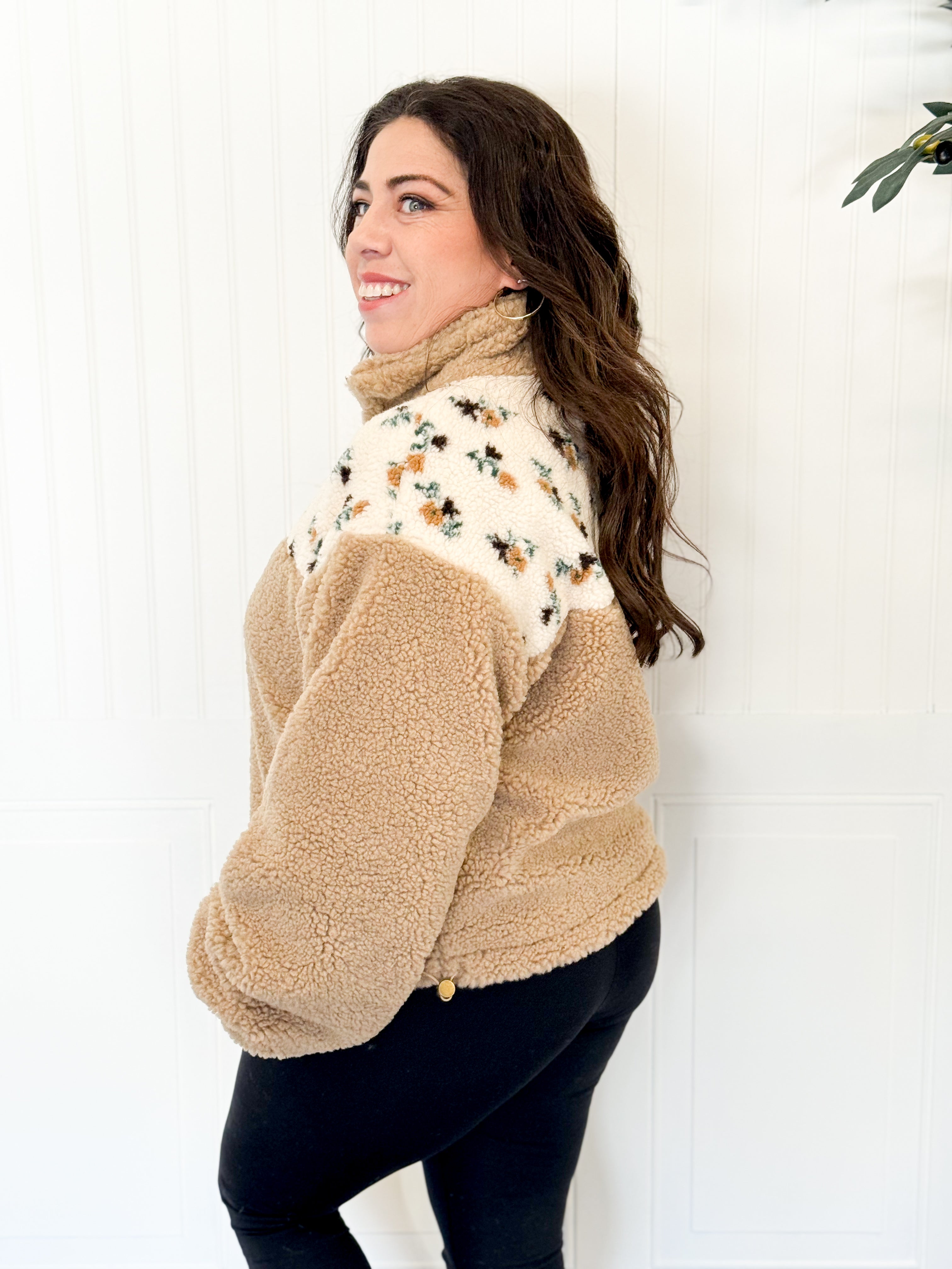The Meadow Sherpa Jacket brings a touch of cozy charm and timeless femininity to your cool-weather wardrobe. Crafted in a soft tan sherpa with delicate floral accents, this jacket perfectly balances warmth and style. The plush texture feels luxurious against the skin, while the floral detailing adds a subtle, elevated touch that feels both classic and fresh.