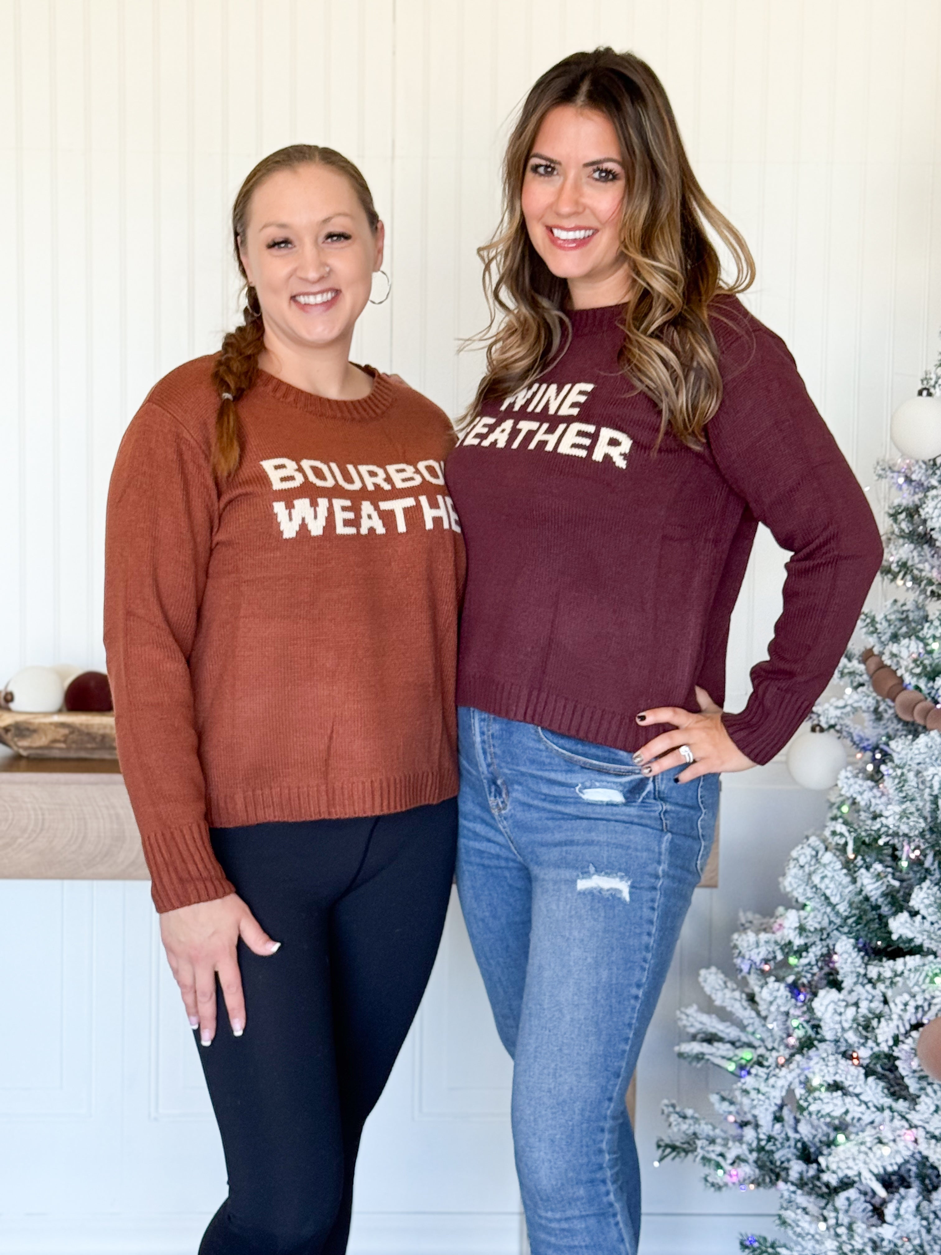 - Rust knit sweater with ivory “Bourbon Weather” text