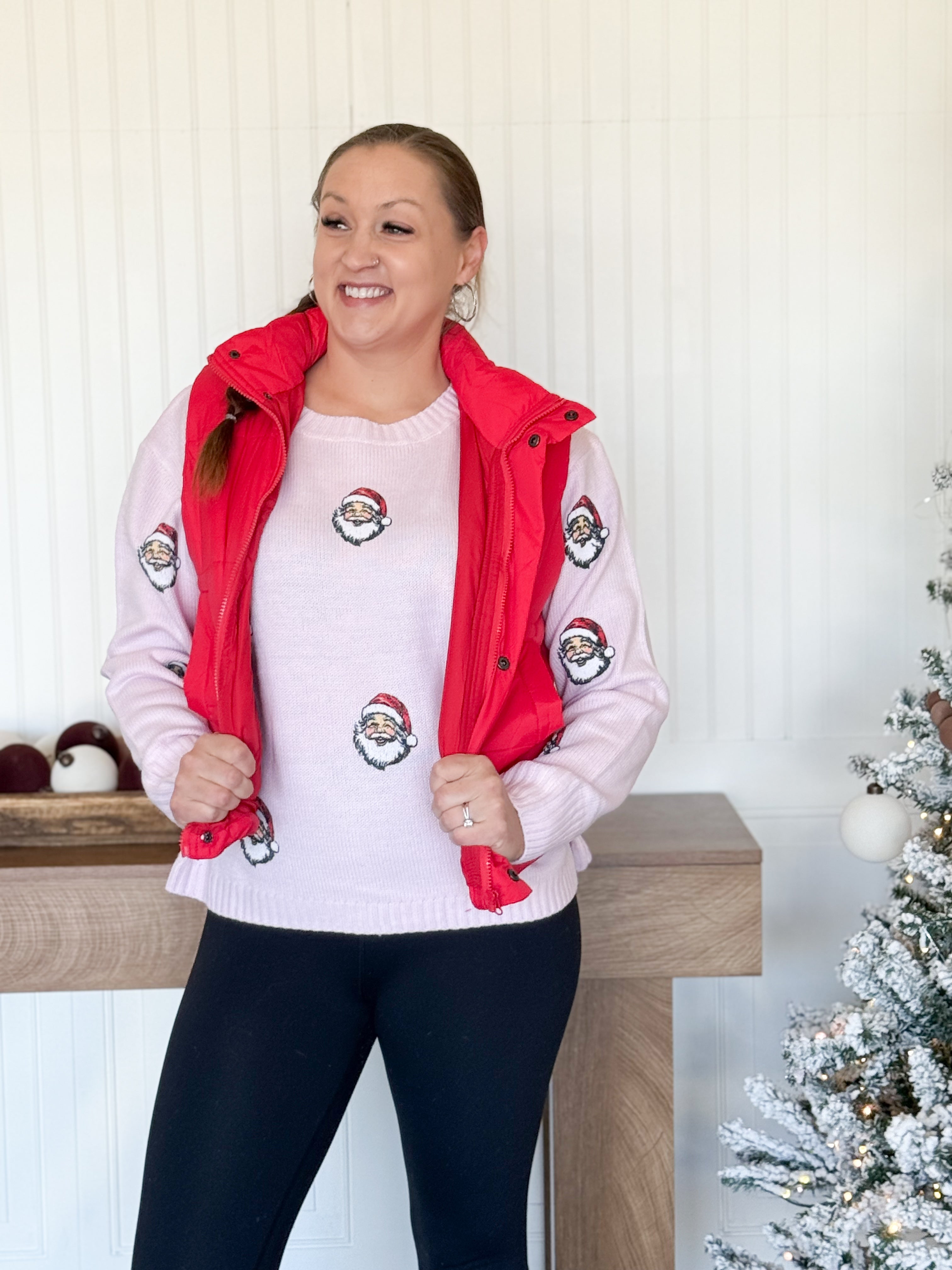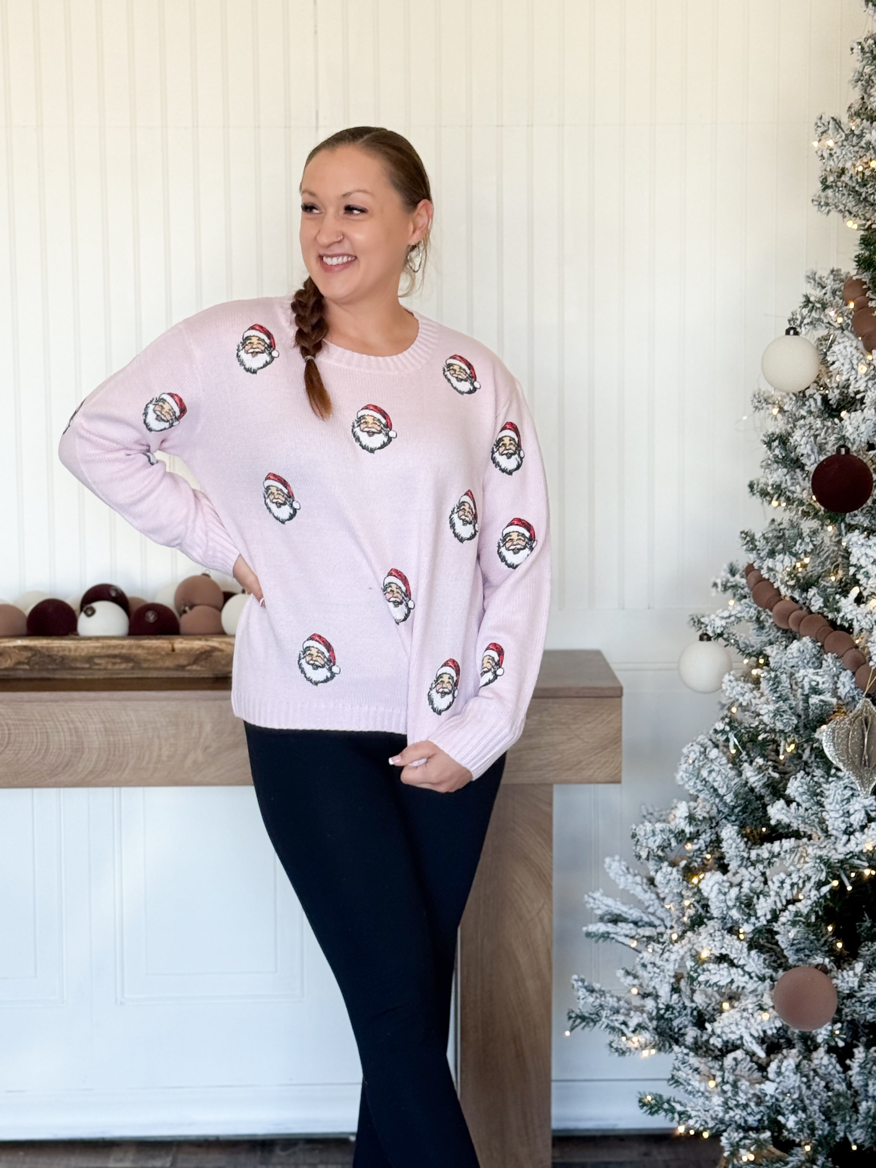 Sweet, festive, and full of holiday cheer — this light pink knit sweater brings a playful twist to Christmas style. Featuring an adorable Santa face design on both the front and back, it’s the perfect blend of cozy and fun. Whether you’re baking cookies, taking family photos, or heading to a holiday party, this sweater will keep you feeling merry and bright all season long.