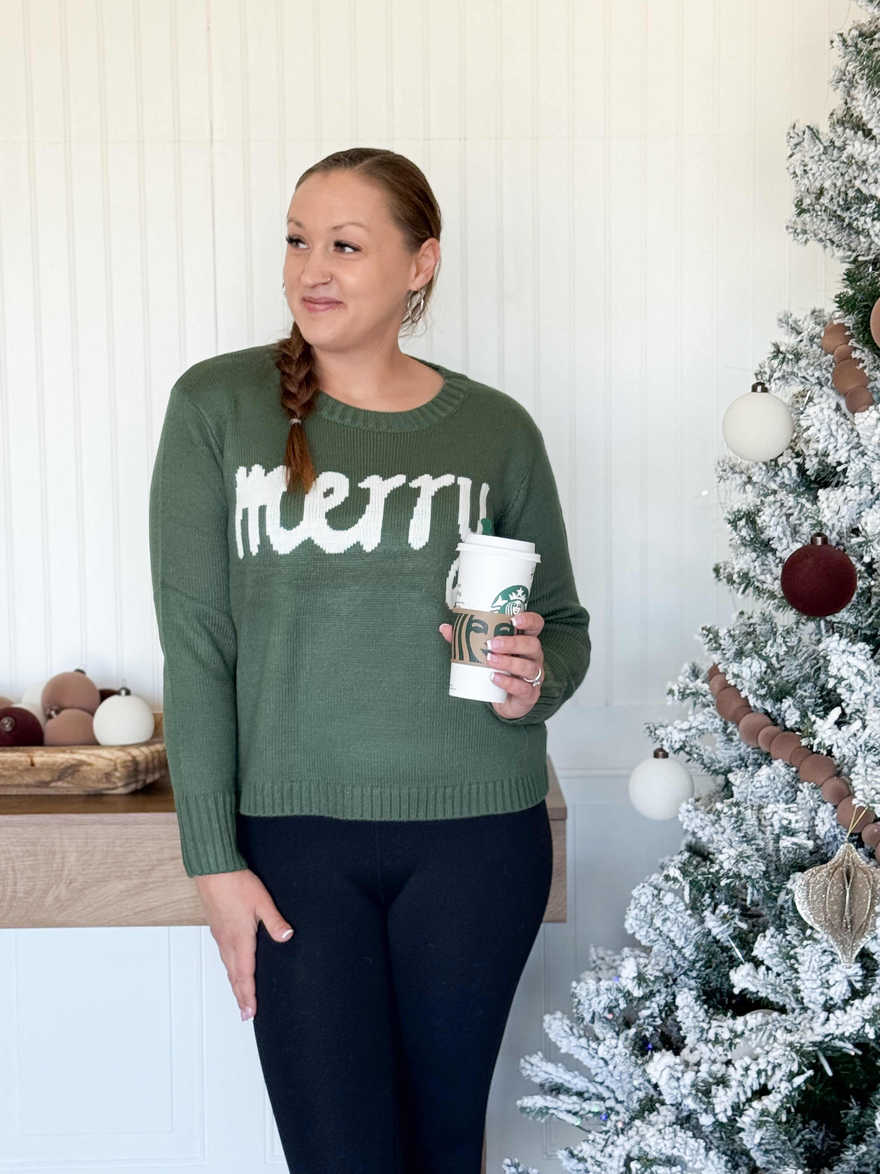 Bring a little holiday cheer wherever you go with this cozy hunter green knit sweater. The bold white “Merry” across the front adds just the right touch of festive spirit — simple, classic, and joyful. It’s soft, warm, and perfect for everything from trimming the tree to sipping cocoa downtown under the lights.