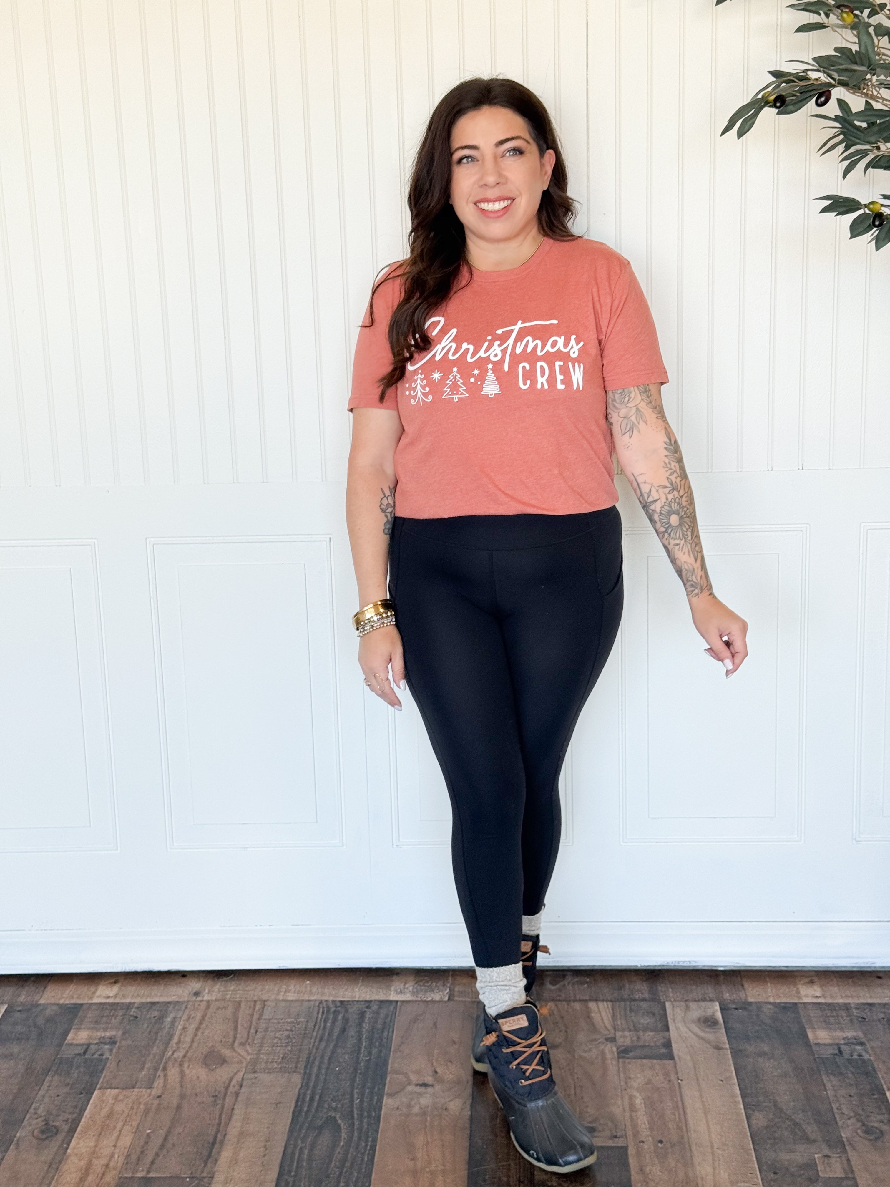 - “Christmas Crew” graphic in a timeless, festive font