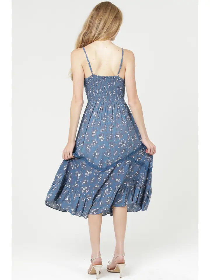 The delicate lace trim adds a soft, feminine touch, while the bold blue floral print brings a poetic charm that stands out beautifully. Perfect for day parties, brunch dates, or warm-weather events, this dress blends timeless style with everyday wearability.