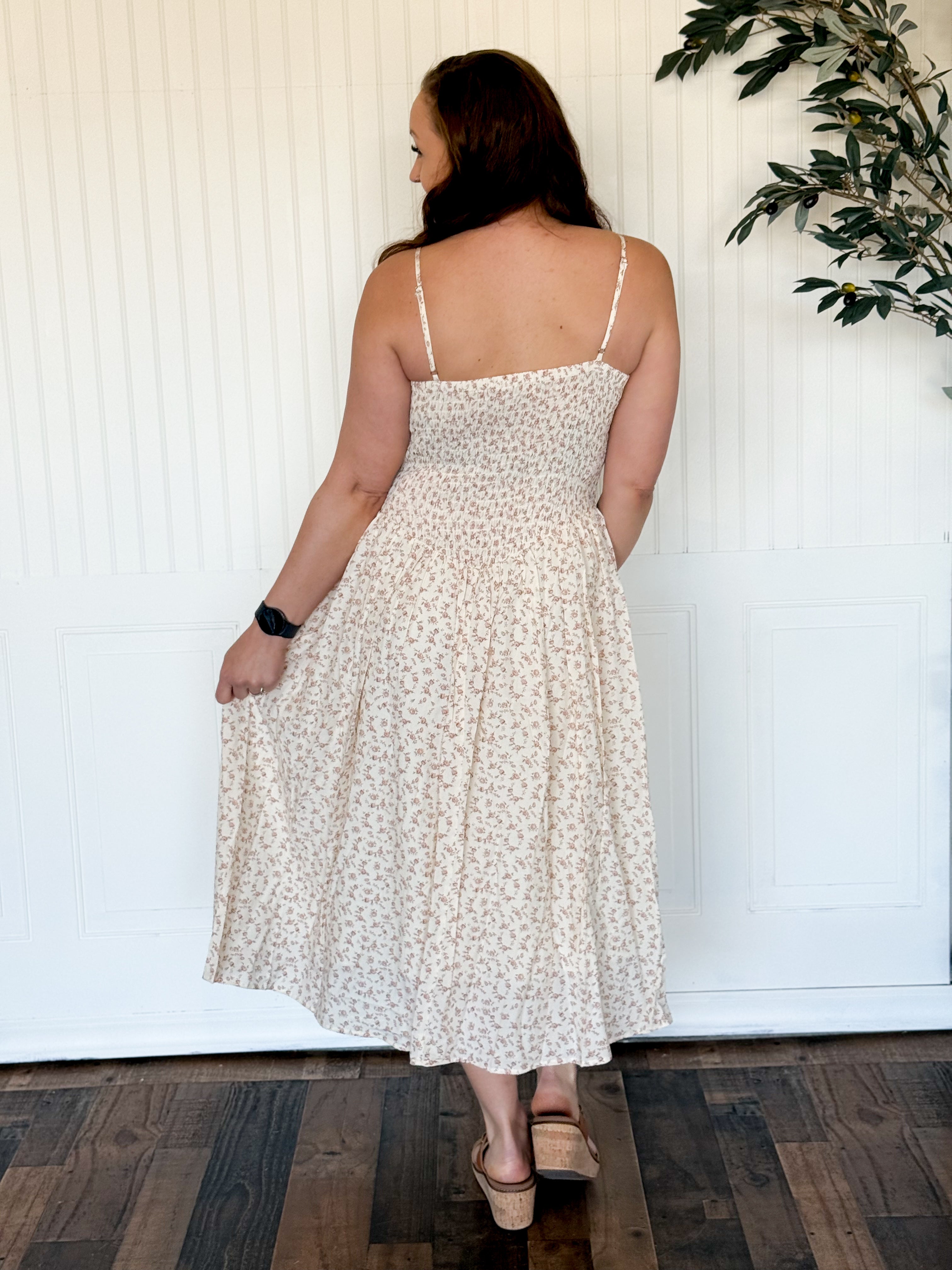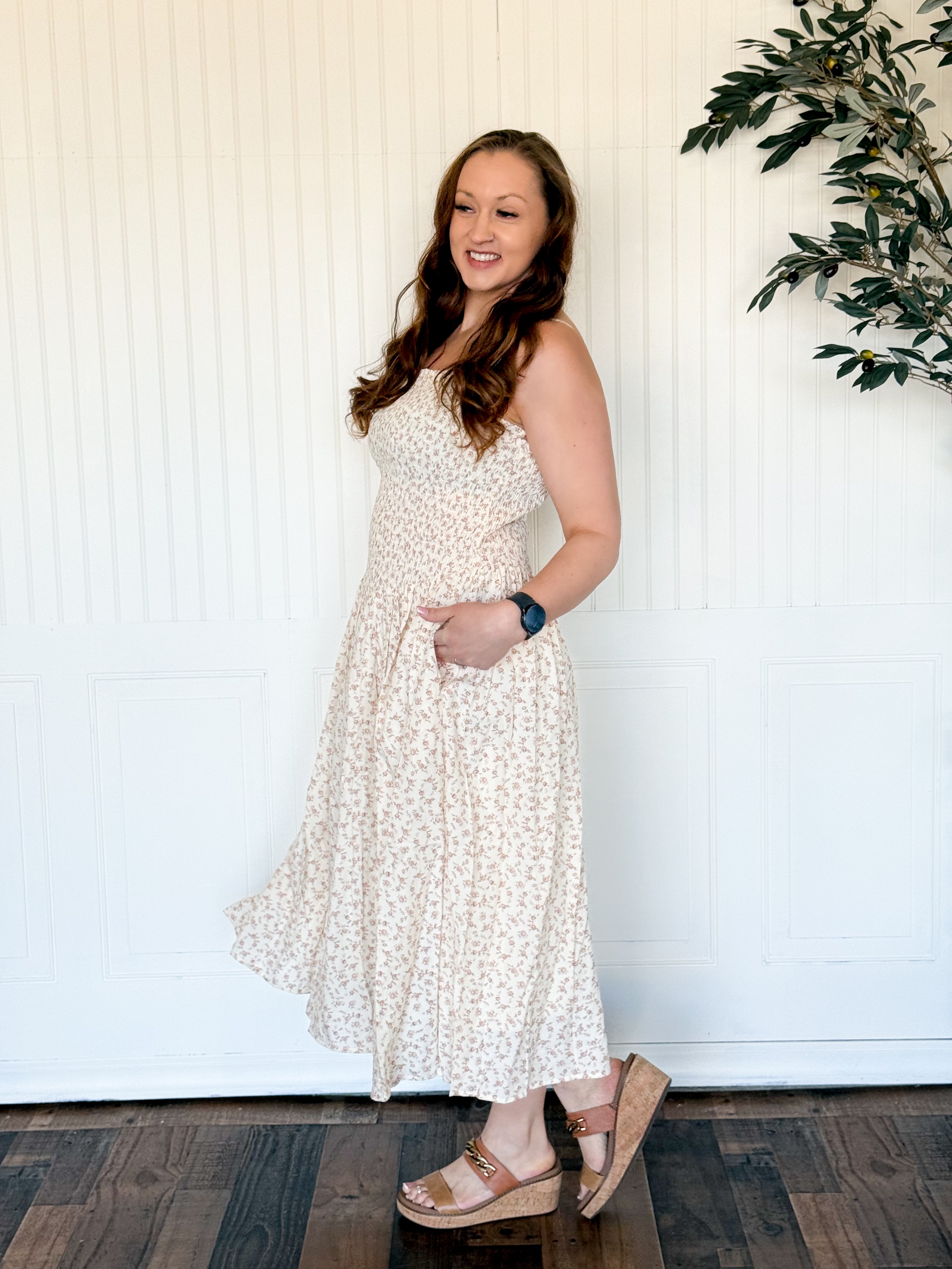 This is one of those “throw it on and instantly feel put together” dresses. The delicate, all-over floral print in soft neutral tones gives you that effortless, pretty look, and the adjustable straps + side pockets make it feel actually wearable for real life. The drop-waist shape keeps it easy and flowy without feeling bulky, and the flexible bodice moves with you (no fussy, stiff fit).