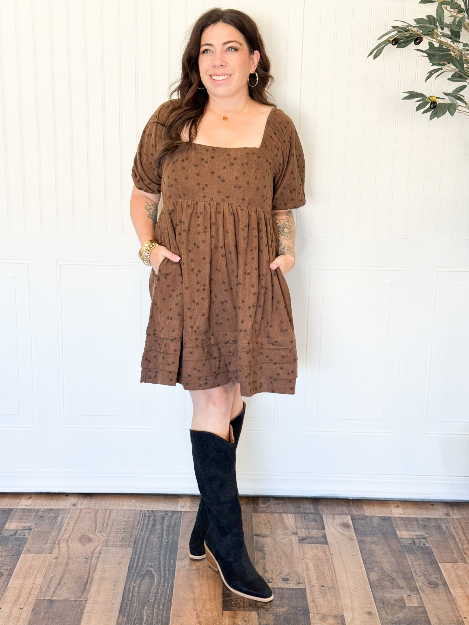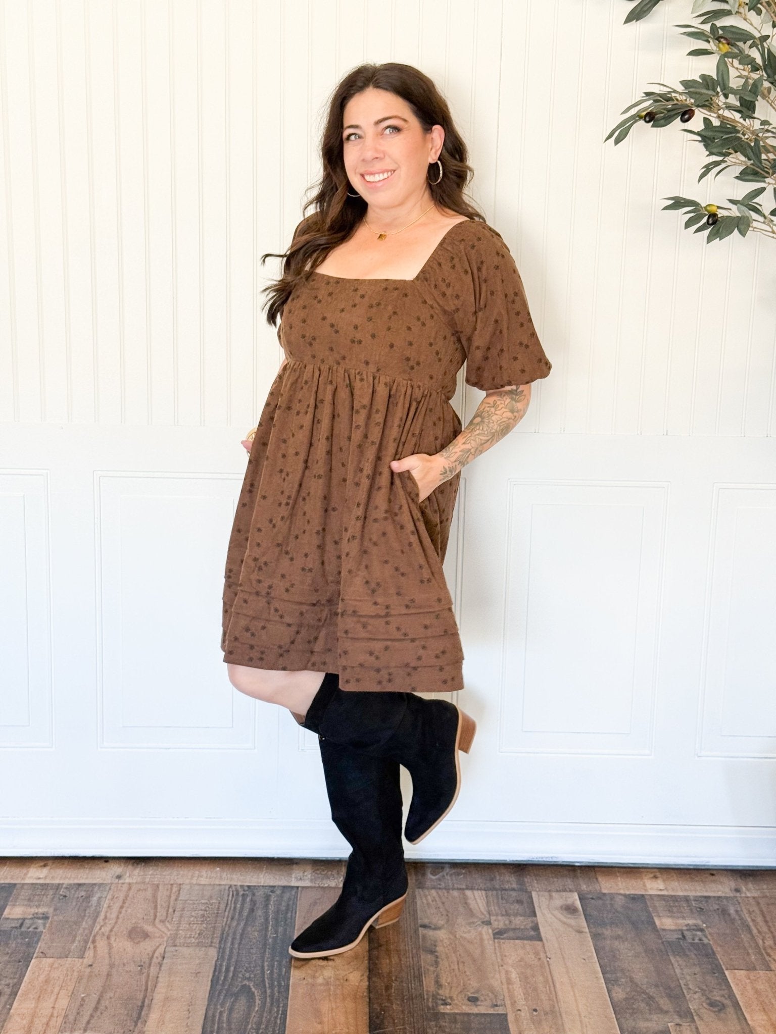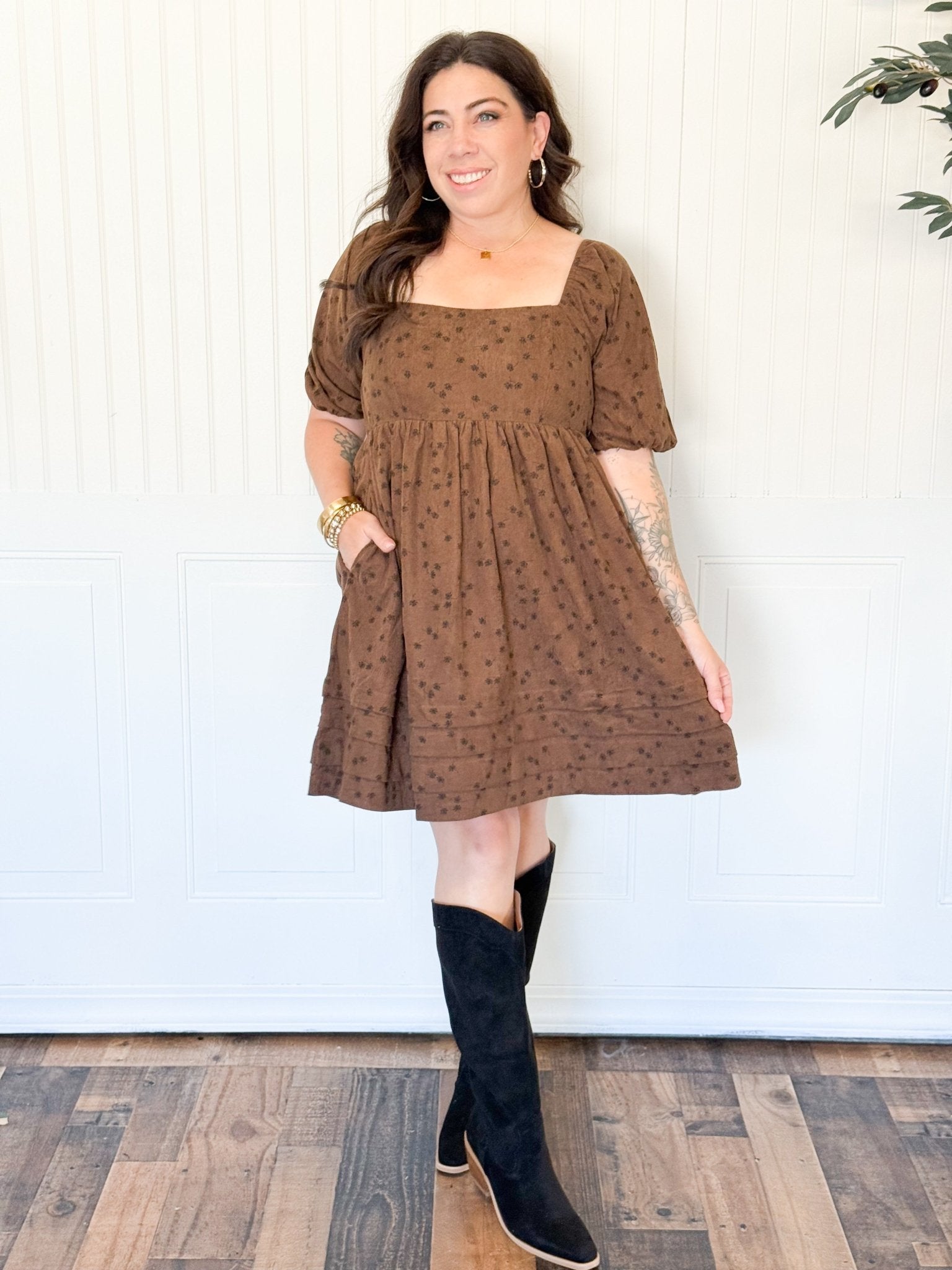 The Wildflower Corduroy Babydoll Dress is the perfect mix of playful charm and cozy texture. Crafted from soft corduroy, this mini dress features puff sleeves and a flattering babydoll silhouette that’s both feminine and comfortable. The floral print adds a romantic, vintage-inspired touch, making it an easy piece to style for fall, winter, or even spring transitions.