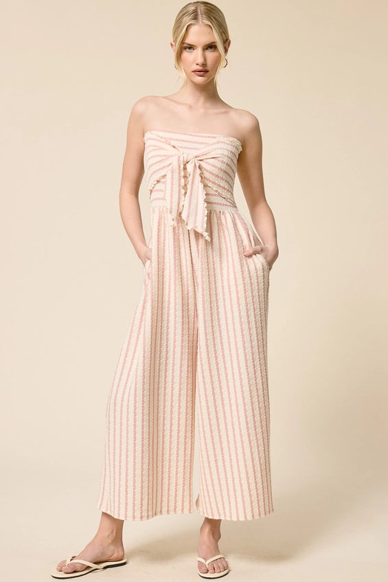 This strapless striped jumpsuit is the definition of effortless style. Designed with a flattering strapless silhouette and soft textured fabric, it delivers both comfort and a polished look in one easy piece.
