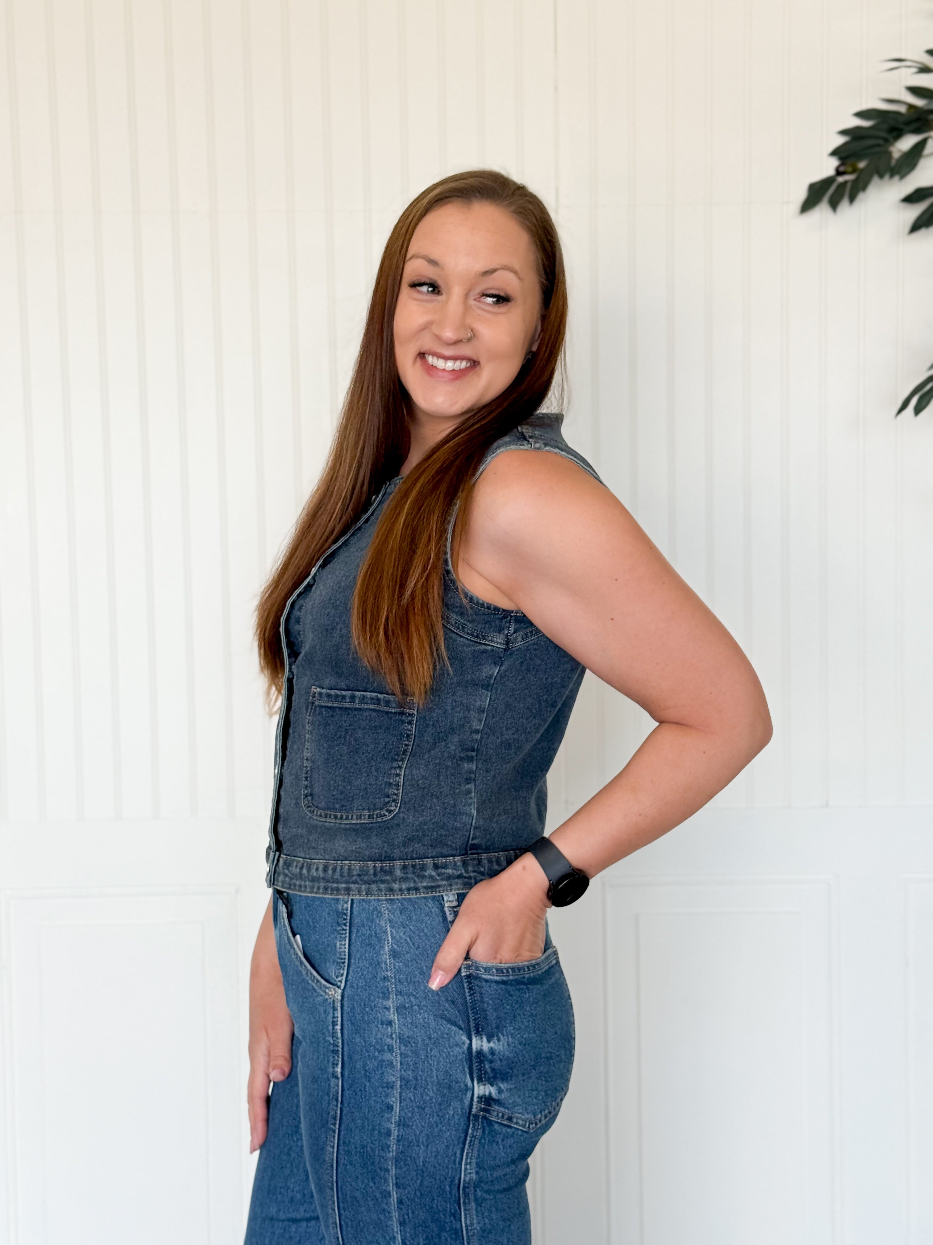 This vest is one of those easy staples that adds just the right touch of structure to any outfit. The round neckline keeps it soft and feminine, while the button-up front gives you the flexibility to style it open or closed. The denim is lightweight enough for layering but still has that classic feel you love. Perfect over a simple tee, a crisp blouse, or even a lightweight sweater — it’s a timeless piece you’ll find yourself reaching for again and again.