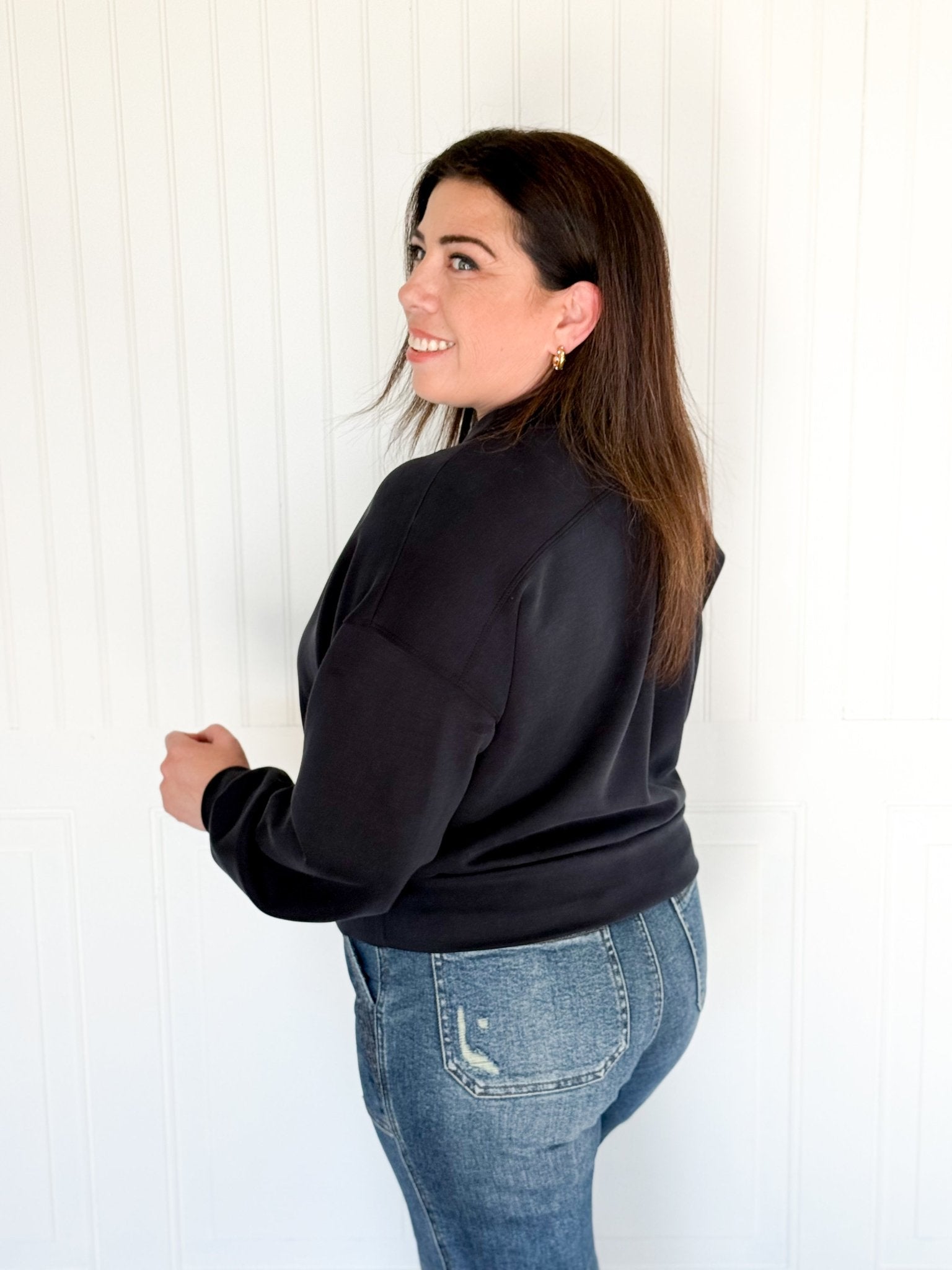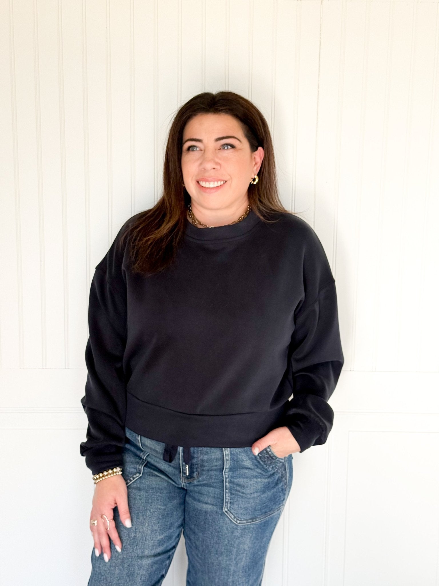 Effortless, polished, and incredibly comfortable. The AeroSoft Lounge Crew in Black is crafted from smooth scuba fabric that holds its shape beautifully while staying soft and slightly stretchy all day. Dropped shoulders, a clean silhouette, and a minimal design that makes every outfit look intentional — with zero effort required.