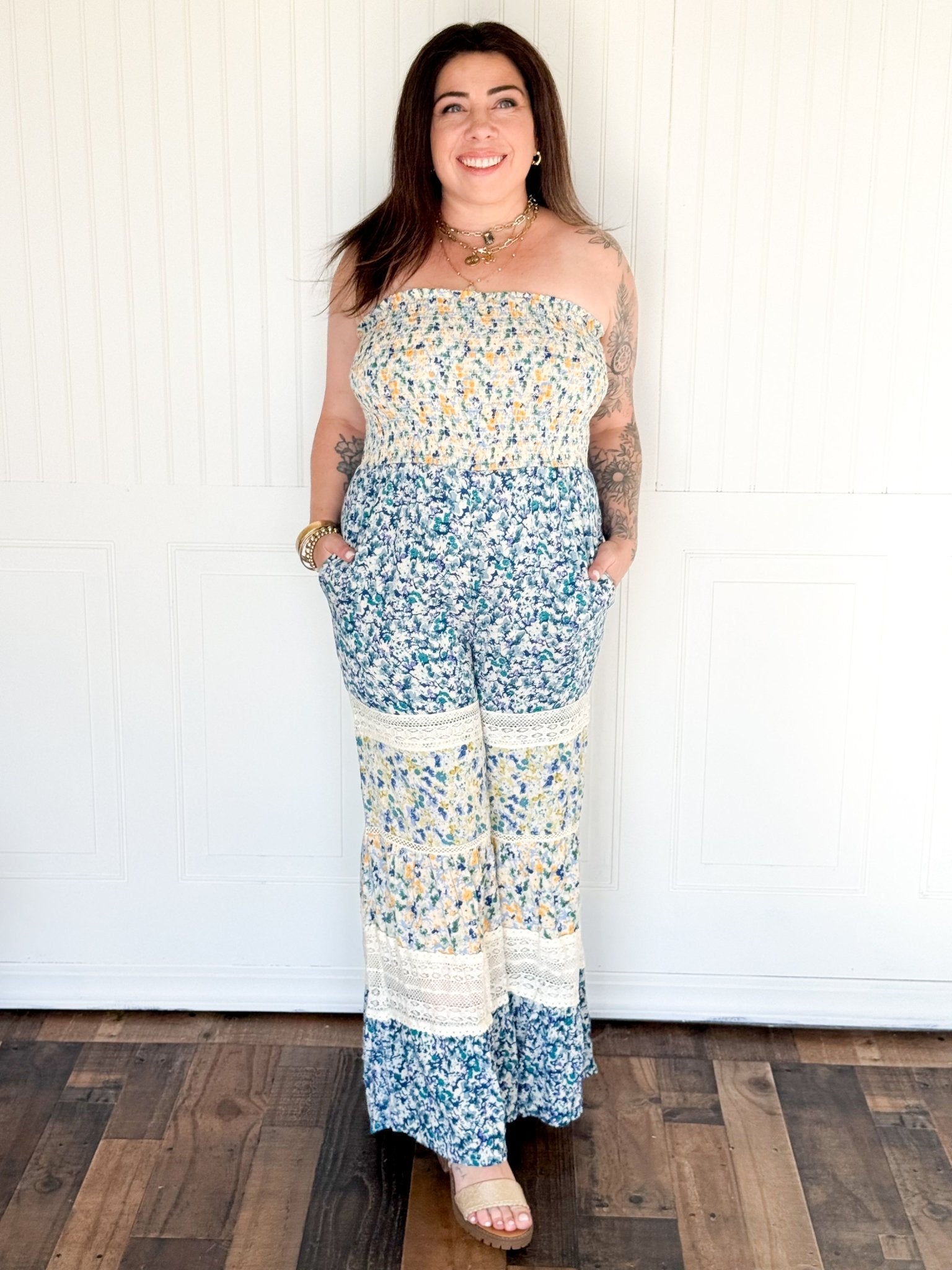 Whimsical, romantic, and effortlessly bohemian — this Smocked Bodice Strapless Lace Trim Jumpsuit is made for the free-spirited woman. Featuring a beautifully detailed floral print and delicate lace trim, this piece captures that well-traveled, resort-ready vibe.