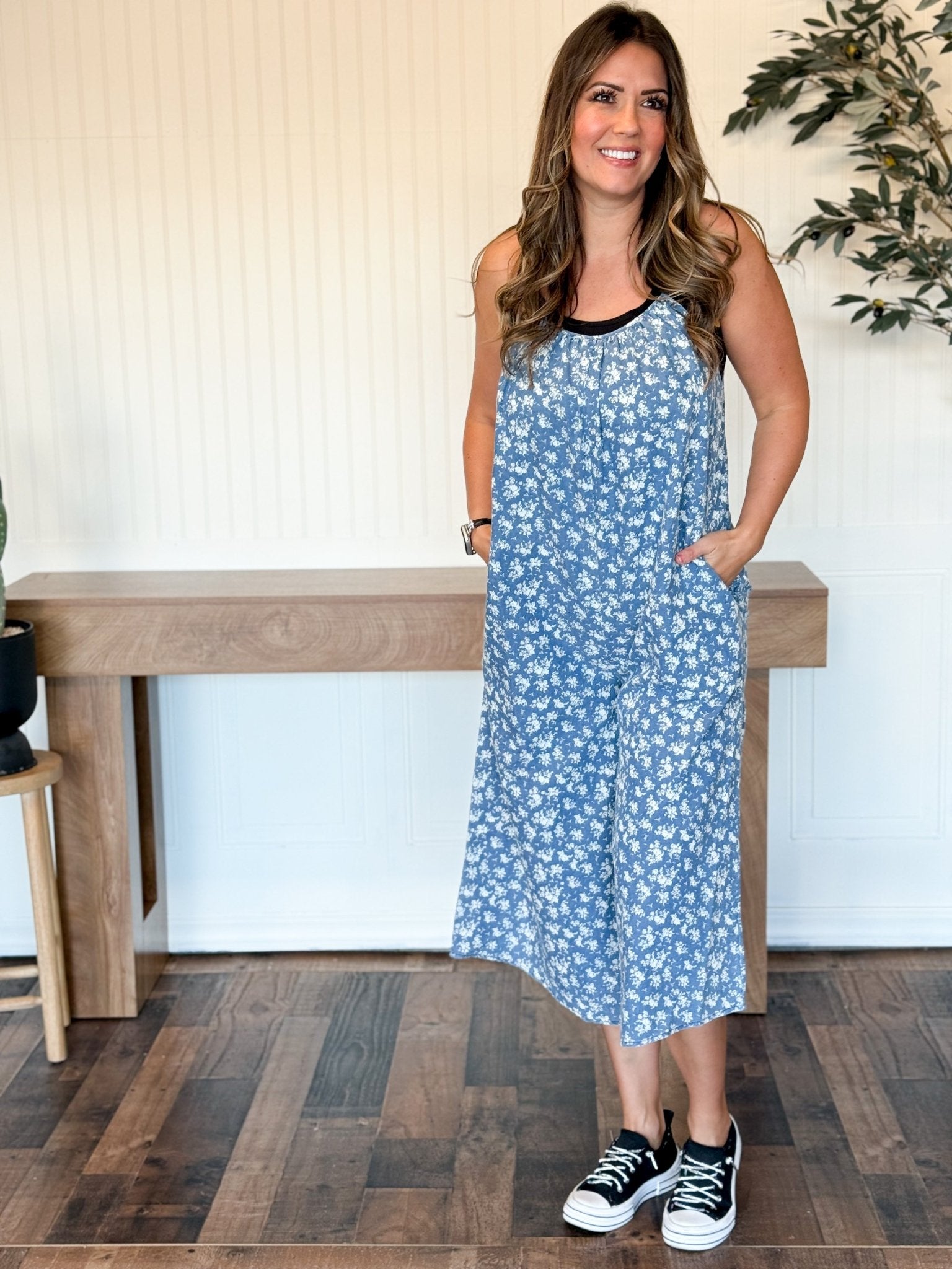 This is one of those throw-it-on-and-go pieces that instantly feels put together. The soft chambray denim has a lightweight, broken-in feel, and the floral print keeps it feminine and easy. With adjustable straps, a flattering v-neckline, and a breezy wide-leg fit, it’s comfortable enough for all-day wear — and yes, it has pockets.