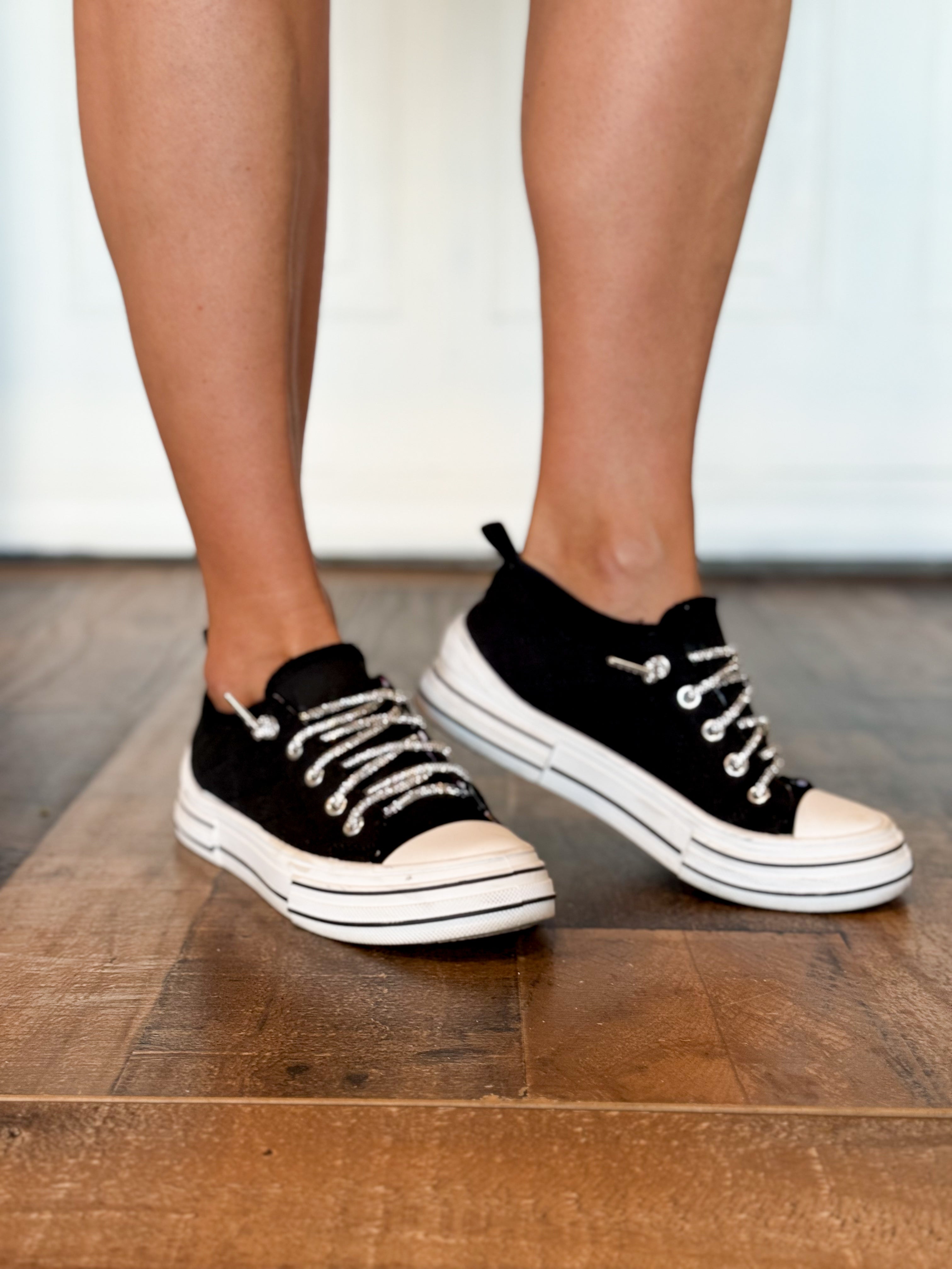 - Lace-up design with rhinestone-detailed laces for subtle shine