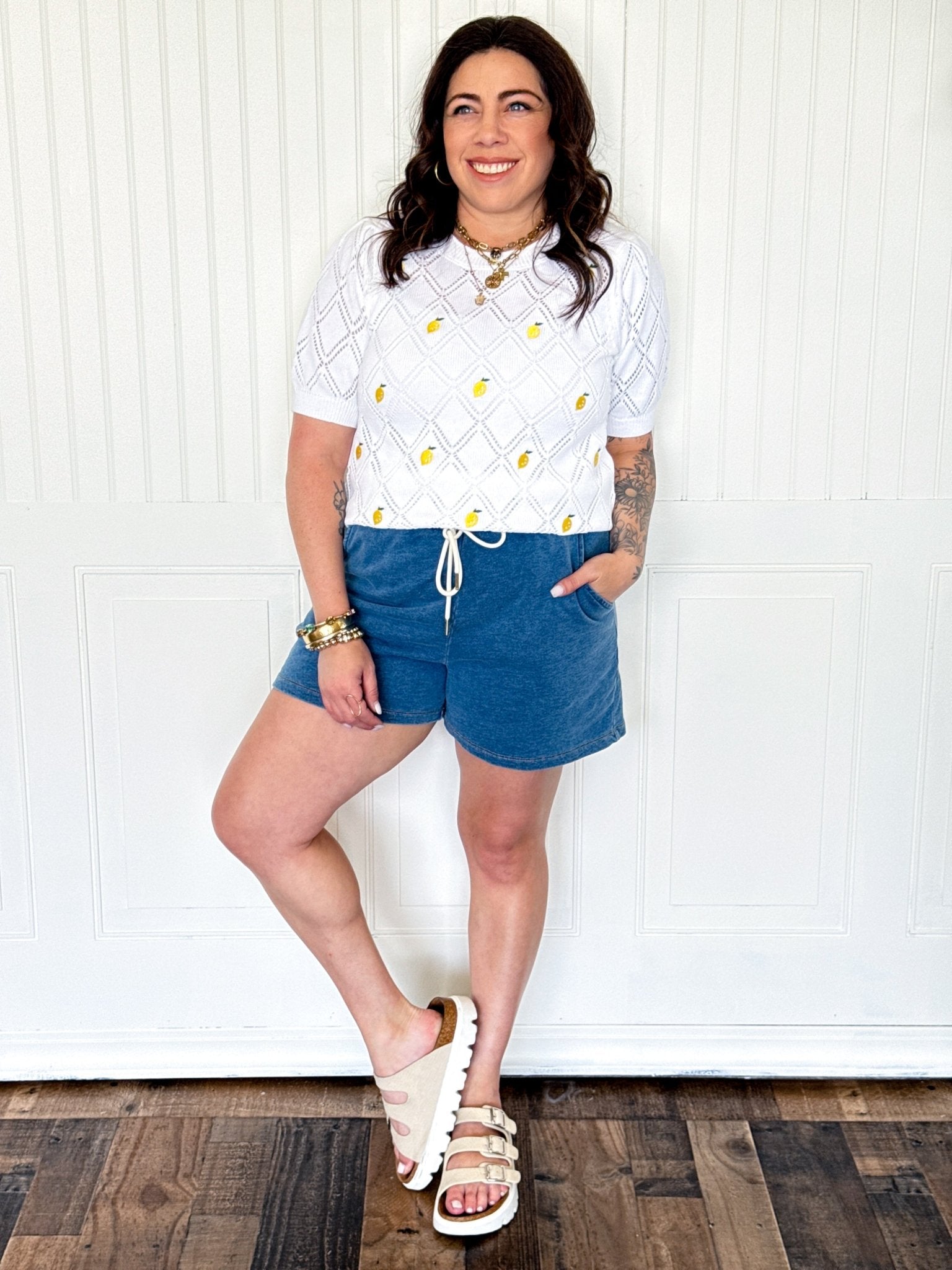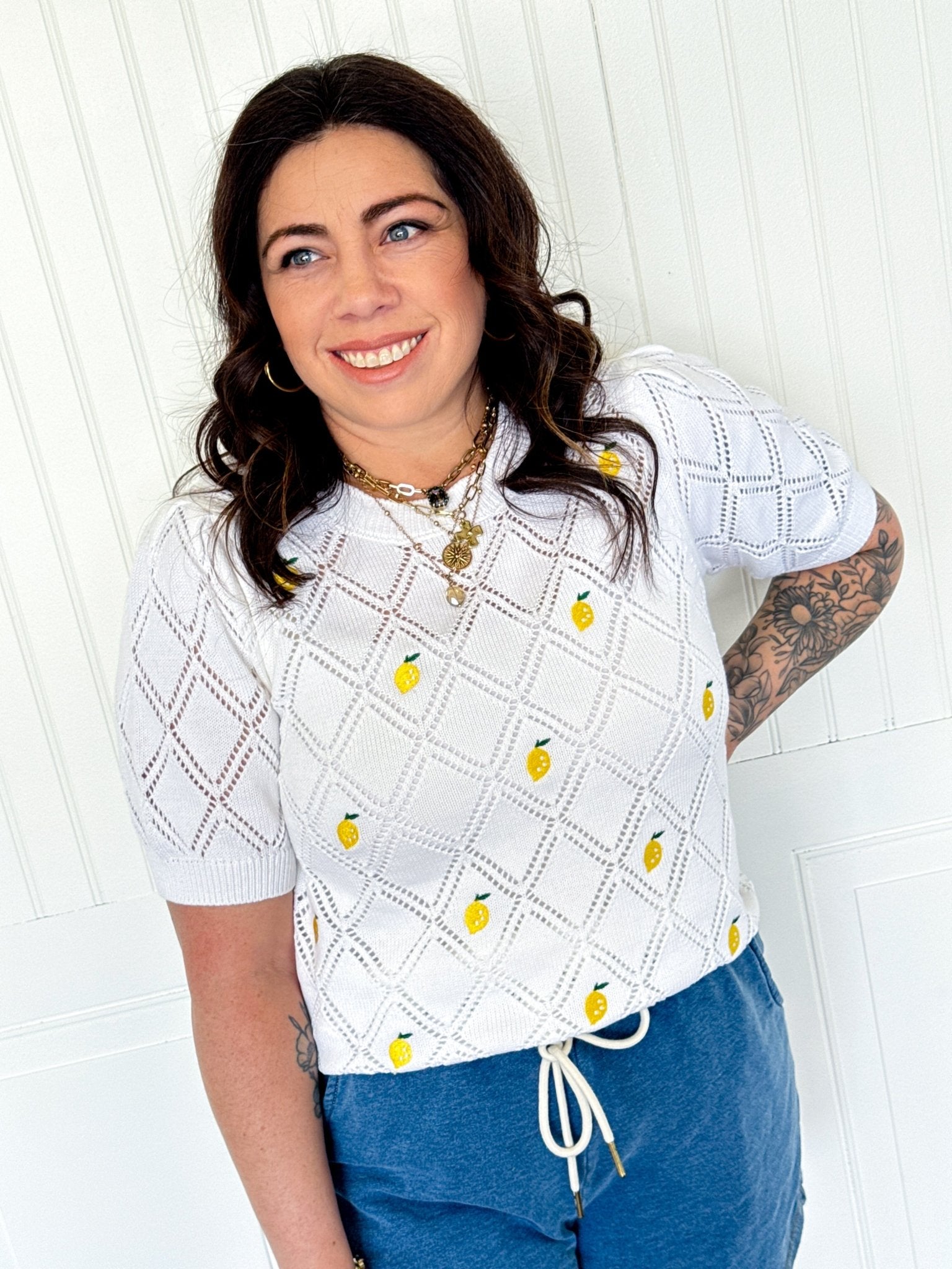 A little sunshine for your wardrobe. The Lemon Zest features a delicate pointelle knit, charming lemon embroidery, and short balloon sleeves that add a playful, feminine touch — the kind of sweater that makes every outfit feel like a moment.