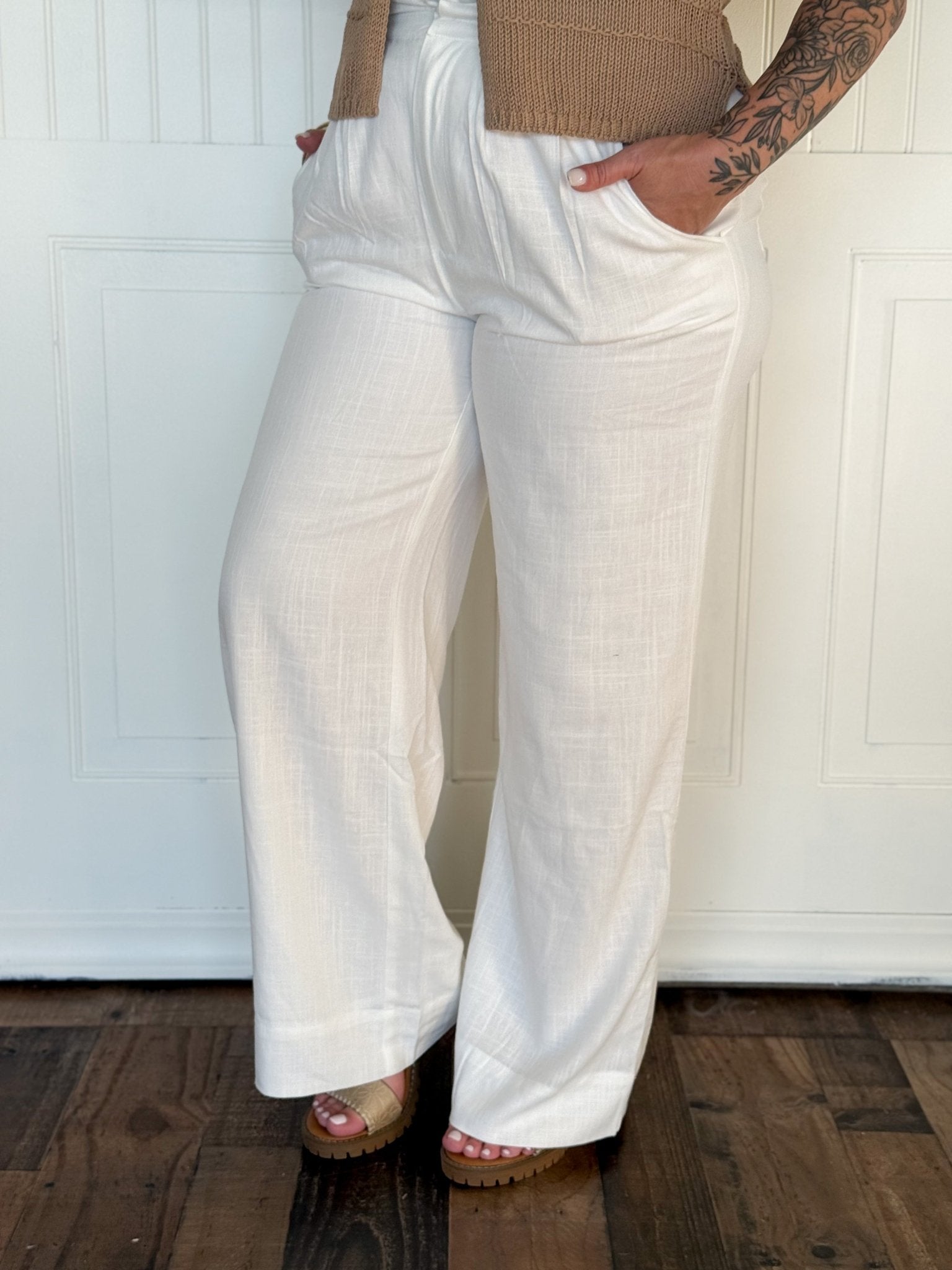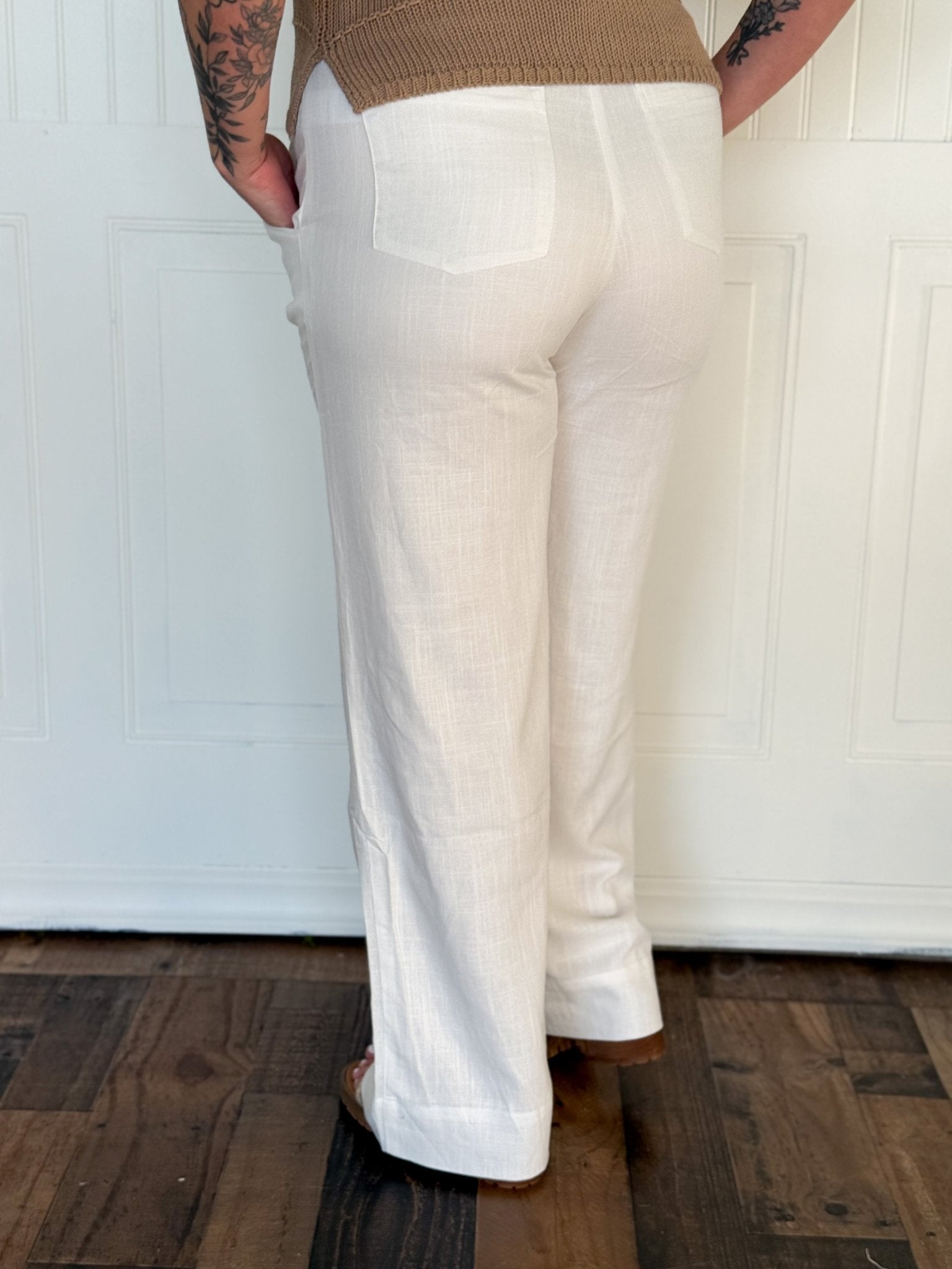 These off-white woven pants are a timeless staple designed for effortless versatility. The clean, neutral tone makes them easy to pair with anything in your wardrobe, while the simple, elevated design keeps your look polished and put together. Whether you're dressing them up or keeping things casual, these pants offer a chic foundation for countless outfits.