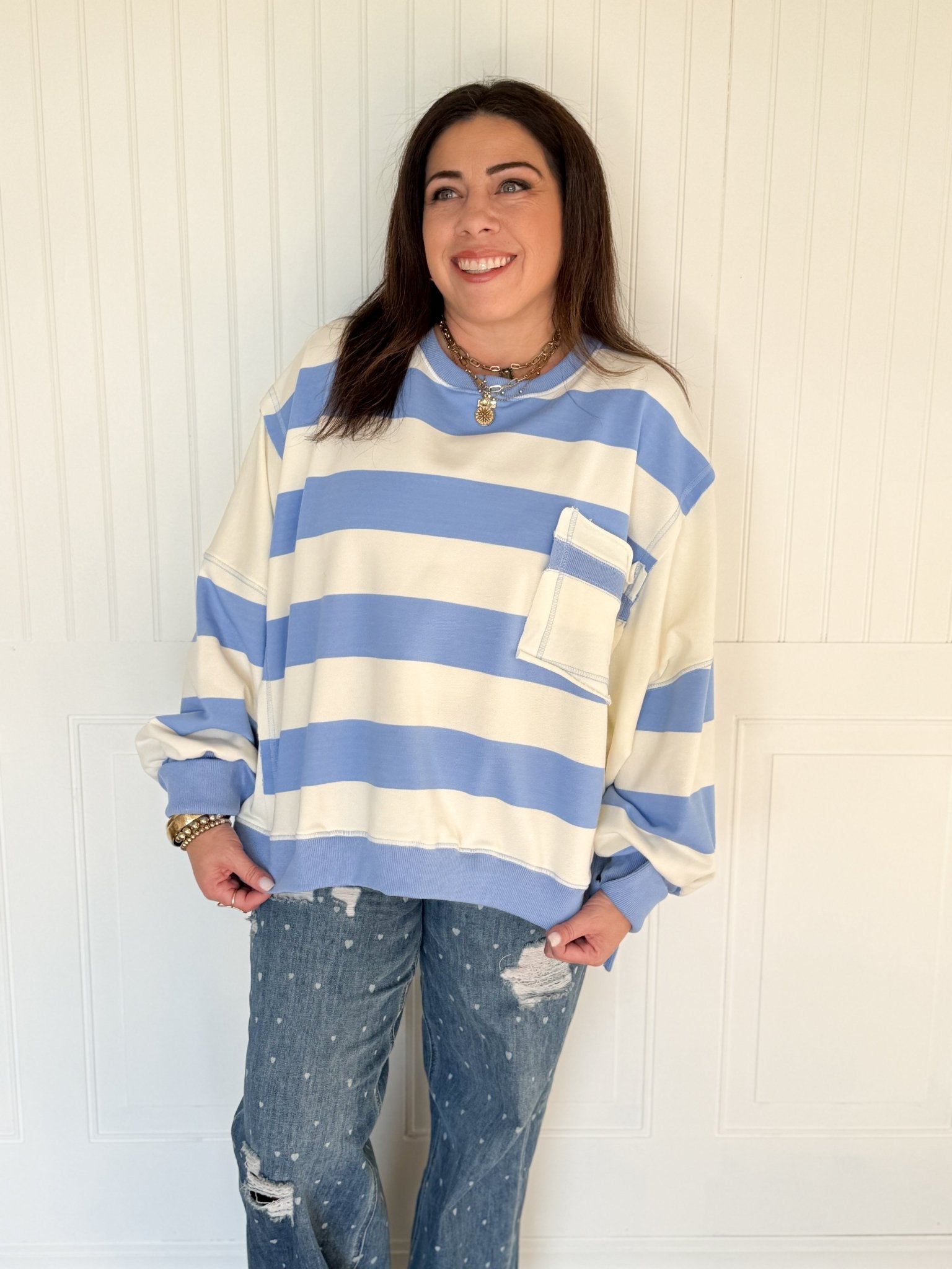 - Style with the coordinating striped French Terry pants for a relaxed matching set moment
