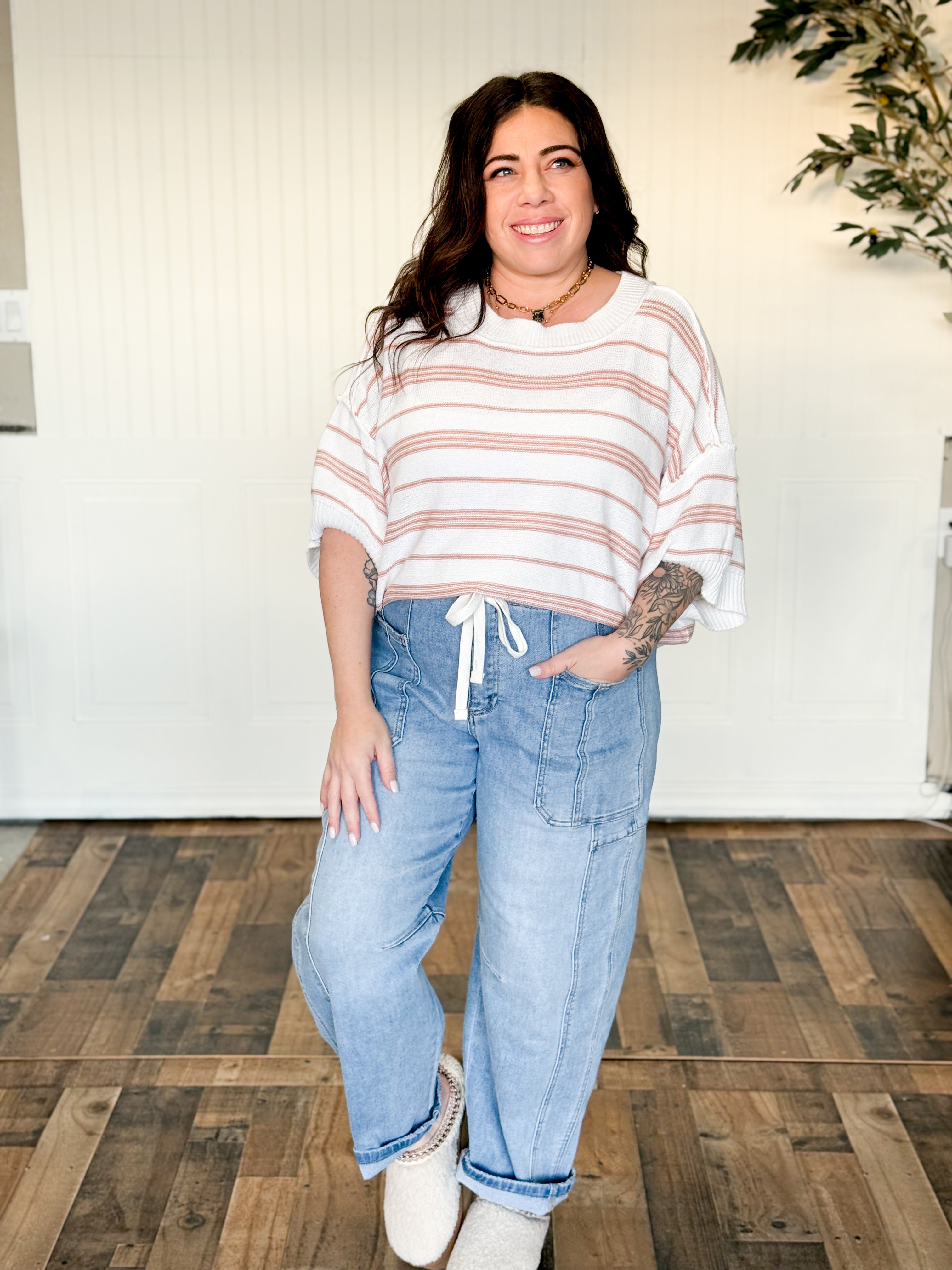 This is the sweater you toss on when you want to feel cute but zero percent restricted. It’s breezy and light thanks to that linen-cotton blend, with a relaxed boxy fit that drapes just right (aka forgiving in the best way). The drop shoulders and exposed seams give it that effortless, lived-in vibe, and the stripes make it feel fresh for spring—perfect for coffee runs, patio brunch, and those “I might end up at the beach” kind of days.