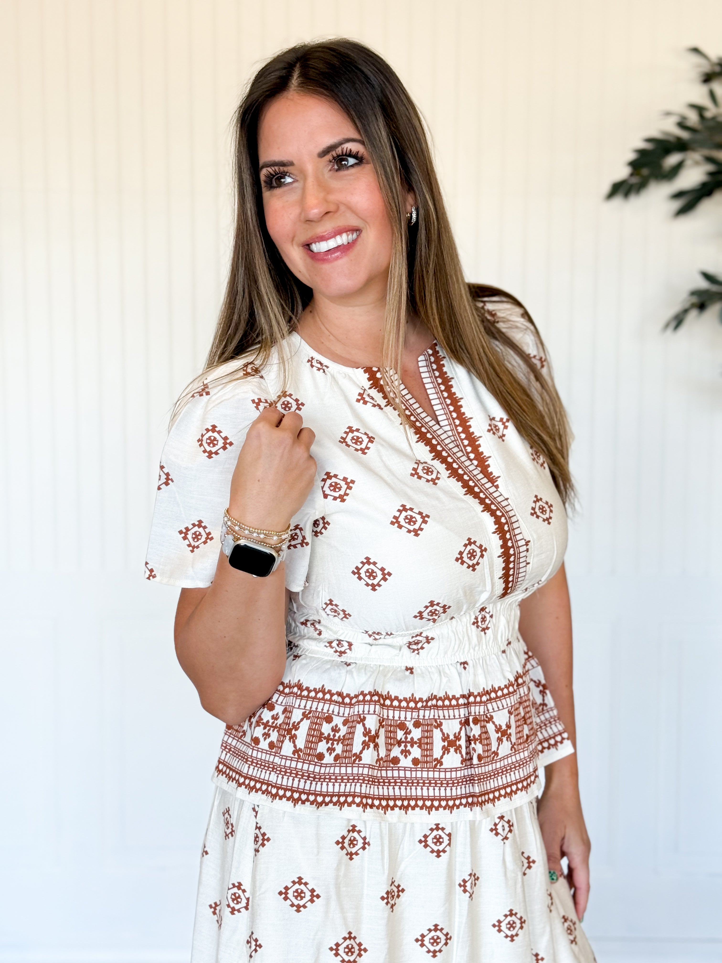 This is that “easy but looks expensive” top you’ll keep grabbing because it does the flattering part for you. The border print detail feels unique and elevated, the V-neckline is super pretty, and the defined waist gives you shape without feeling tight. It’s one of those tops that makes jeans instantly look like an outfit.